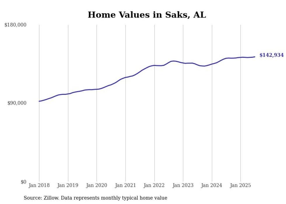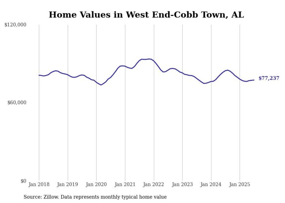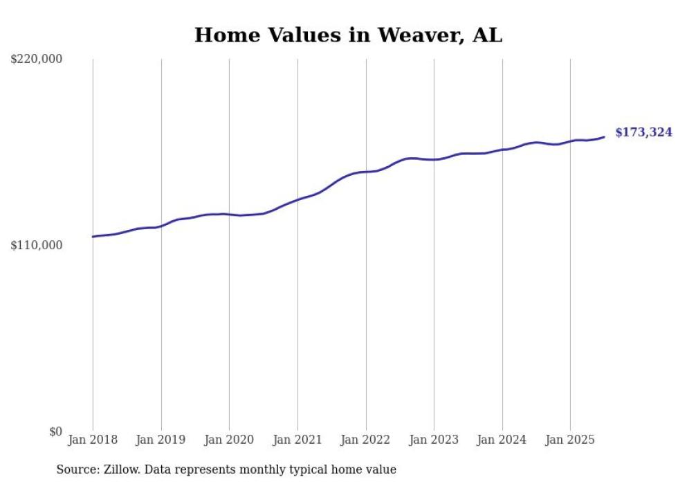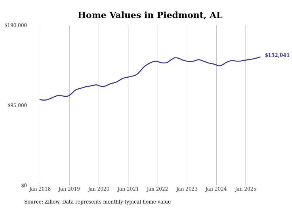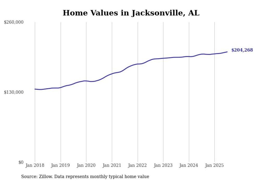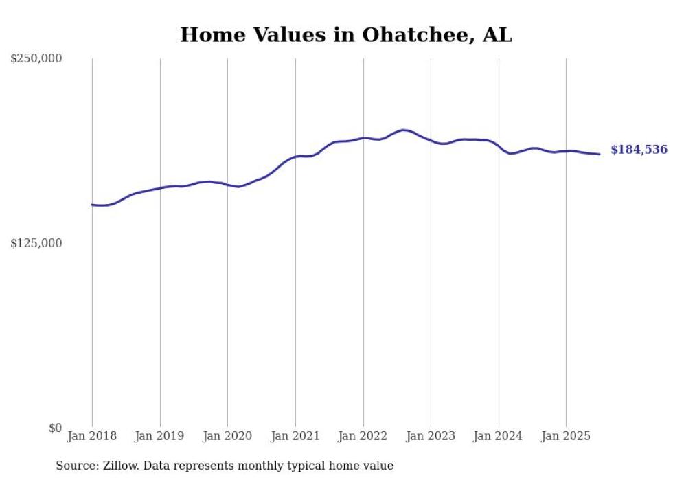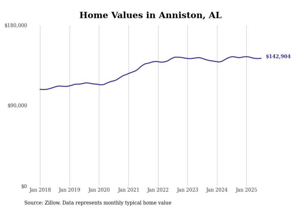 Stacker compiled a list of cities with the most expensive homes in the Anniston metro area using data from Zillow. Charts show the monthly typical home value since January 2018. All 9 cities and towns with data available were included in the list.