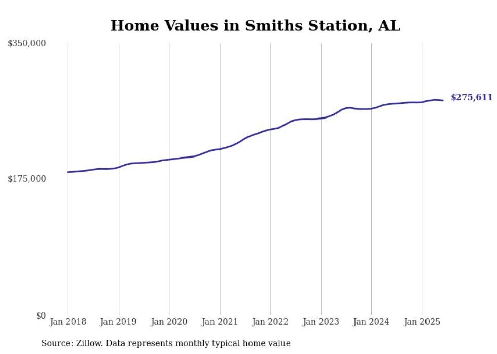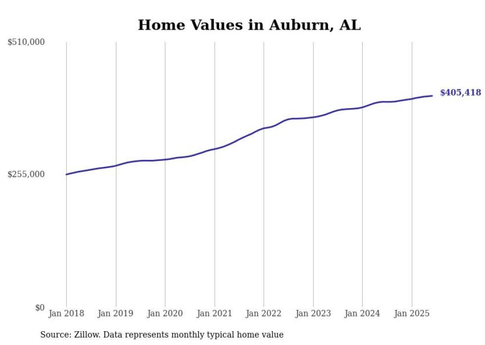 Stacker compiled a list of cities with the most expensive homes in the Auburn-Opelika, AL metro area using data from Zillow. Charts show the monthly typical home value since January 2018.