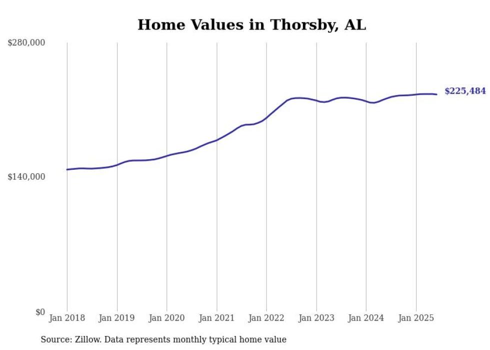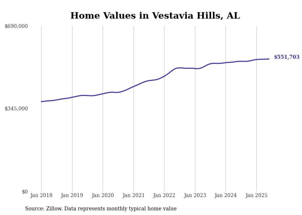 Stacker compiled a list of cities with the most expensive homes in the Birmingham-Hoover, AL metro area using data from Zillow. Charts show the monthly typical home value since January 2018.