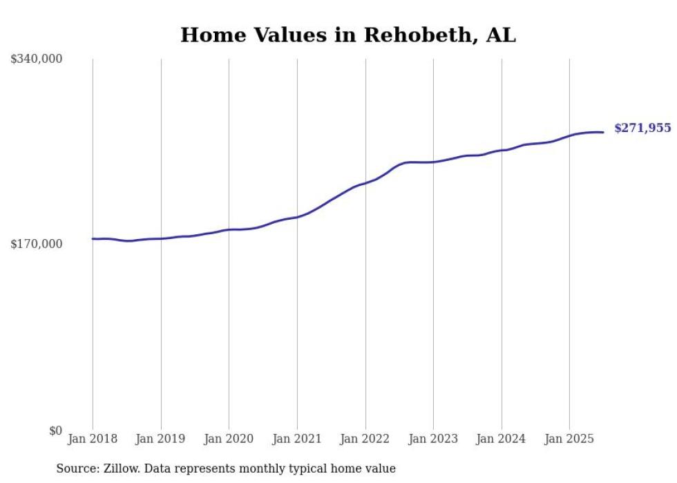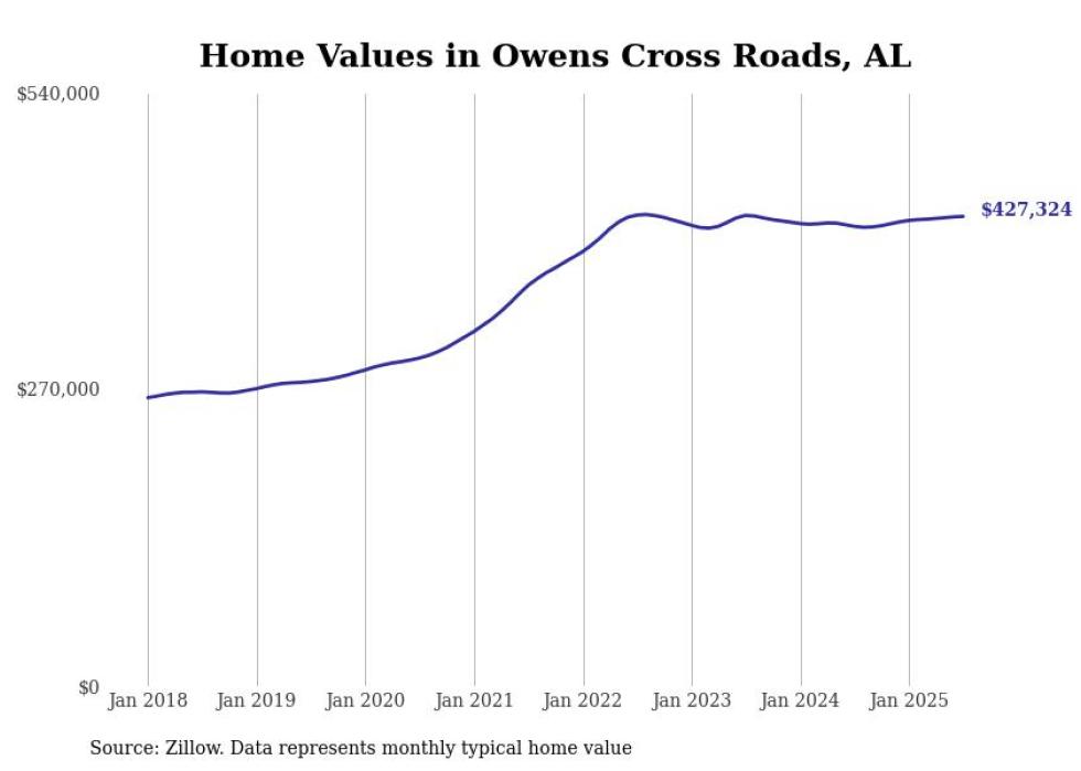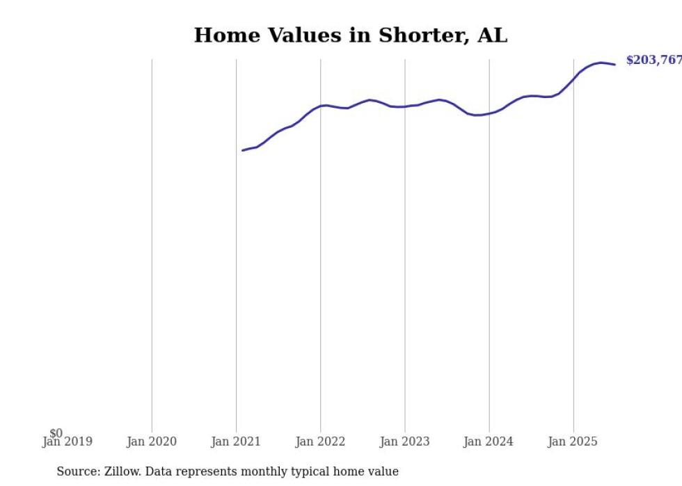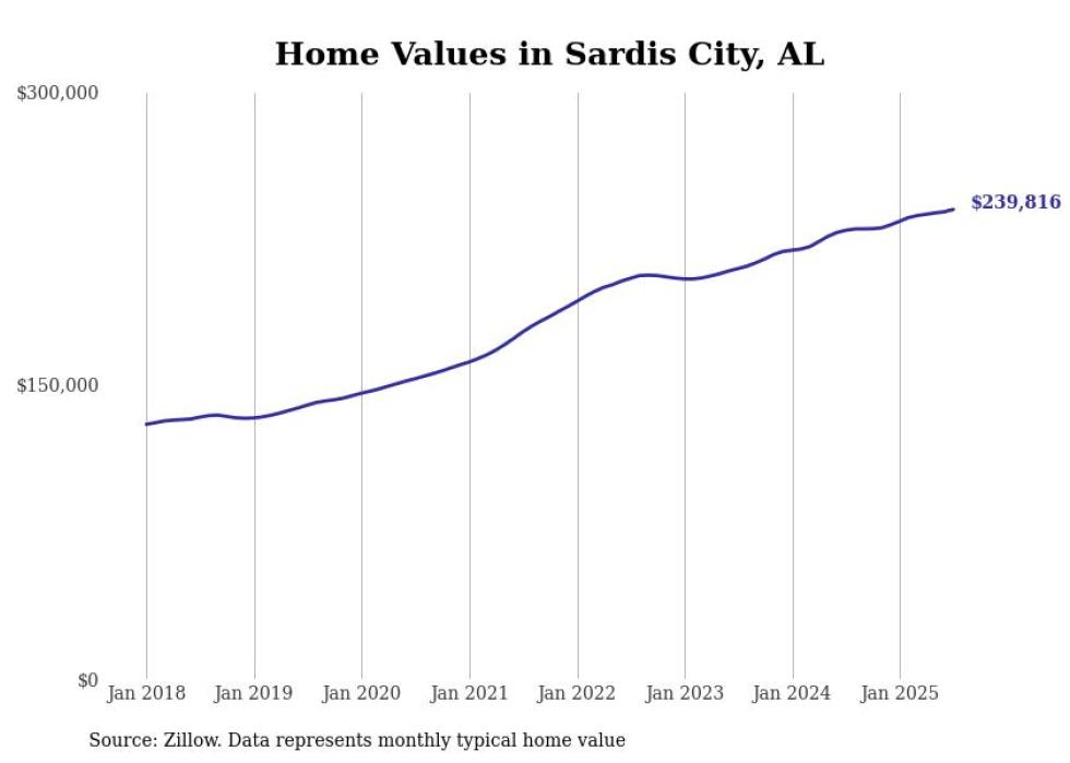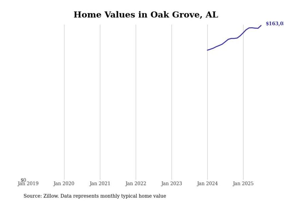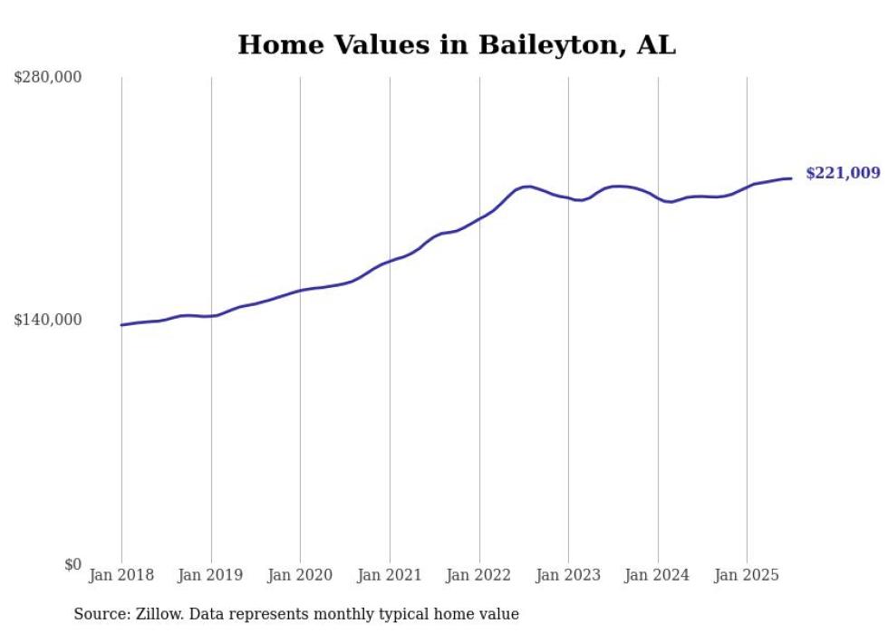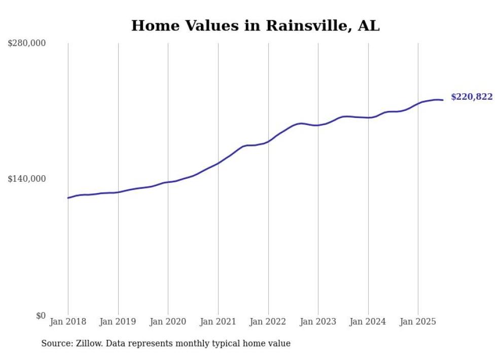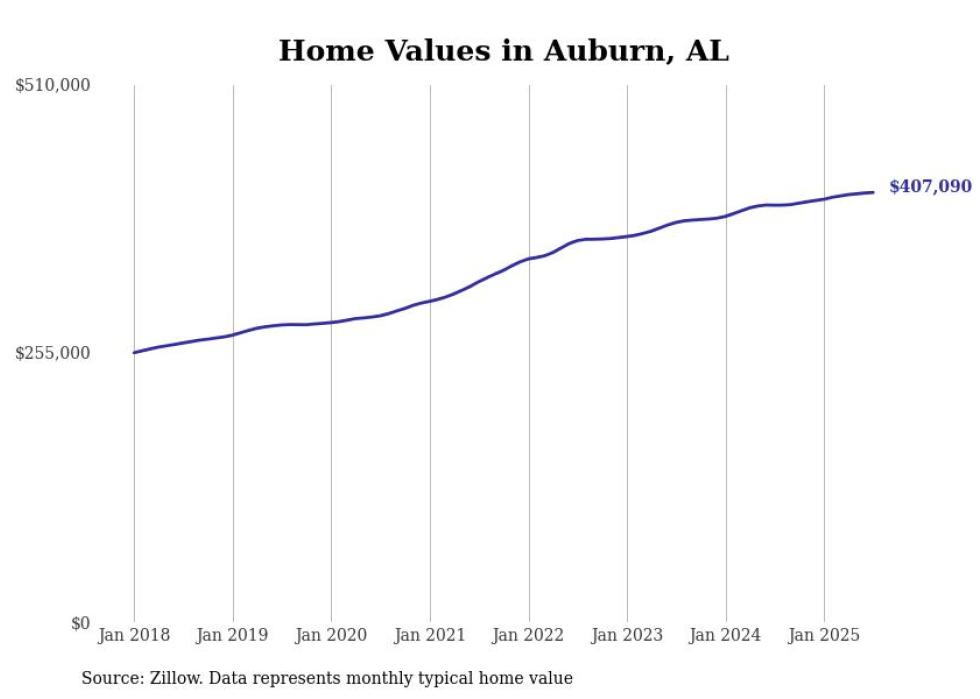 Stacker compiled a list of cities with the fastest-growing home prices in Alabama using data from Zillow. Cities are ranked by the dollar change in the Zillow Home Values Index for all homes from the 12 months ending July 2025. The charts in this story were created automatically using Matplotlib. Data was available for 50 cities and towns in Alabama.