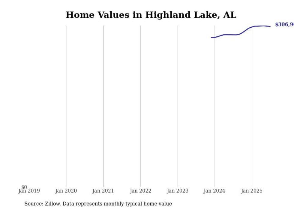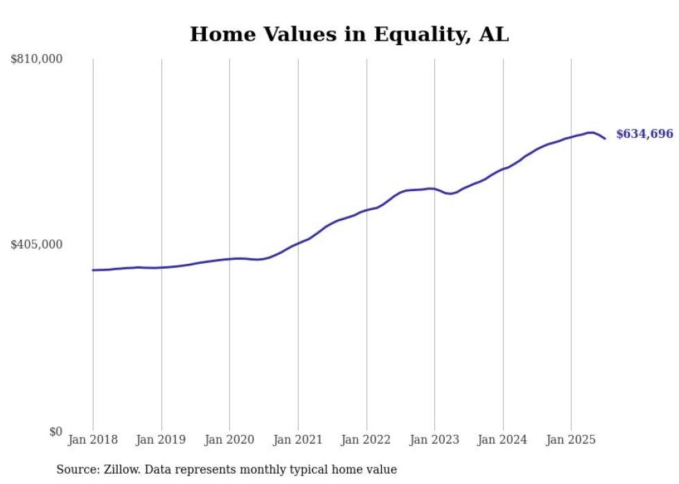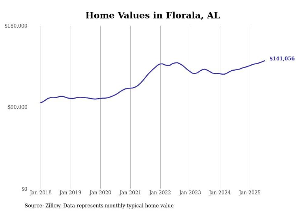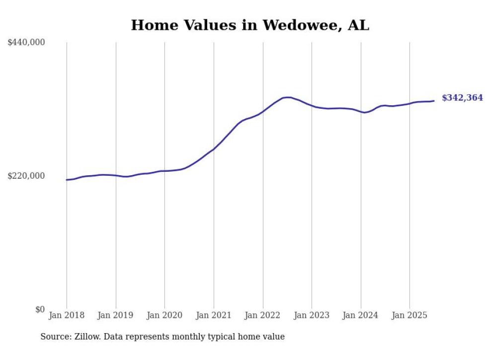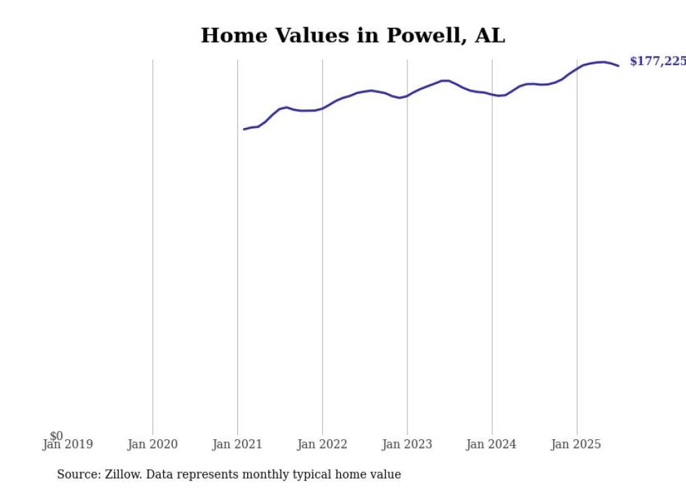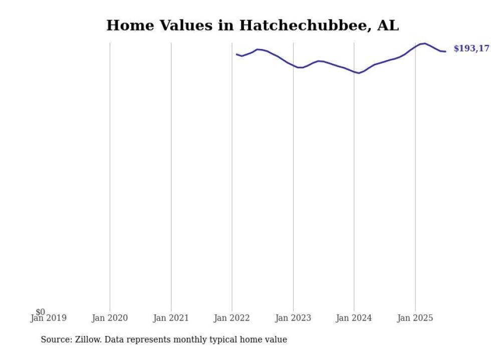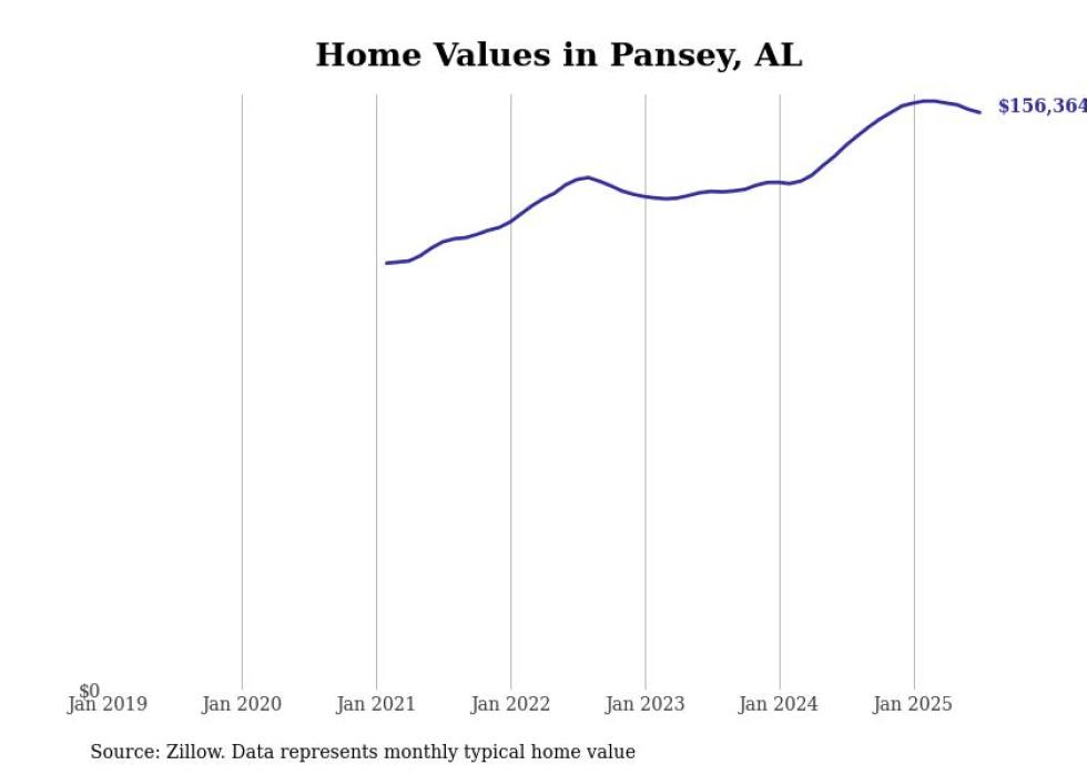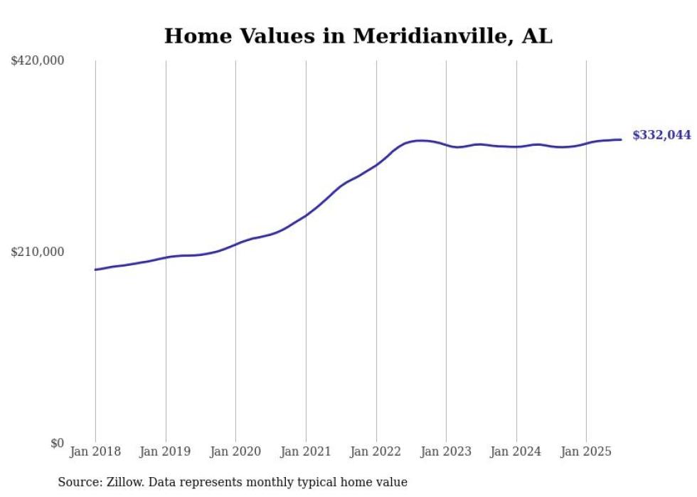Stacker compiled a list of cities with the fastest-growing home prices in Alabama using data from Zillow. Cities are ranked by the dollar change in the Zillow Home Values Index for all homes from the 12 months ending July 2025. The charts in this story were created automatically using Matplotlib. Data was available for 50 cities and towns in Alabama.