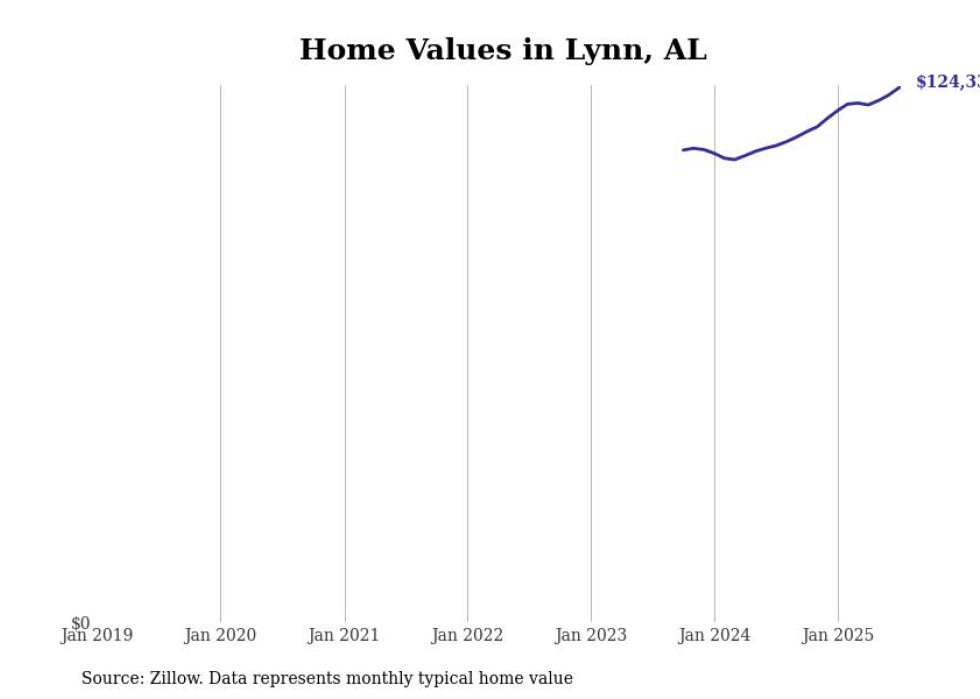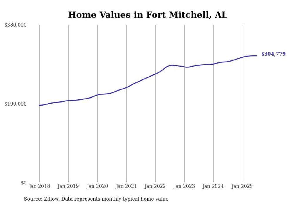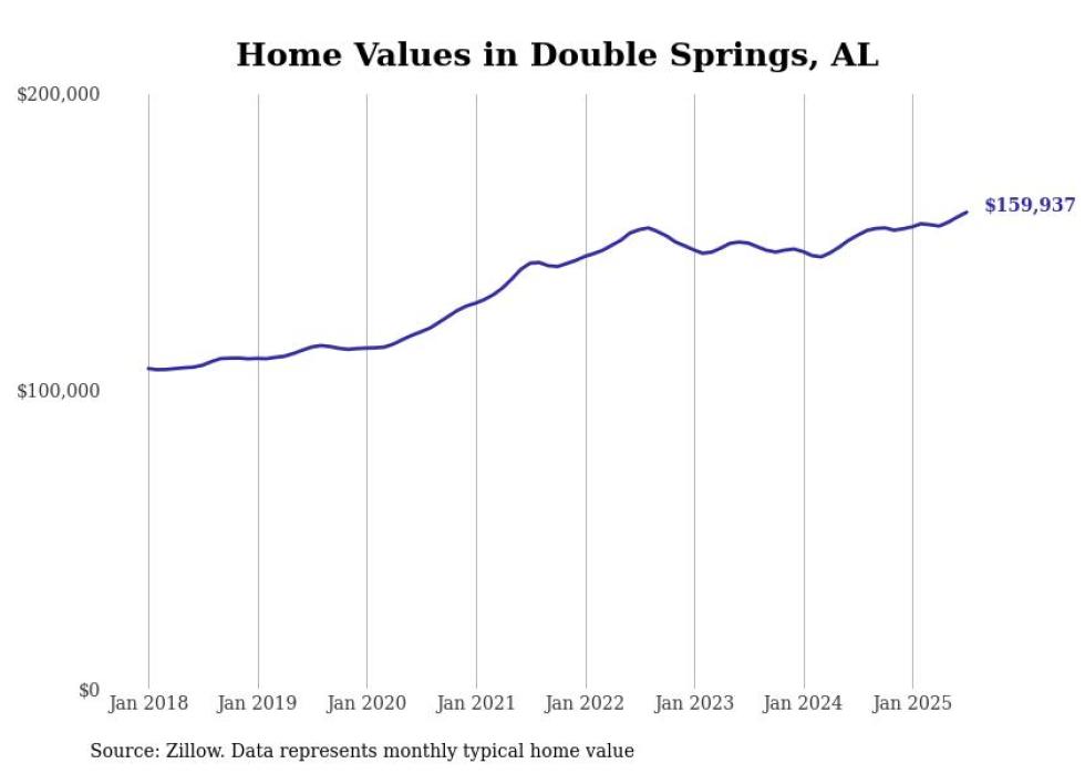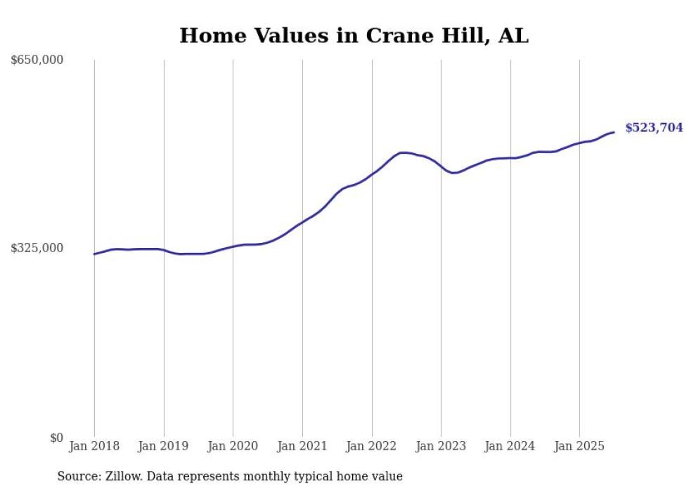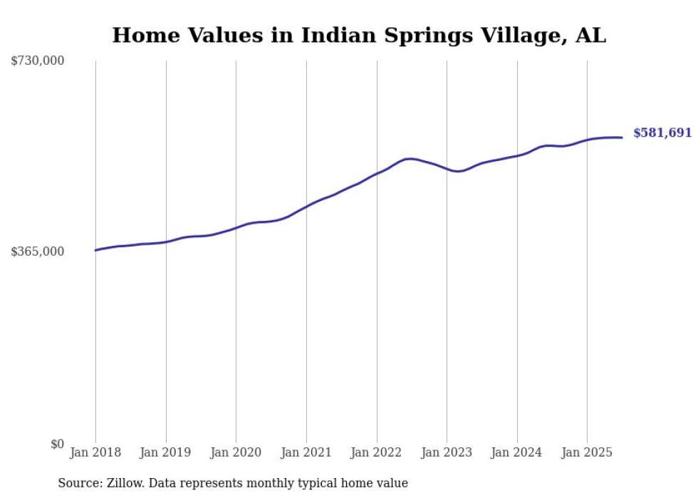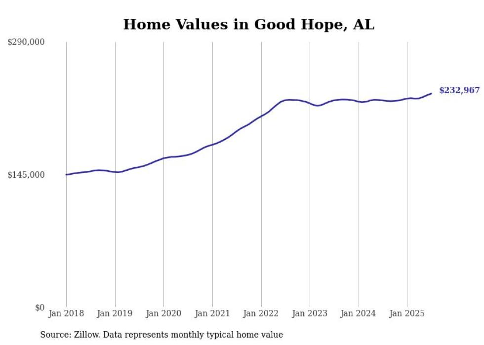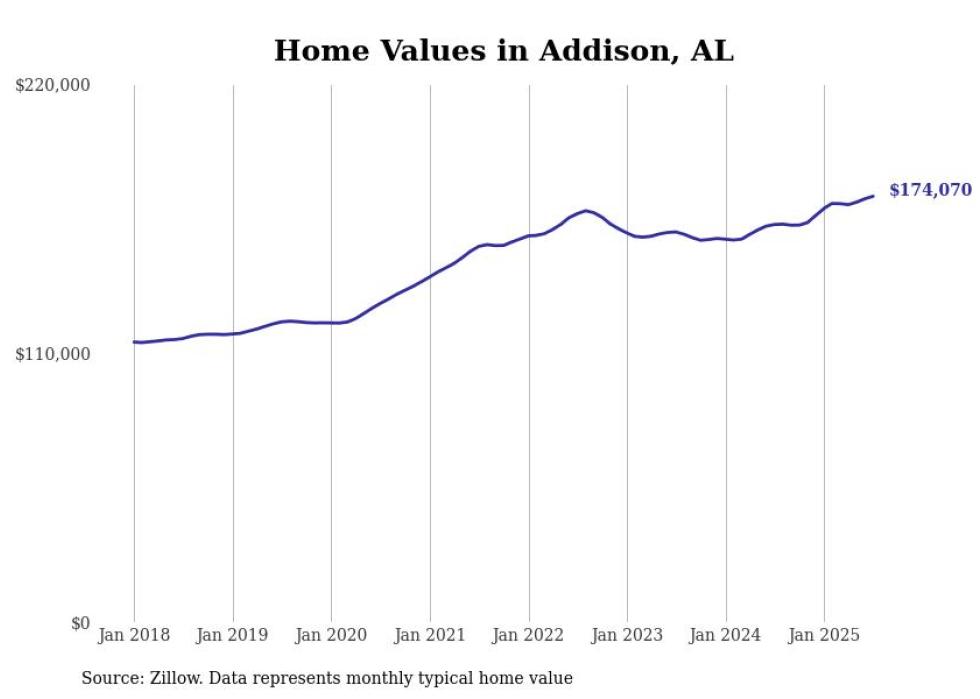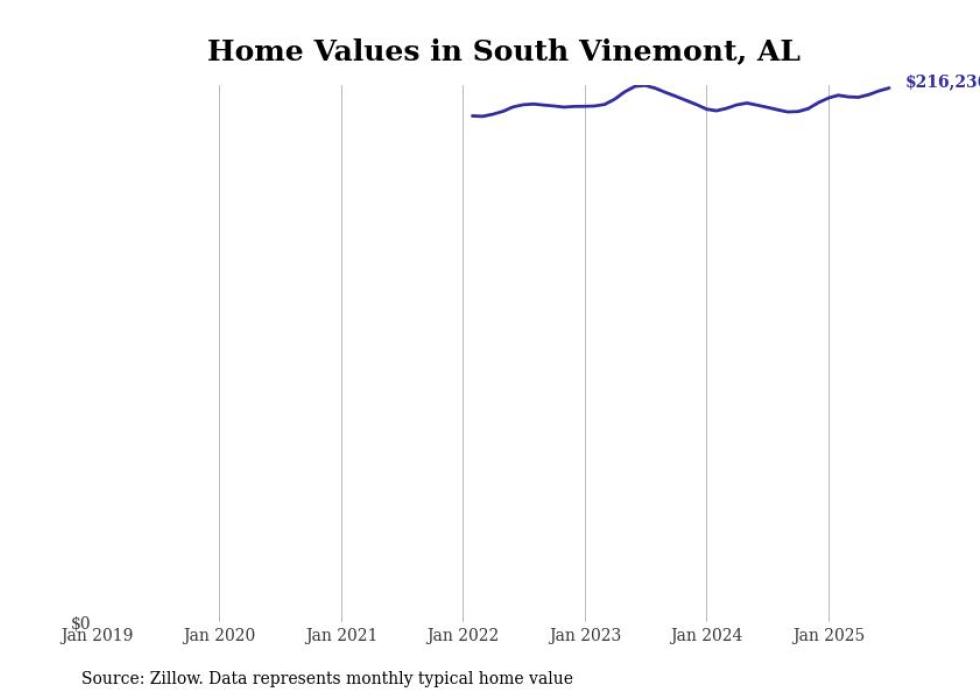 Stacker compiled a list of cities with the fastest-growing home prices in Alabama using data from Zillow. Cities are ranked by the dollar change in the Zillow Home Values Index for all homes from the 12 months ending July 2025. The charts in this story were created automatically using Matplotlib. Data was available for 50 cities and towns in Alabama.