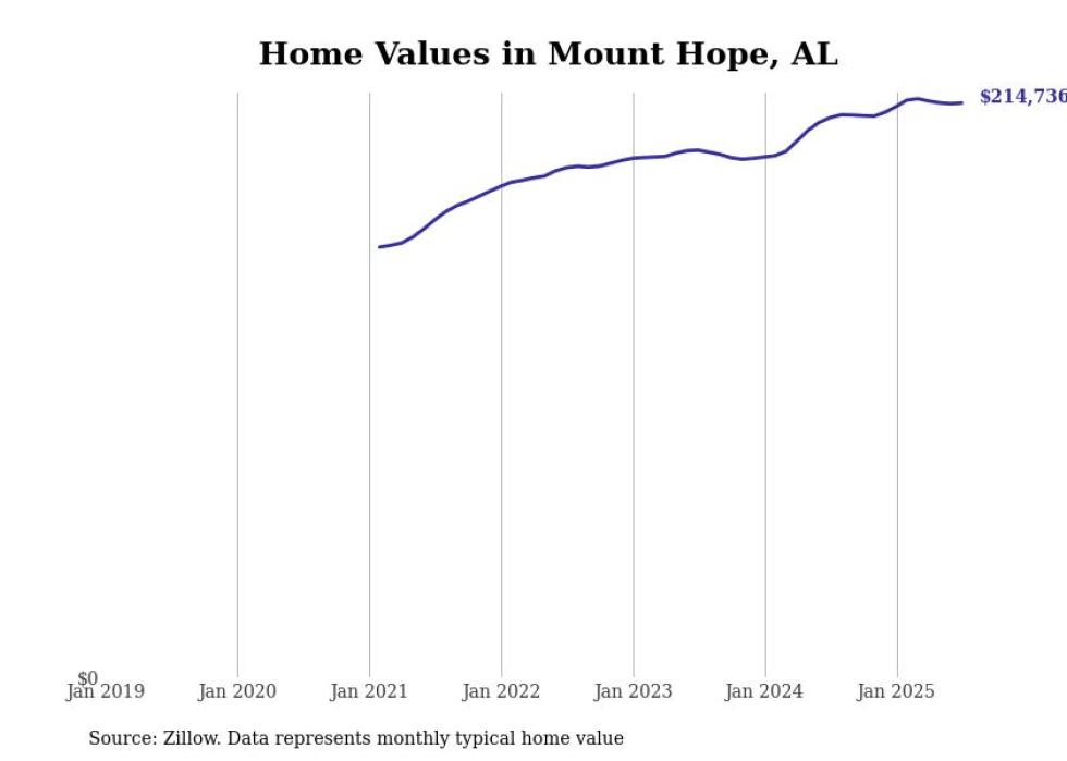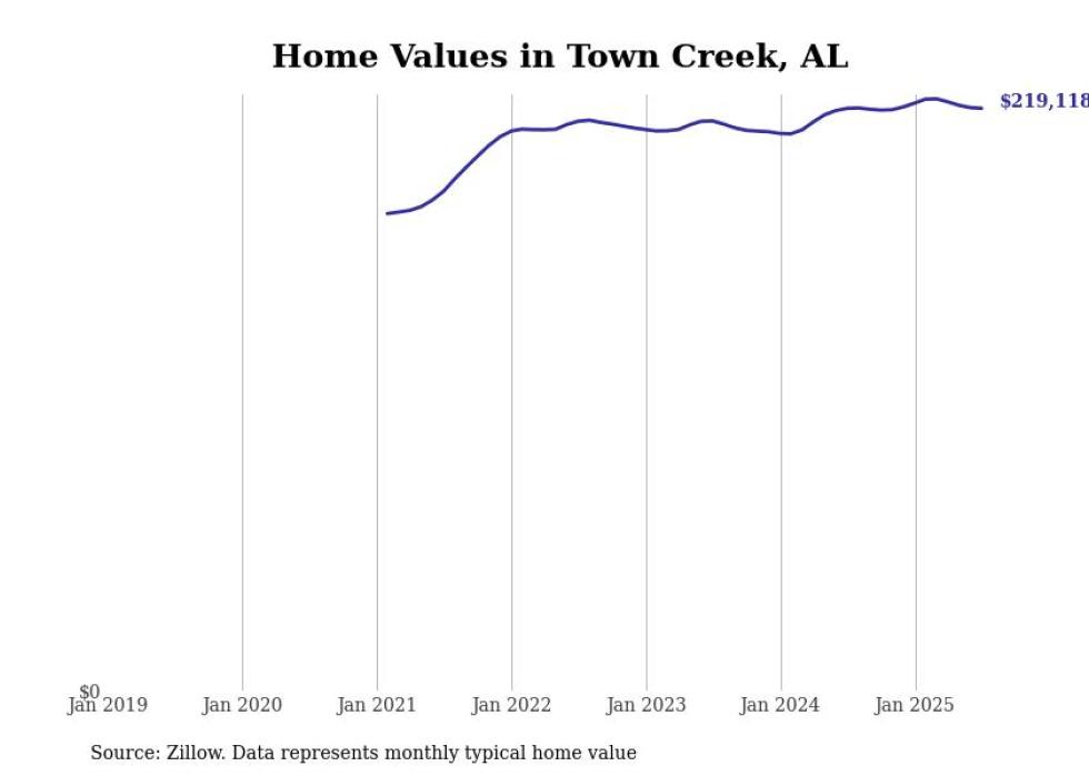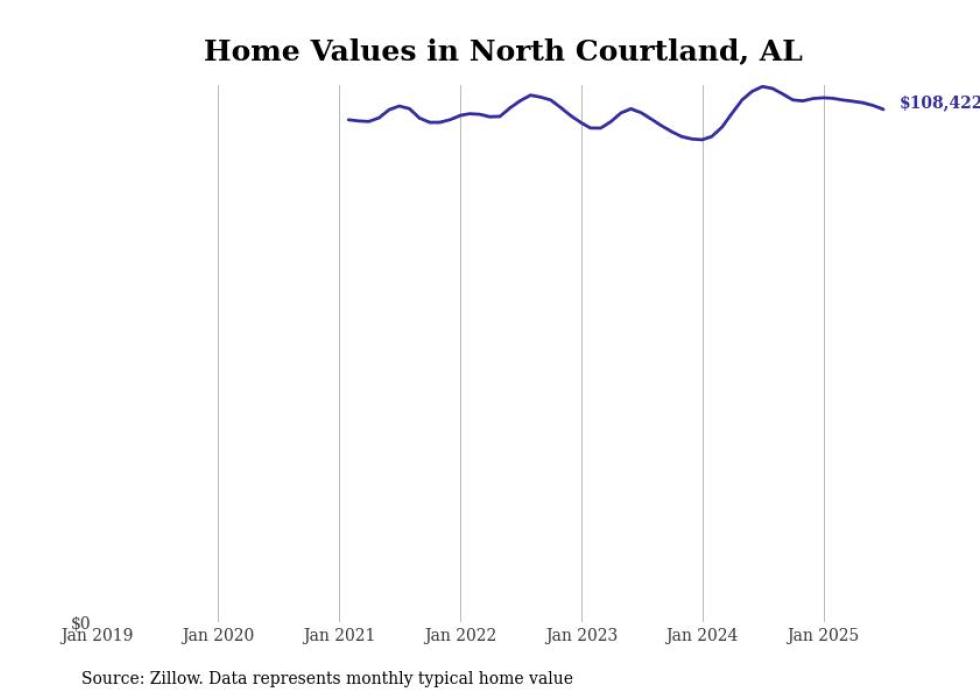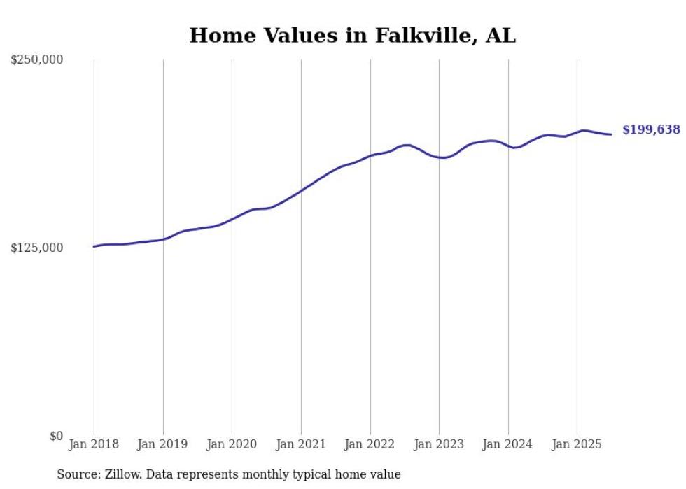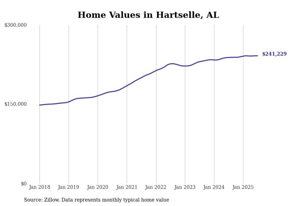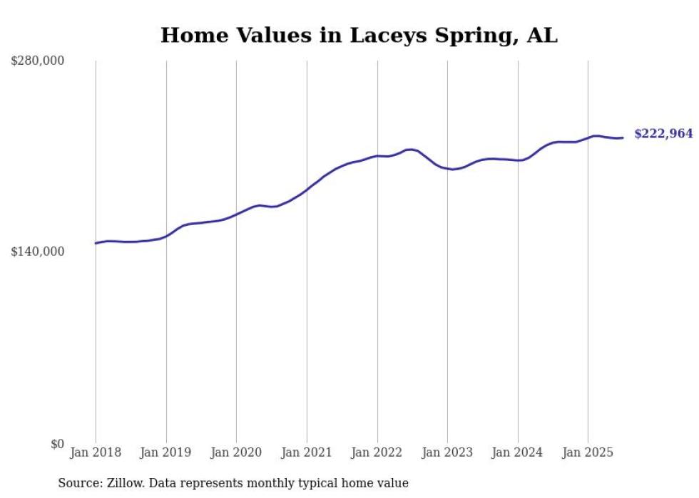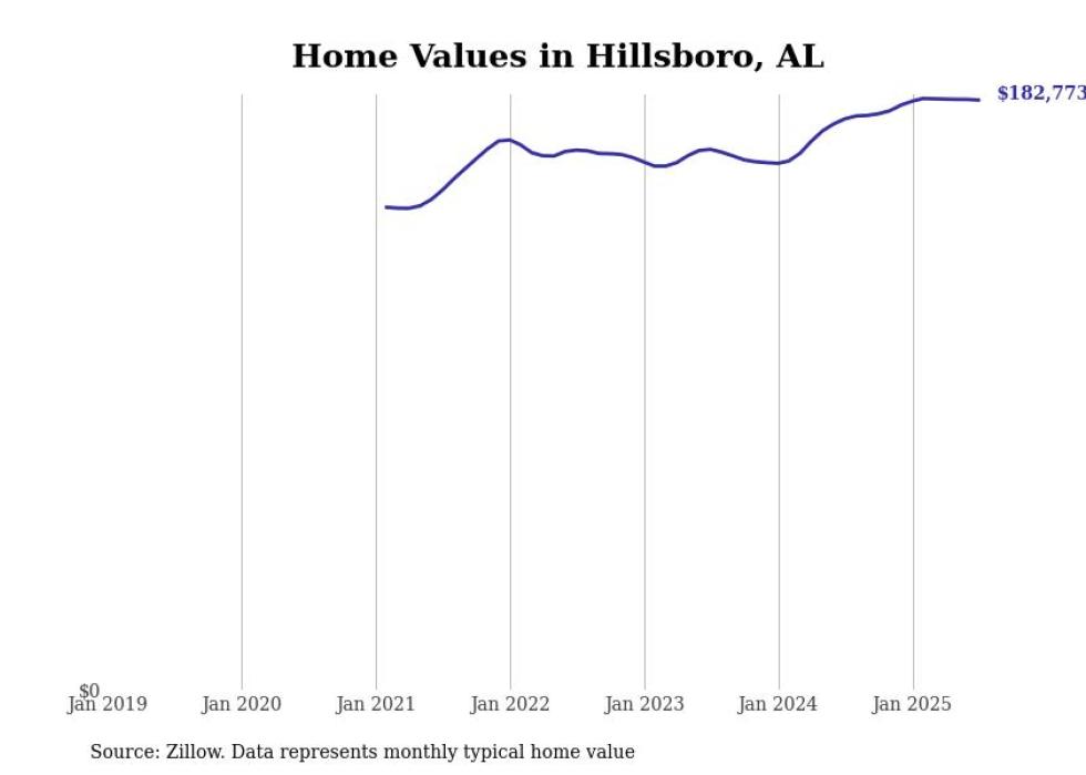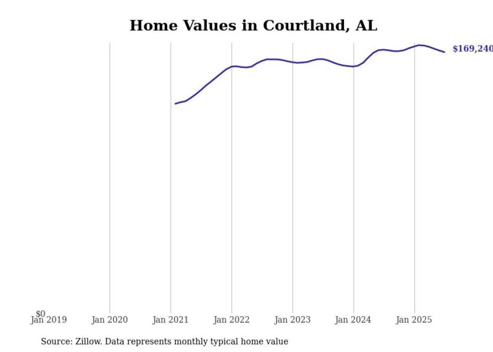 Stacker compiled a list of cities with the most expensive homes in the Decatur metro area using data from Zillow. Charts show the monthly typical home value since January 2018. All 14 cities and towns with data available were included in the list.