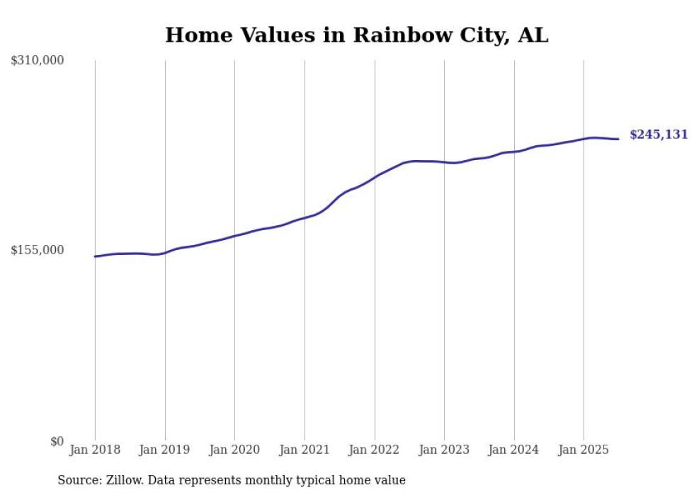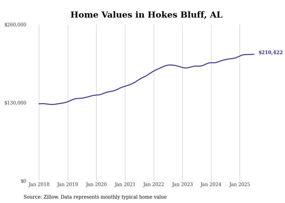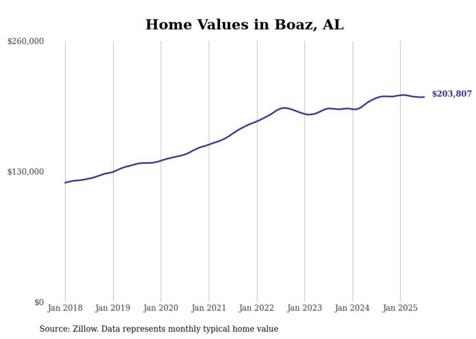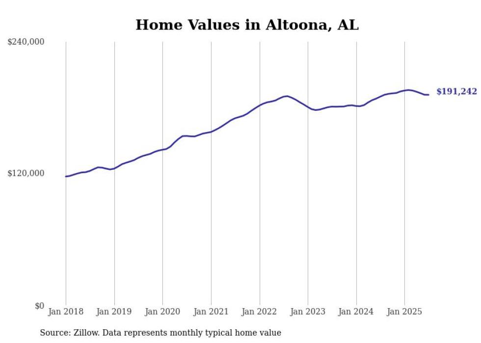 Stacker compiled a list of cities with the most expensive homes in the Gadsden metro area using data from Zillow. Charts show the monthly typical home value since January 2018. All 10 cities and towns with data available were included in the list.