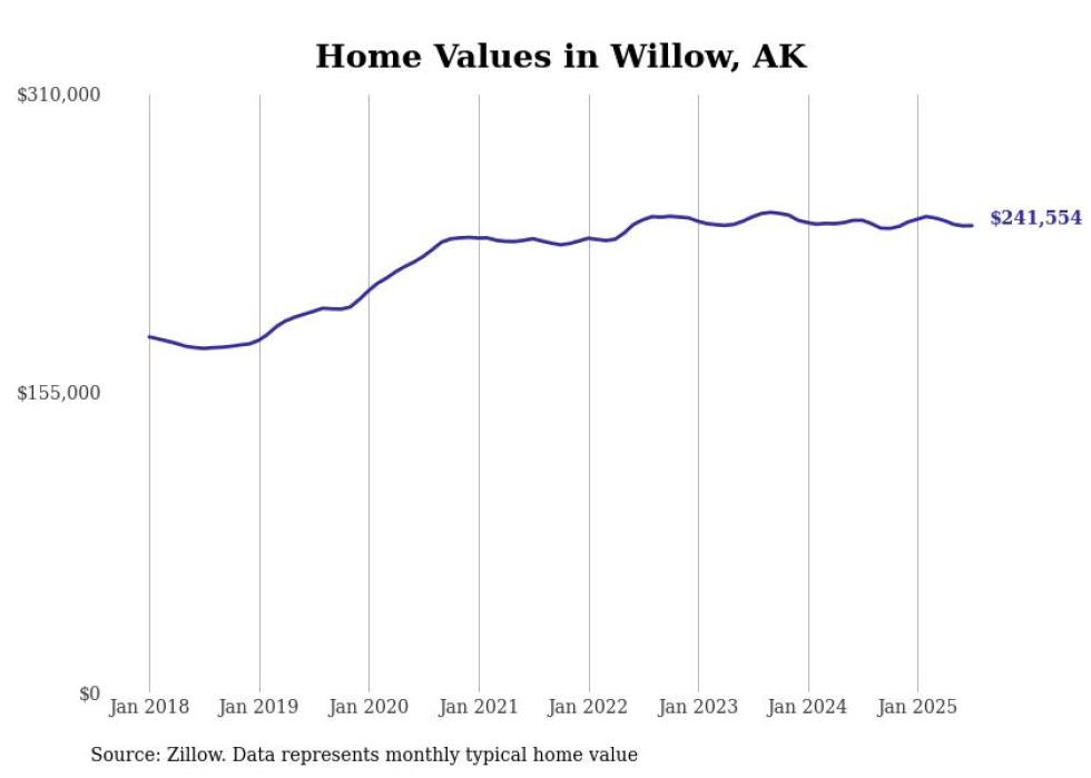 Stacker compiled a list of cities with the most expensive homes in the Anchorage metro area using data from Zillow. Charts show the monthly typical home value since January 2018. All 9 cities and towns with data available were included in the list.