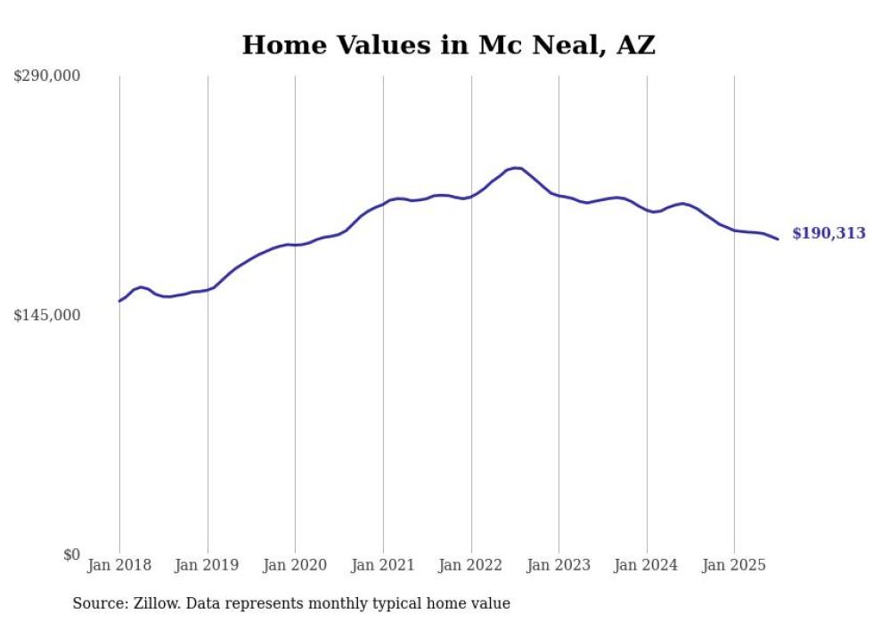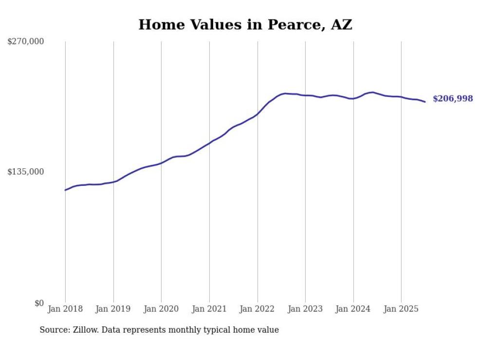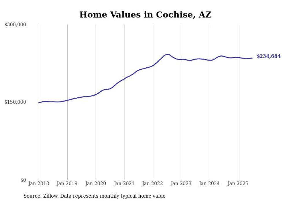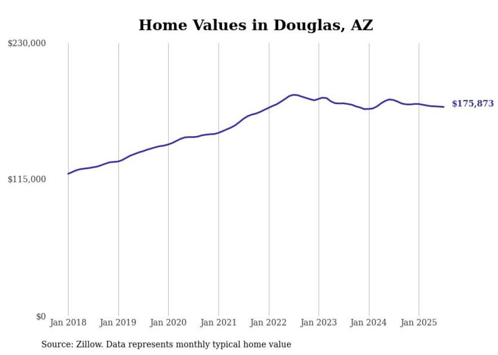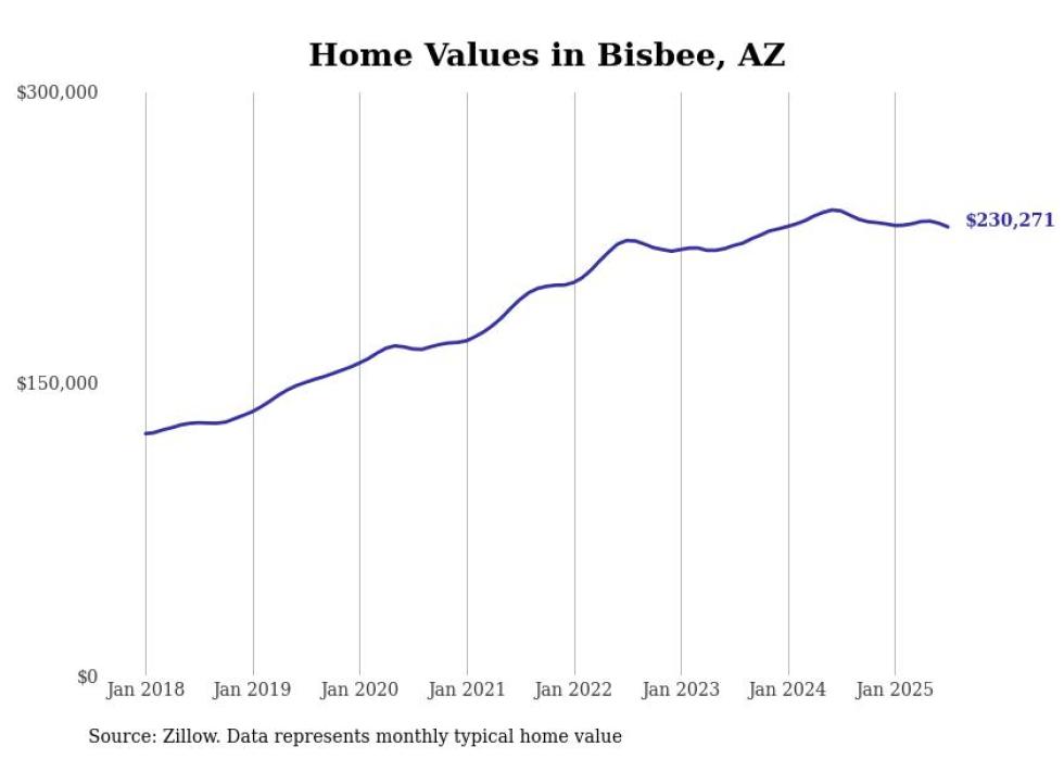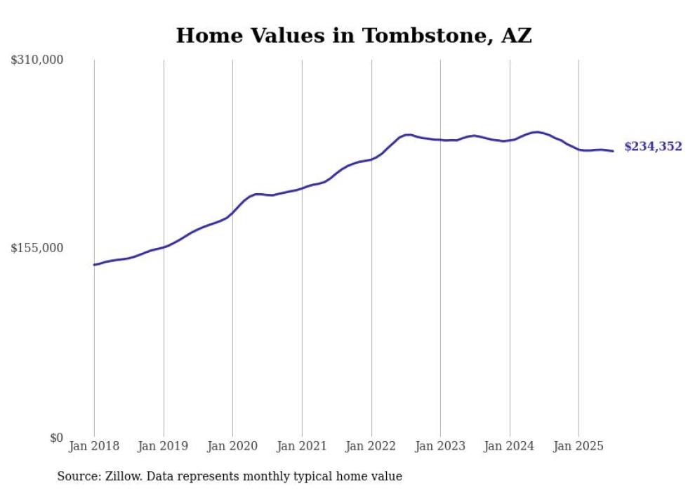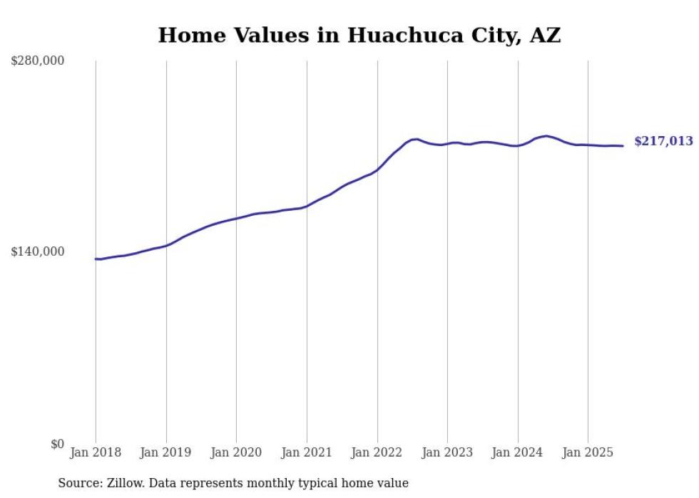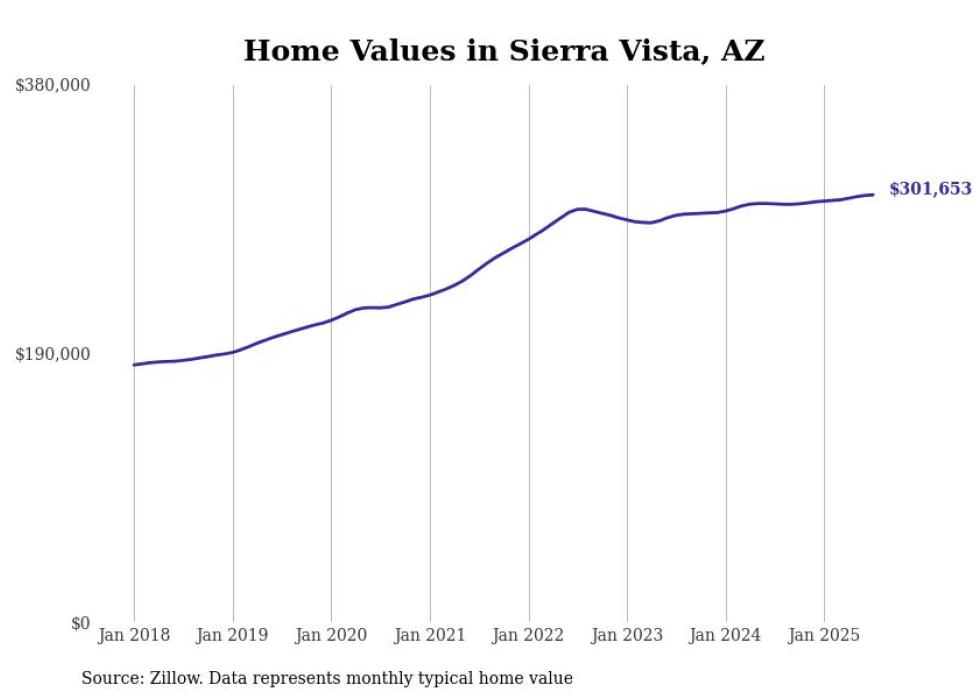 Stacker compiled a list of cities with the most expensive homes in the Sierra Vista metro area using data from Zillow. Charts show the monthly typical home value since January 2018. All 12 cities and towns with data available were included in the list.