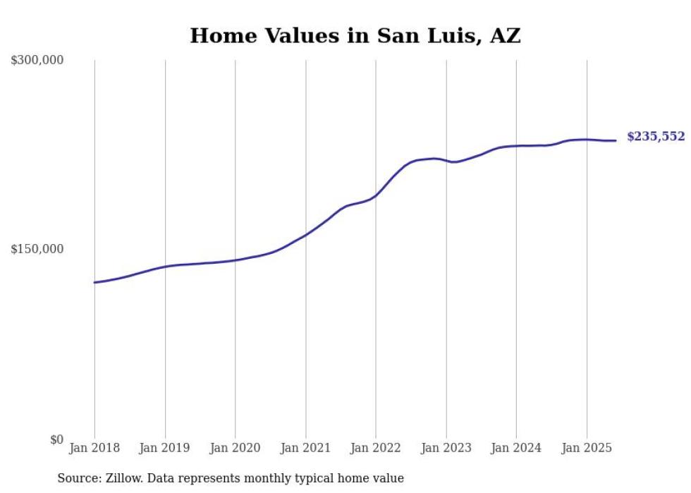 Stacker compiled a list of cities with the most expensive homes in the Yuma, AZ metro area using data from Zillow. Charts show the monthly typical home value since January 2018.