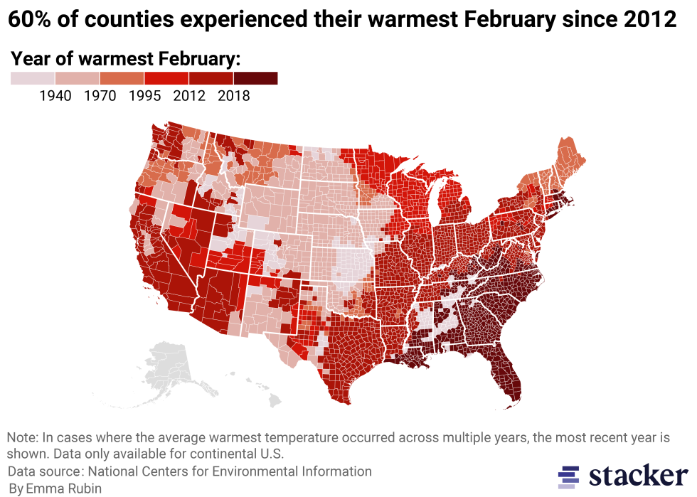 While individual years can always move against trends, February weather is trending warmer due to climate change, increasing by 2.89 degrees per century.
