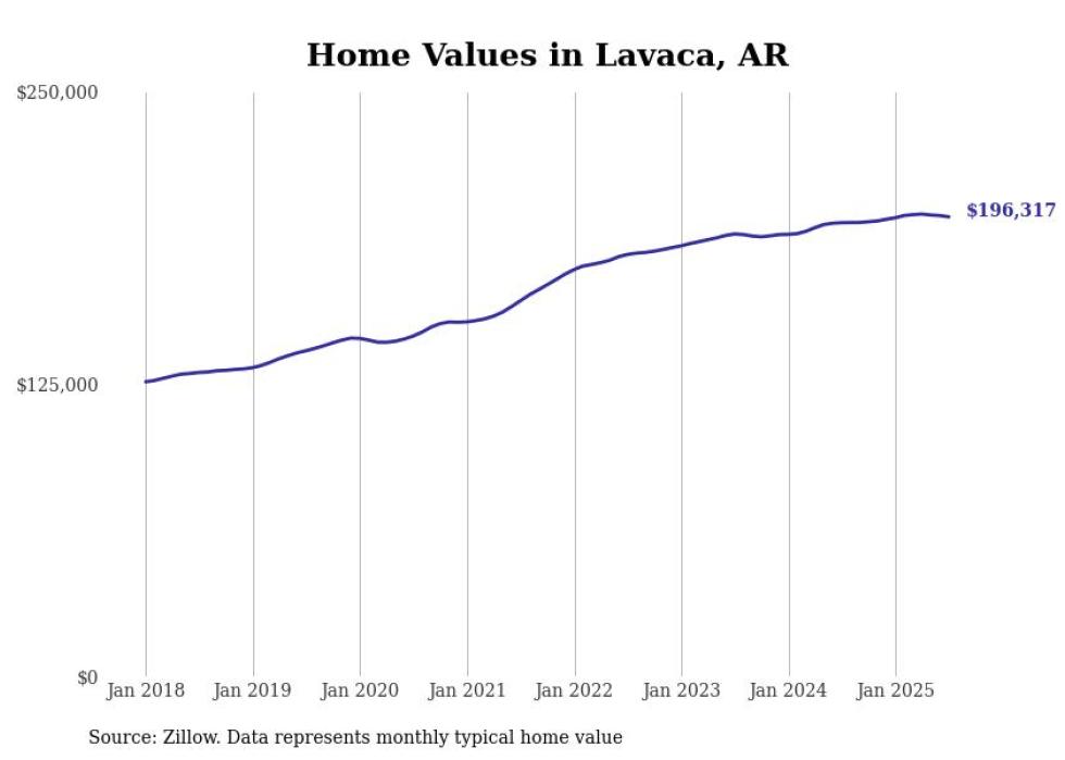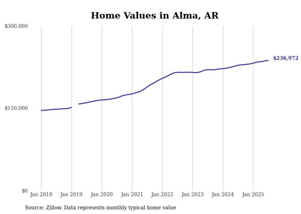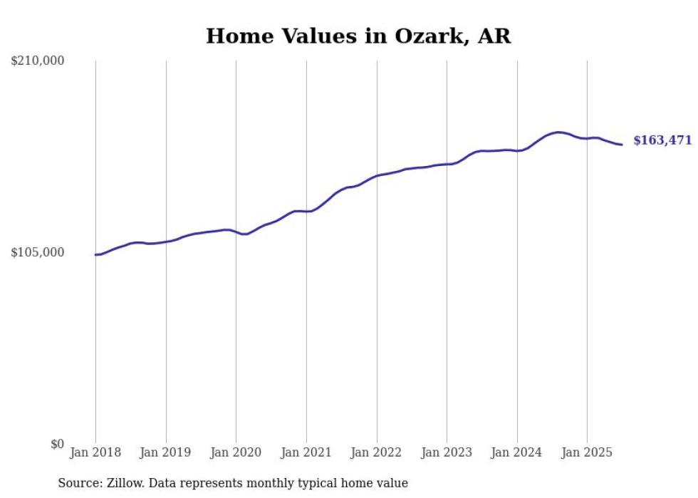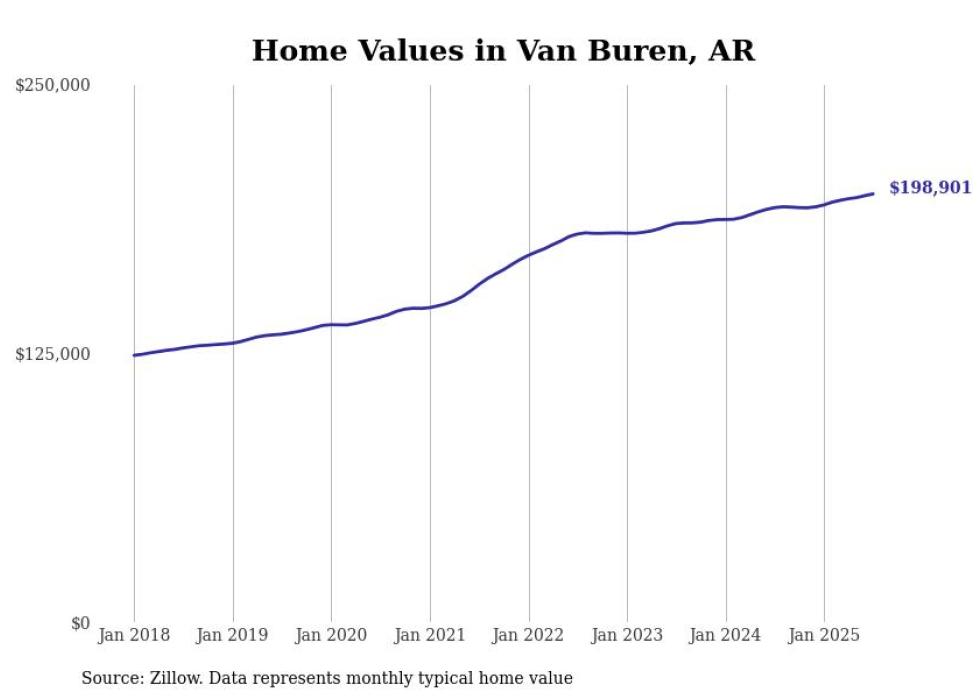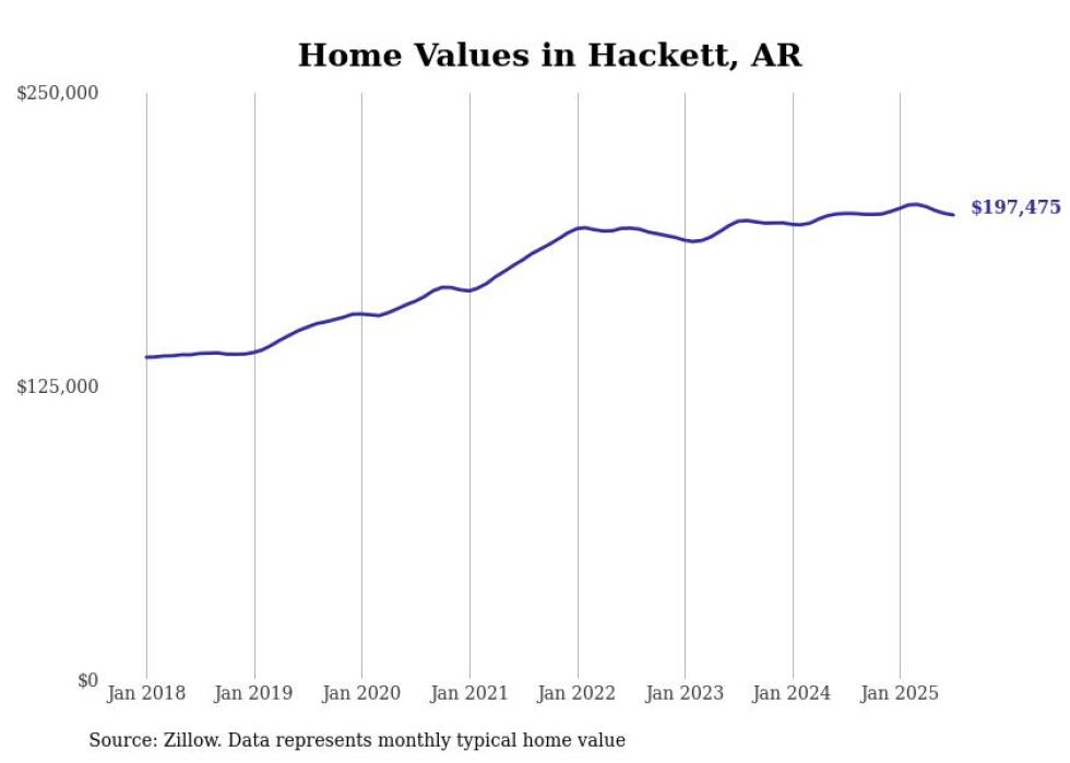 Stacker compiled a list of cities with the most expensive homes in the Fort Smith metro area using data from Zillow. Charts show the monthly typical home value since January 2018. All 24 cities and towns with data available were included in the list.