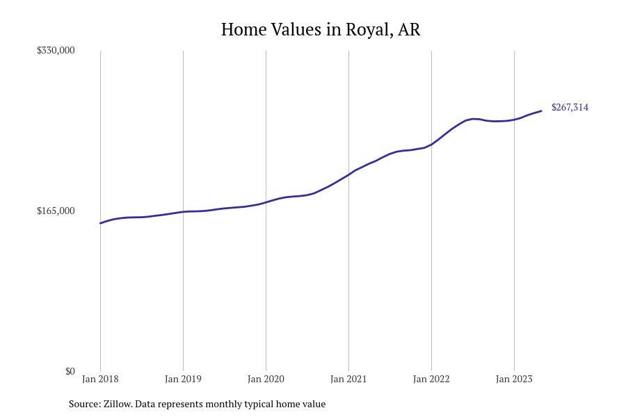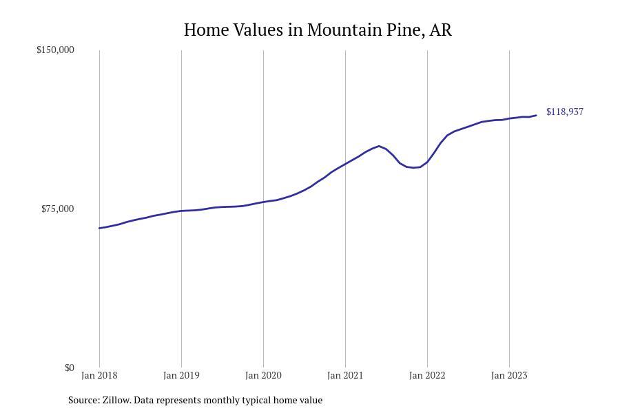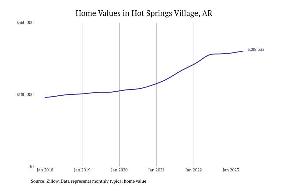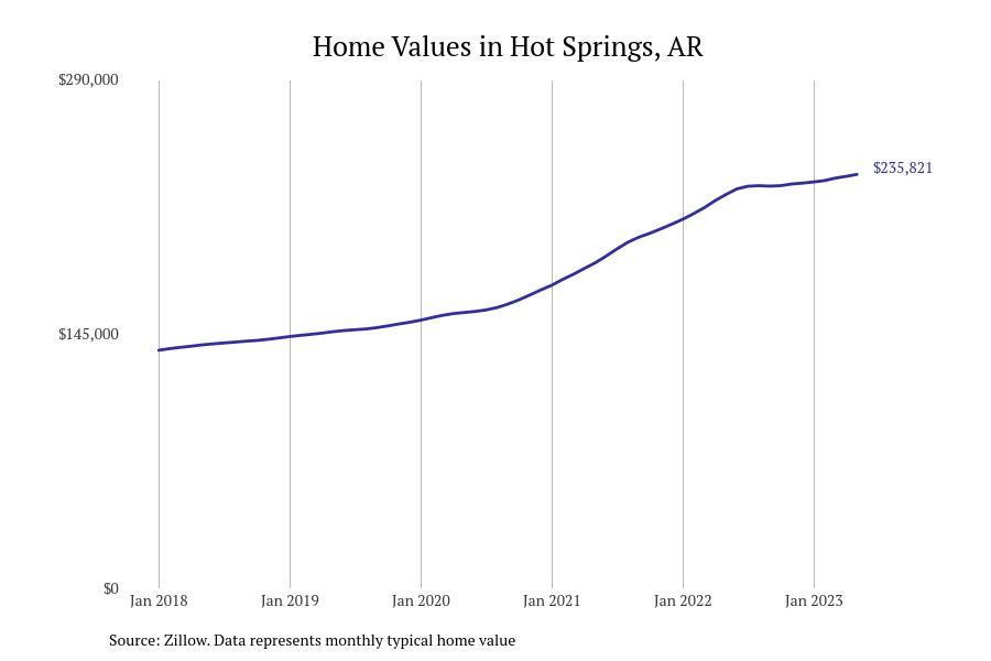Stacker compiled a list of cities with the fastest-growing home prices in the Hot Springs, AR metro area using data from Zillow. Cities are ranked by 1-year price change as of May 2023. The typical home value in the United States increased over the last year by 0.9% to $346,856. All 7 cities and towns with data available were included in the list.
