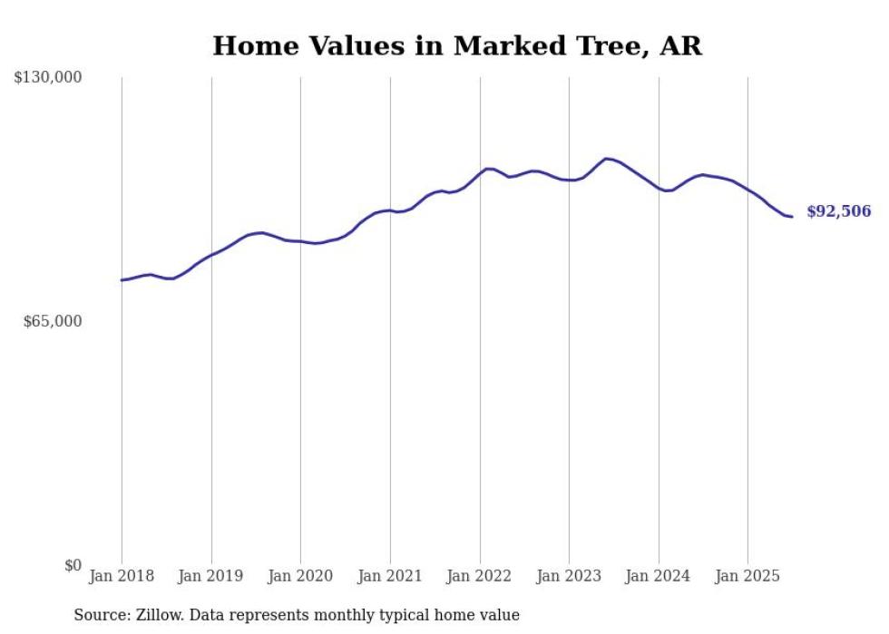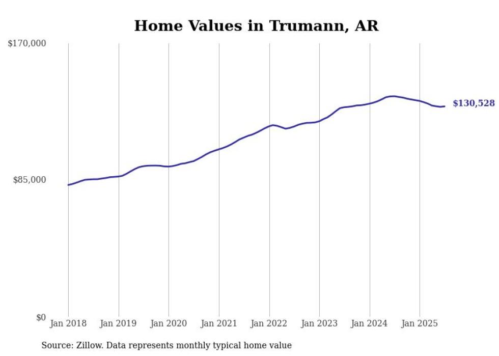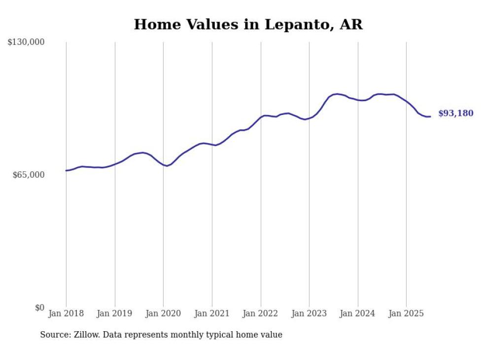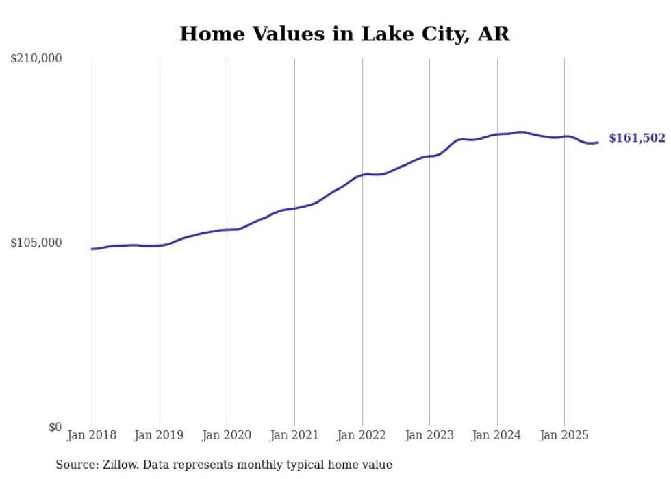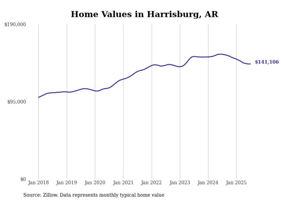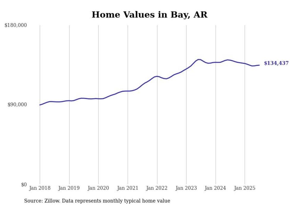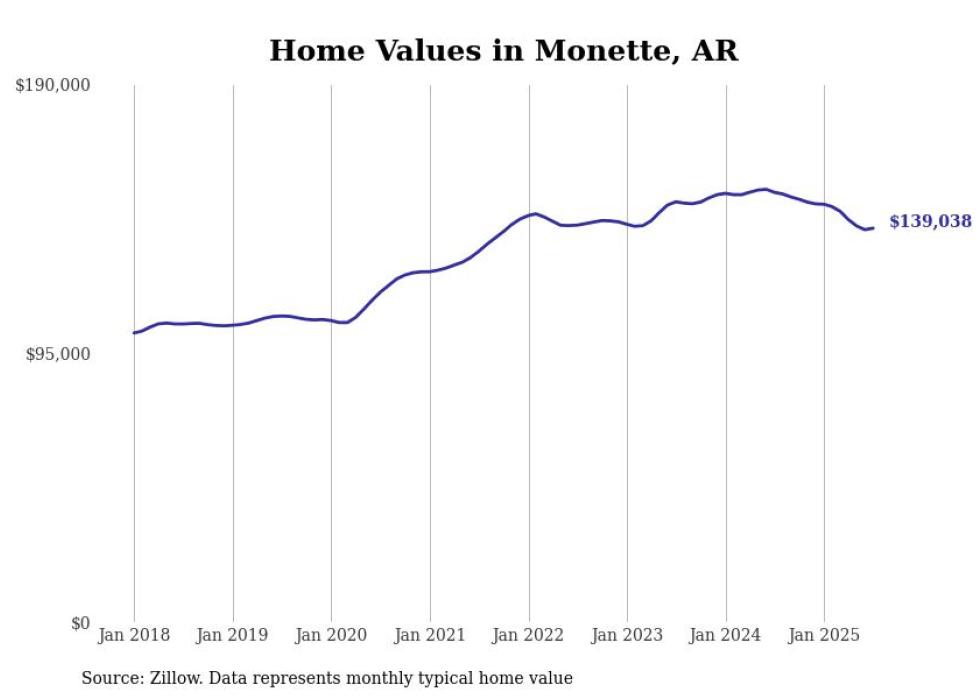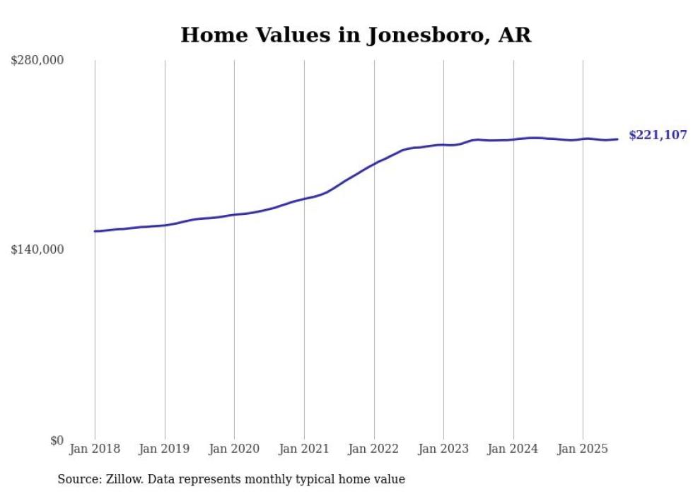Stacker compiled a list of cities with the most expensive homes in the Jonesboro metro area using data from Zillow. Charts show the monthly typical home value since January 2018. All 9 cities and towns with data available were included in the list.