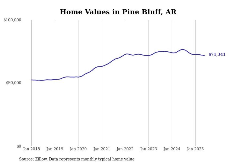 Stacker compiled a list of cities with the most expensive homes in the Pine Bluff, AR metro area using data from Zillow. Charts show the monthly typical home value since January 2018.