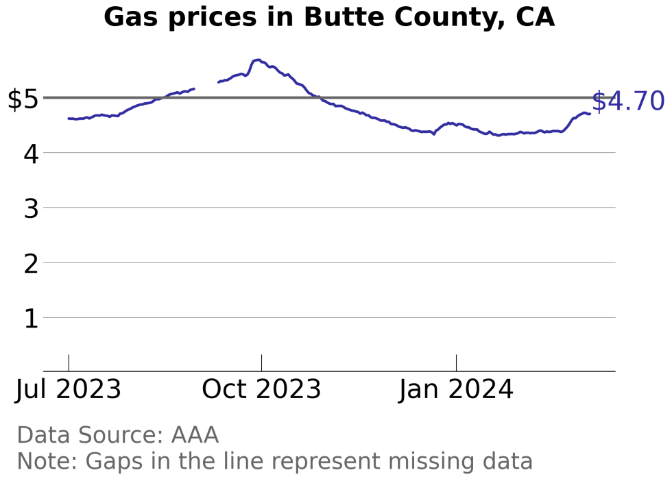 Stacker compiled statistics on gas prices in Butte County using data from AAA. Gas prices are current as of March 11.