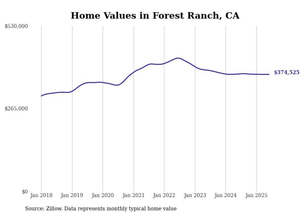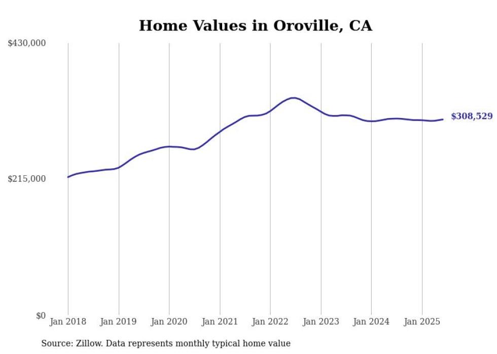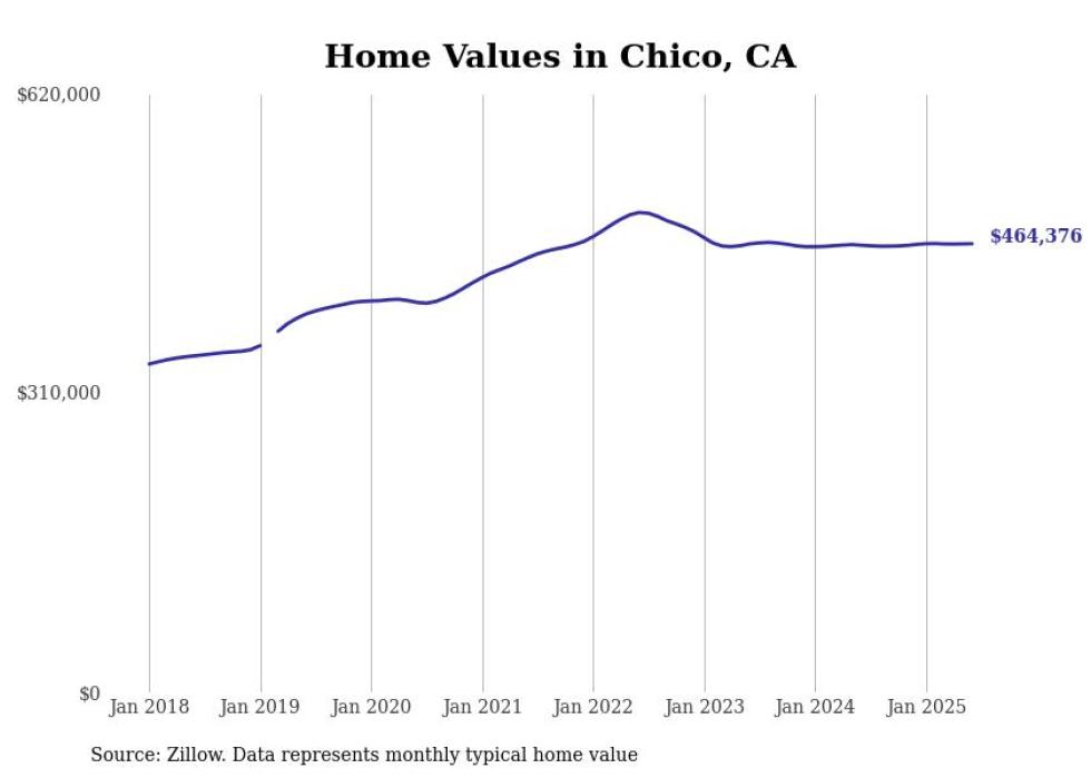 Stacker compiled a list of cities with the most expensive homes in the Chico, CA metro area using data from Zillow. Charts show the monthly typical home value since January 2018.