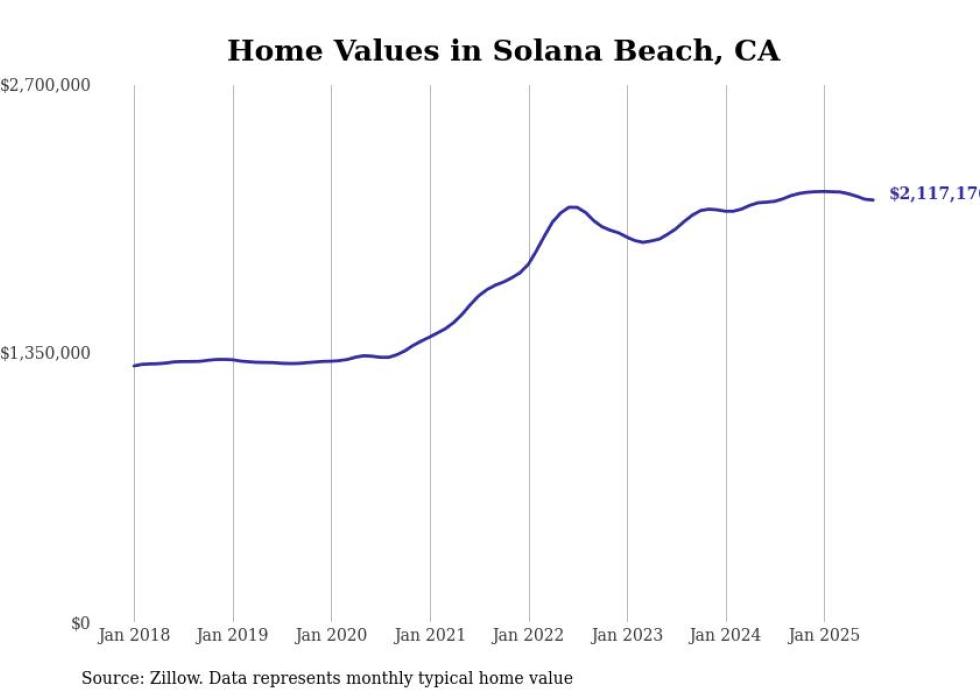 Stacker compiled a list of cities with the most expensive homes in the San Diego metro area using data from Zillow. Charts show the monthly typical home value since January 2018. Data was available for 43 cities and towns.