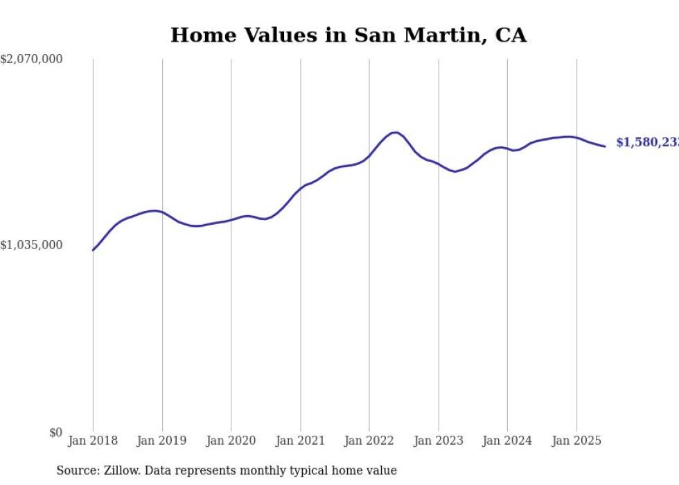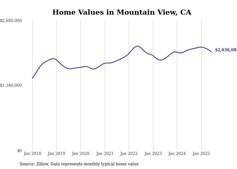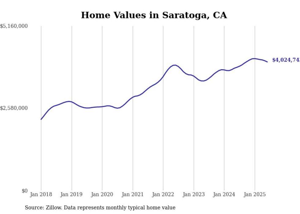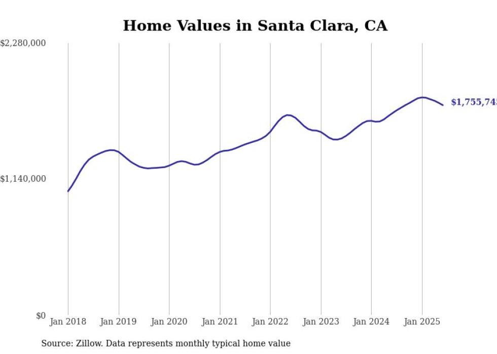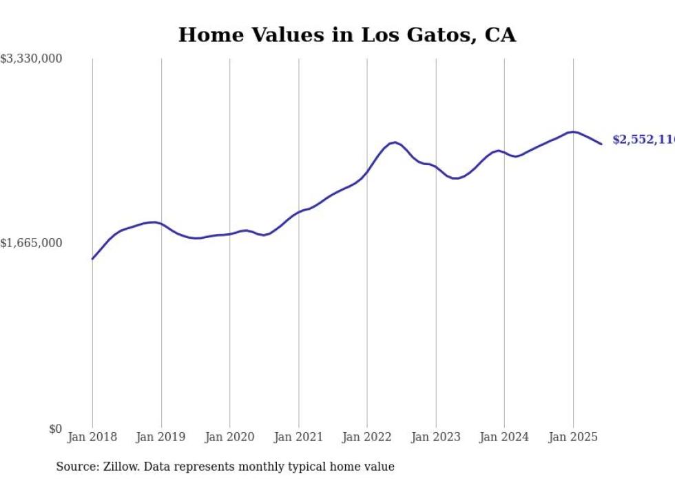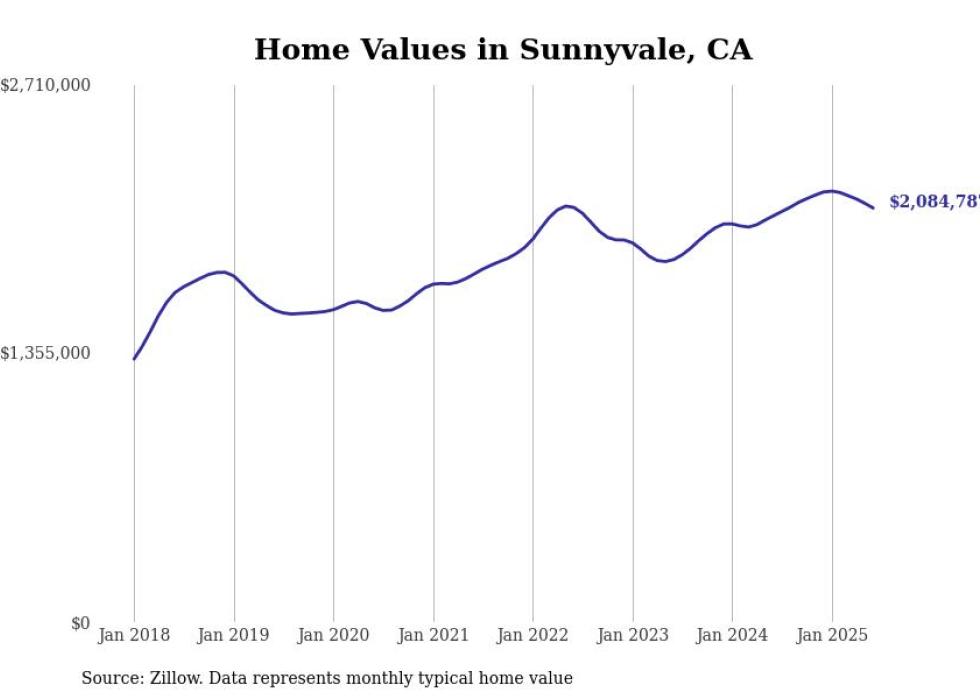 Stacker compiled a list of cities with the most expensive homes in the San Jose-Sunnyvale-Santa Clara, CA metro area using data from Zillow. Charts show the monthly typical home value since January 2018.