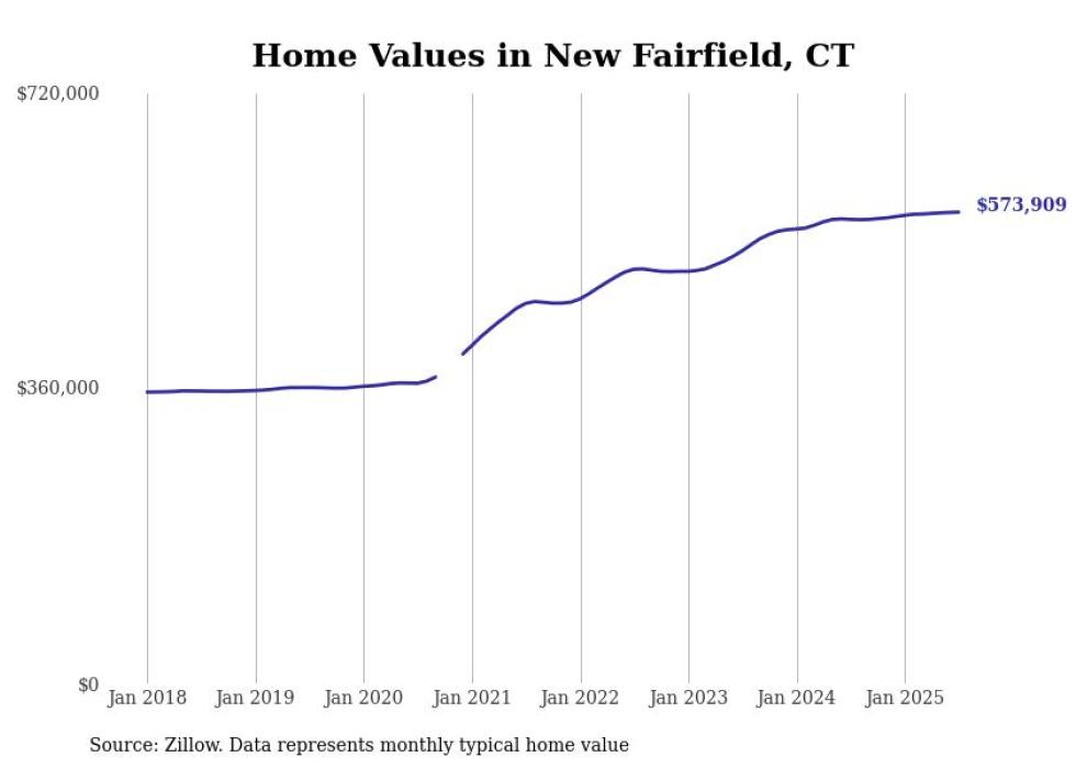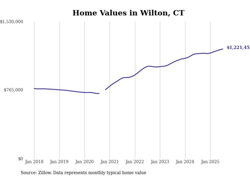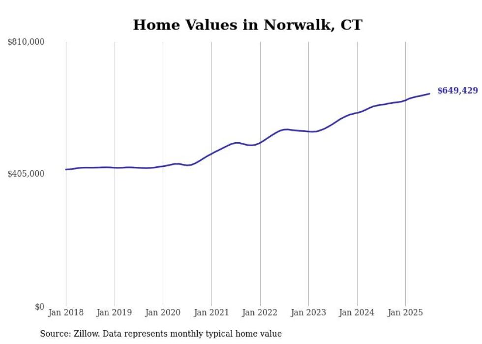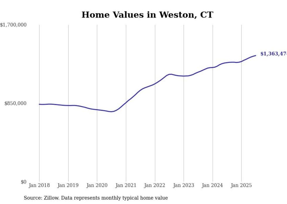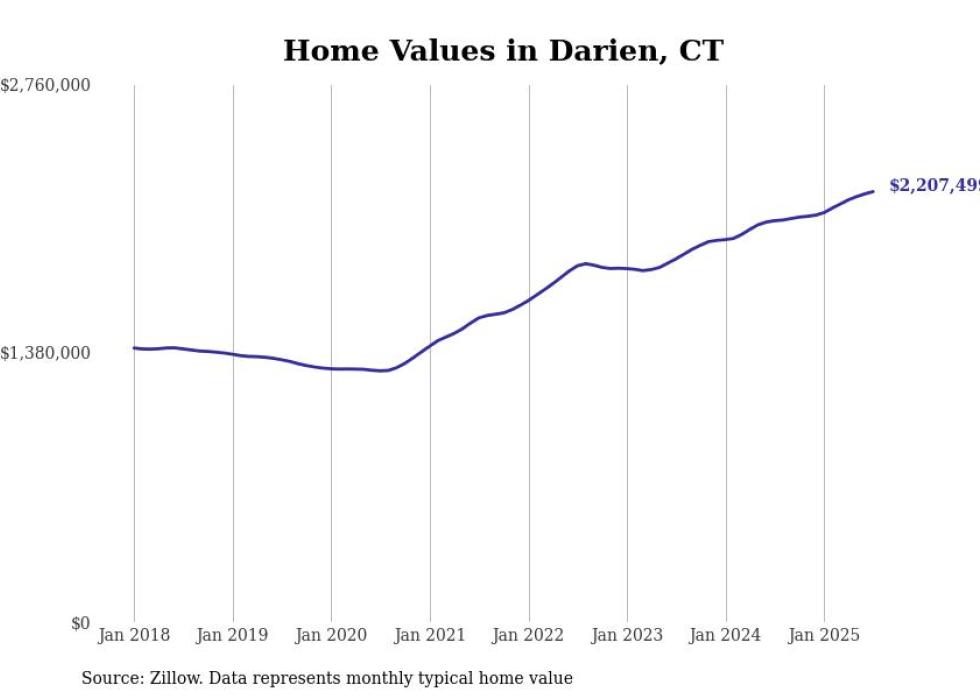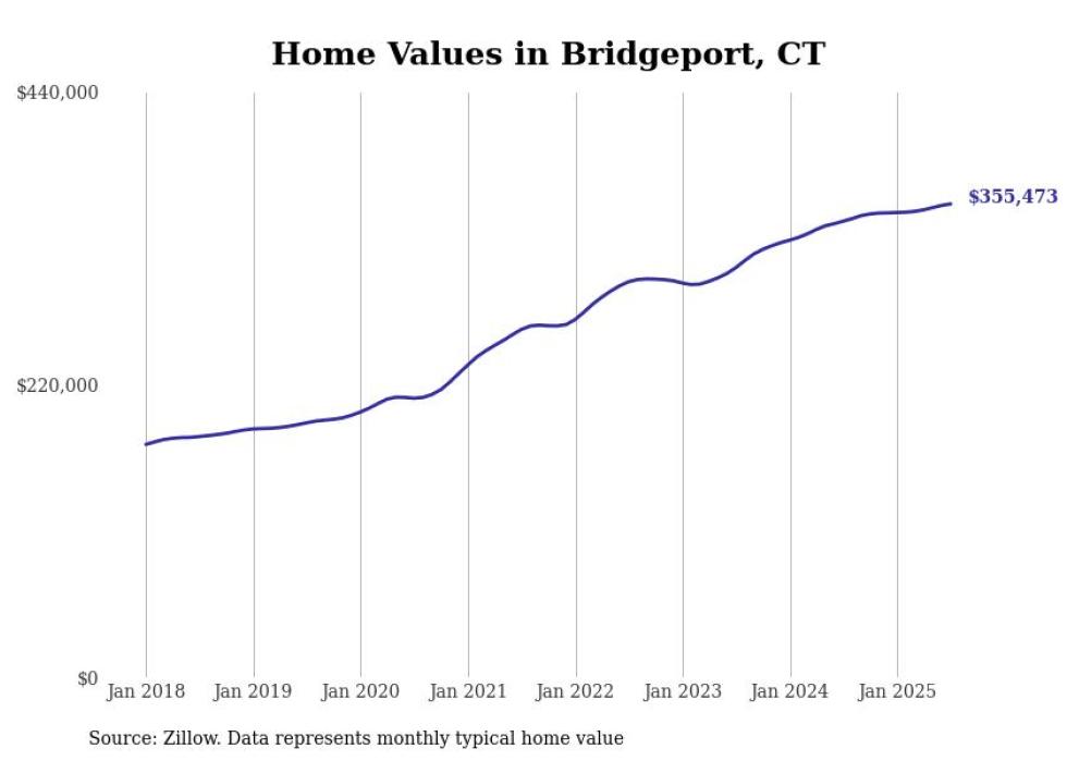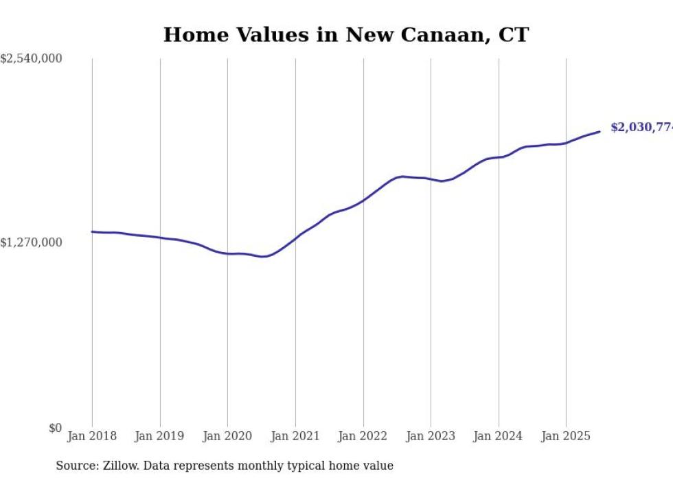 Stacker compiled a list of cities with the most expensive homes in the Bridgeport metro area using data from Zillow. Charts show the monthly typical home value since January 2018. All 23 cities and towns with data available were included in the list.