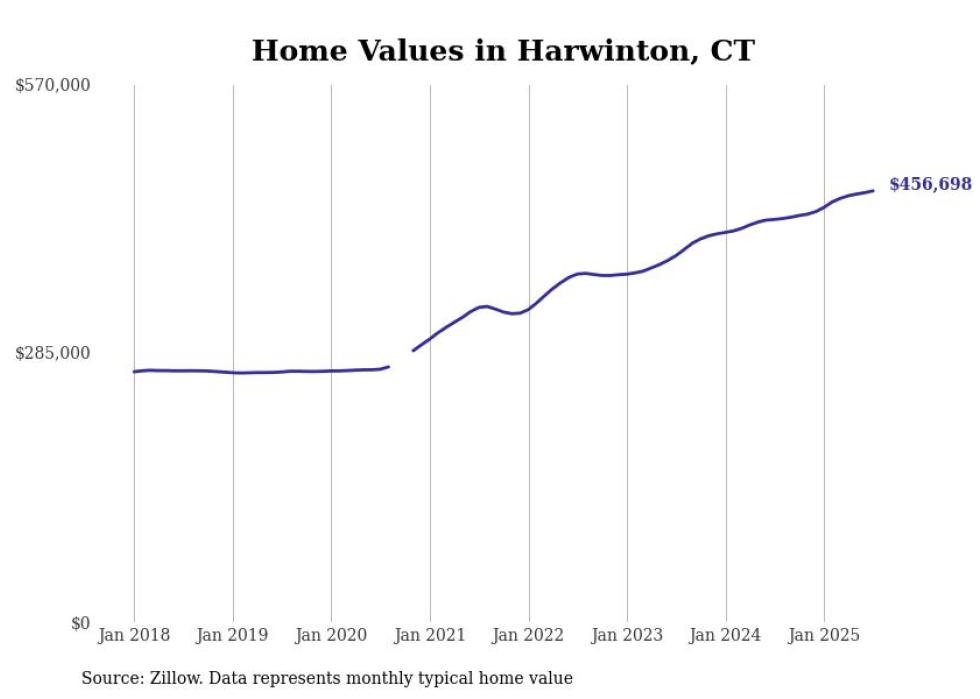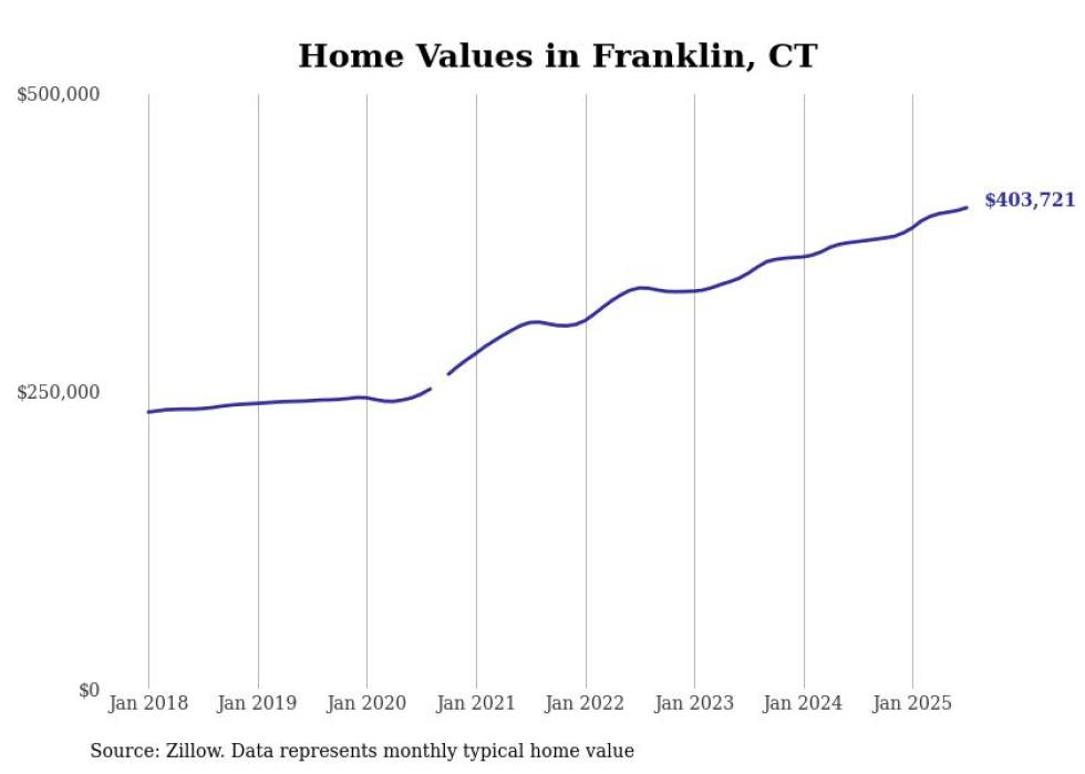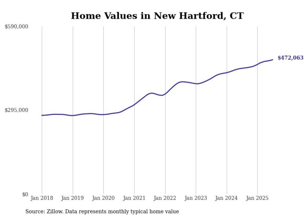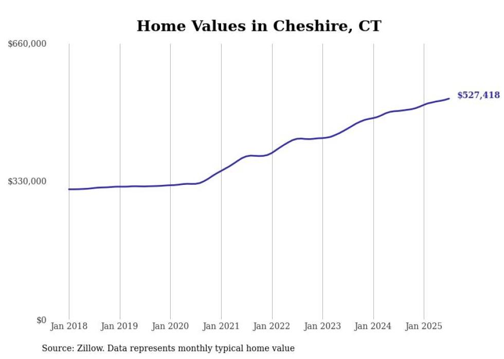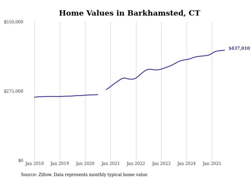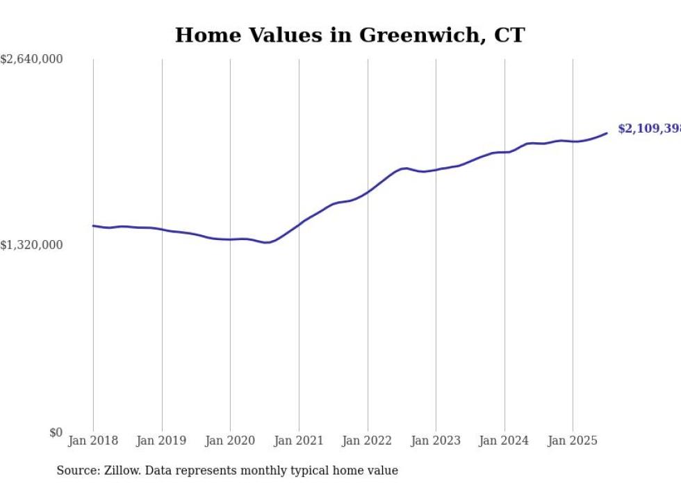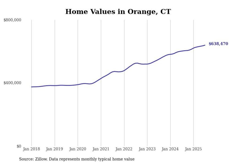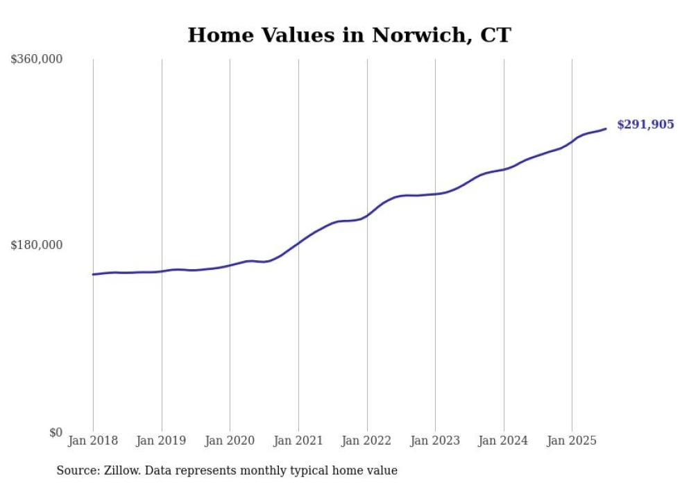 Stacker compiled a list of cities with the fastest-growing home prices in Connecticut using data from Zillow. Cities are ranked by the dollar change in the Zillow Home Values Index for all homes from the 12 months ending July 2025. The charts in this story were created automatically using Matplotlib. Data was available for 50 cities and towns in Connecticut.
