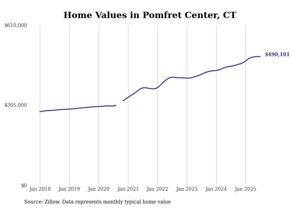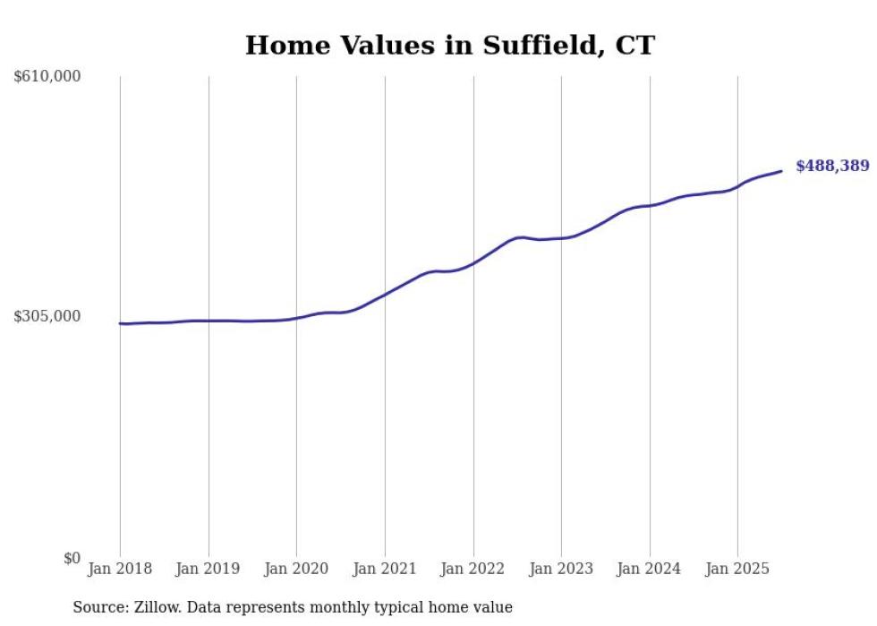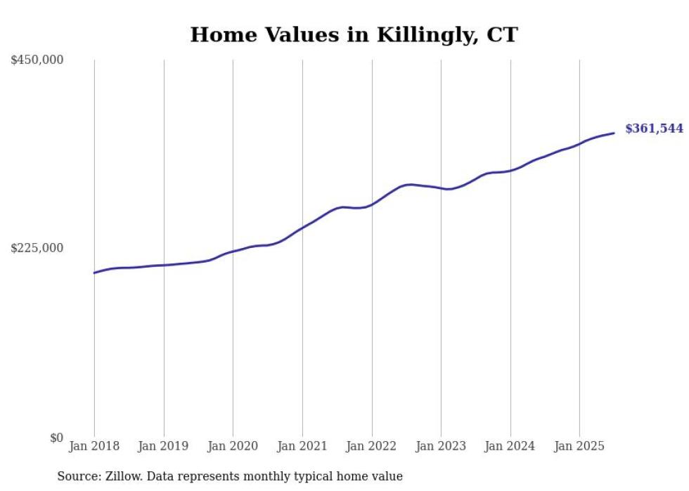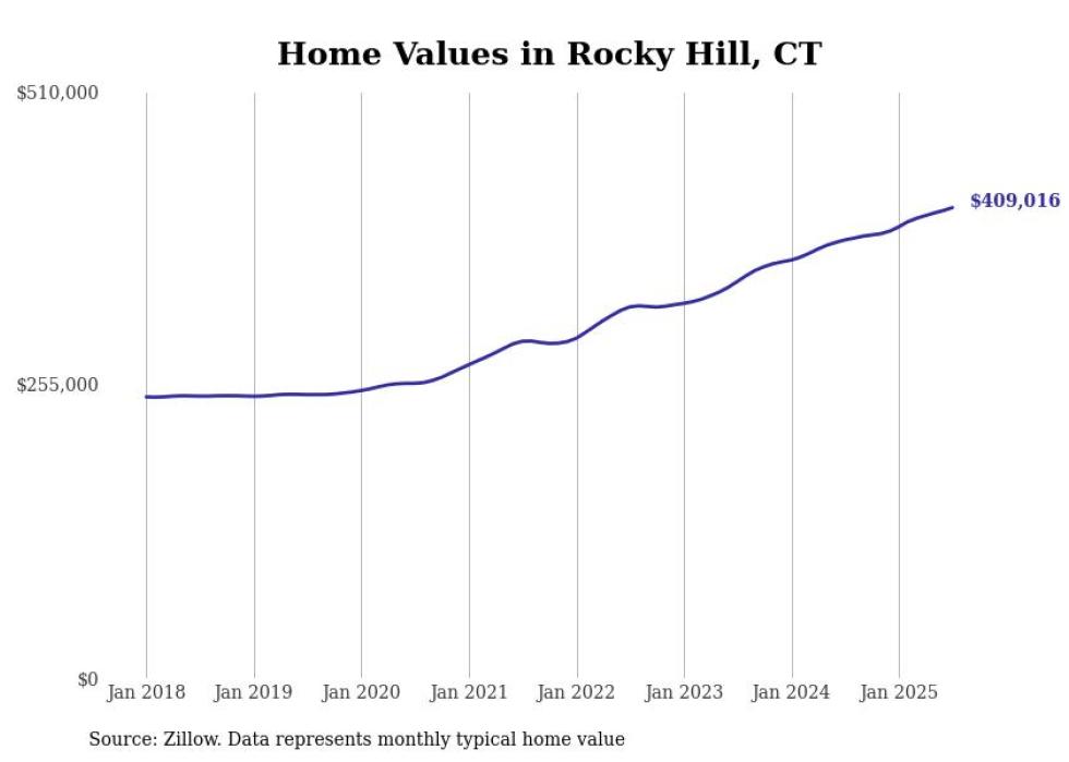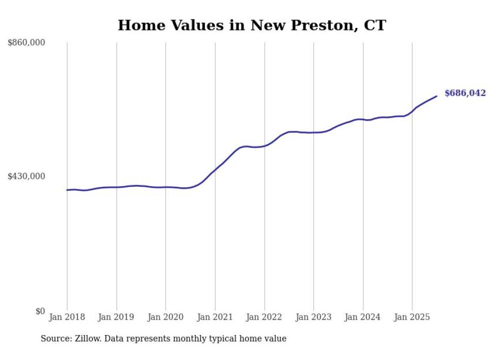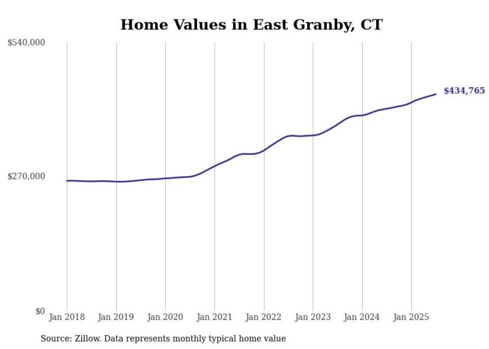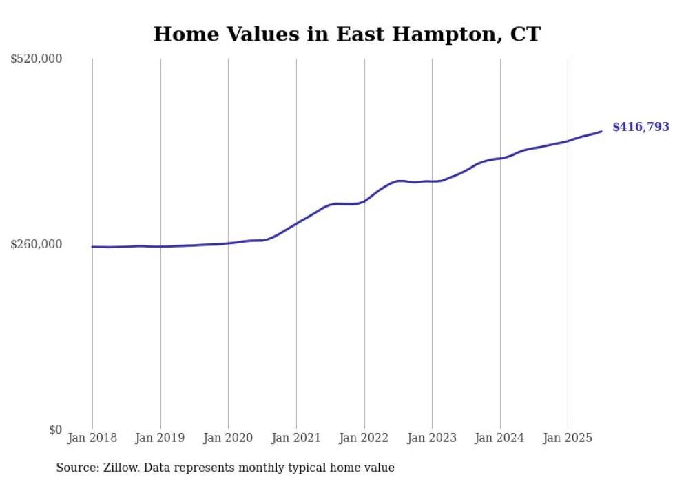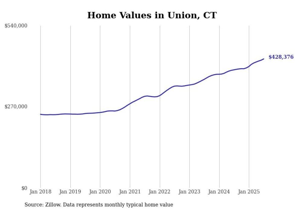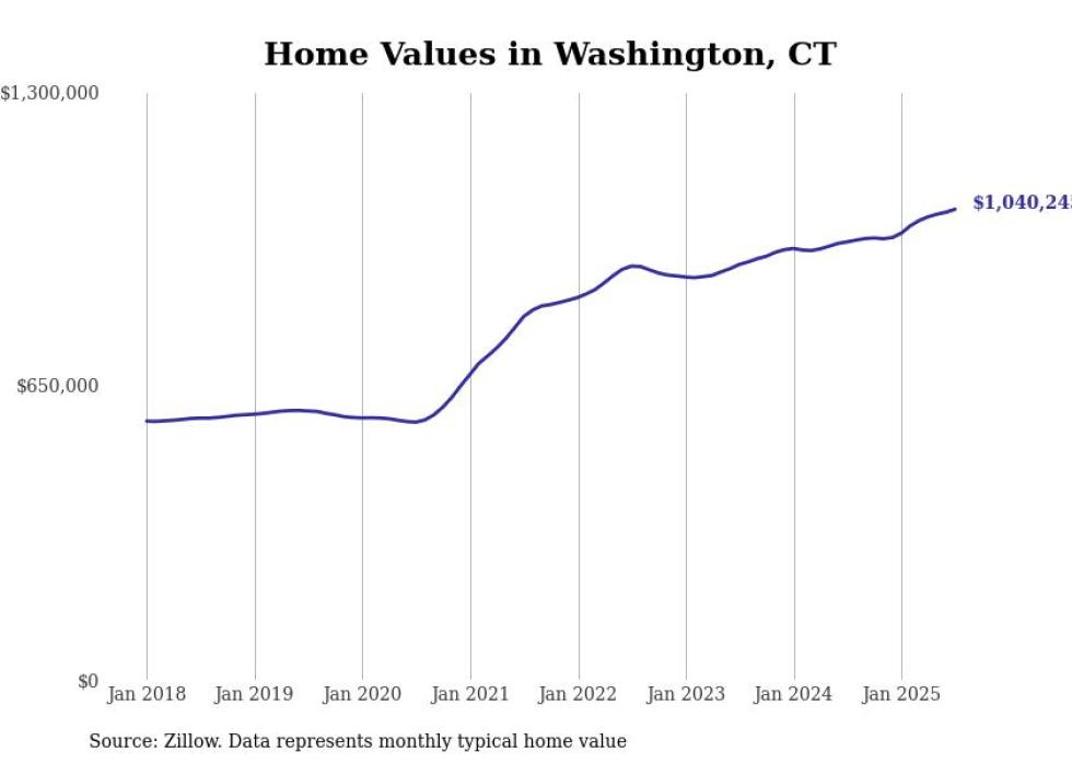 Stacker compiled a list of cities with the fastest-growing home prices in Connecticut using data from Zillow. Cities are ranked by the dollar change in the Zillow Home Values Index for all homes from the 12 months ending July 2025. The charts in this story were created automatically using Matplotlib. Data was available for 50 cities and towns in Connecticut.