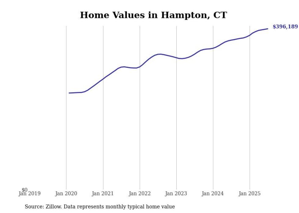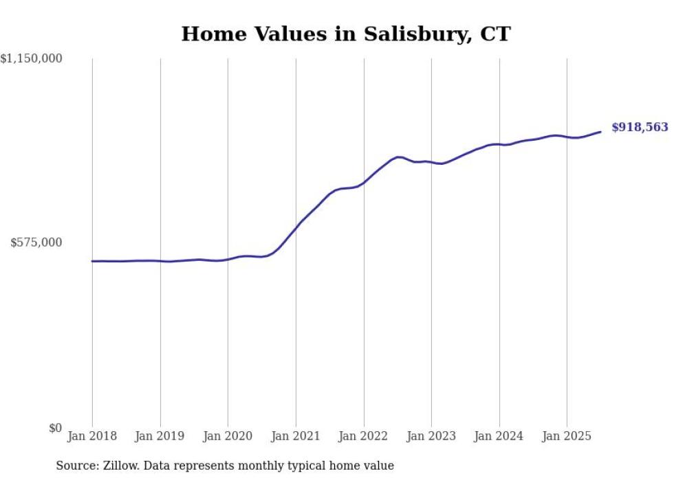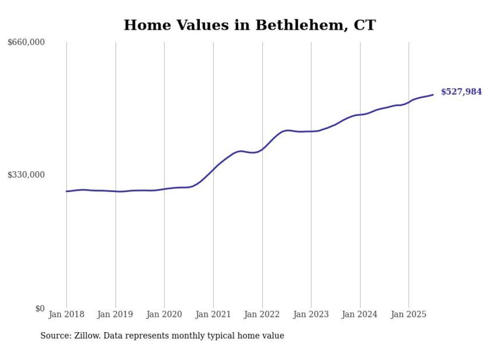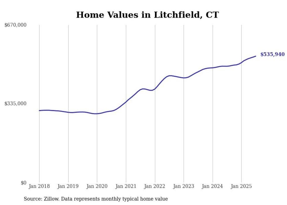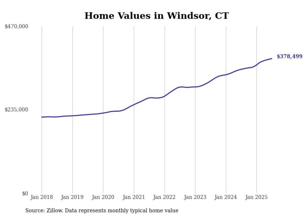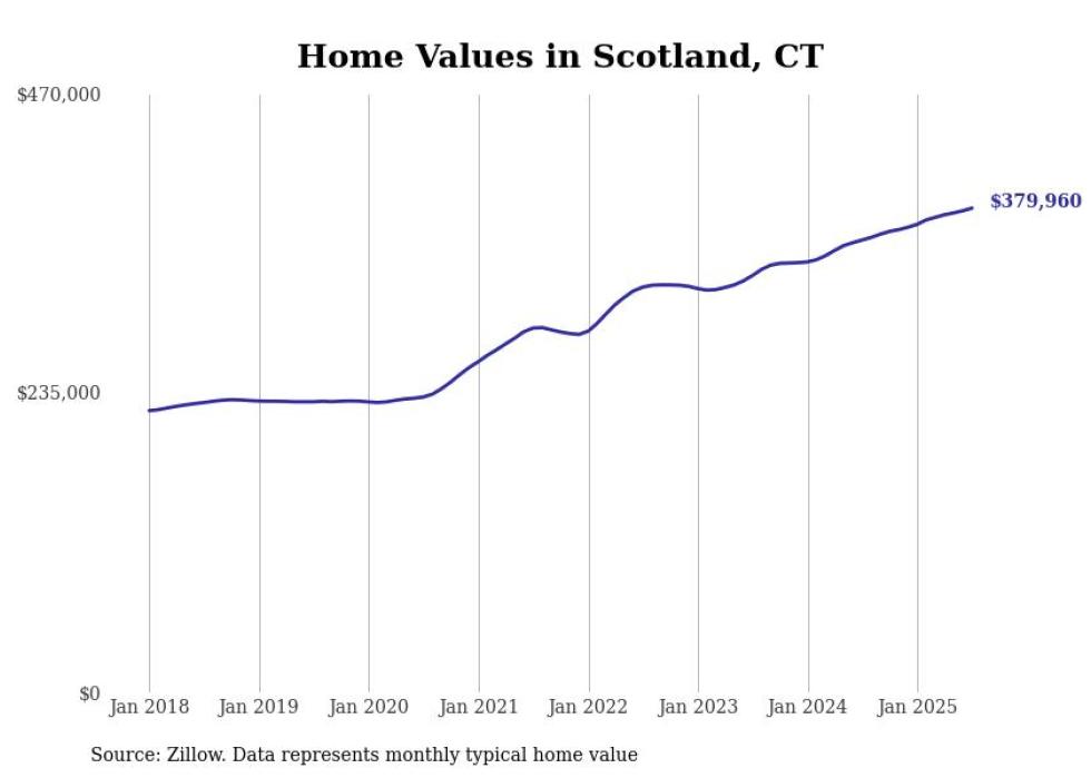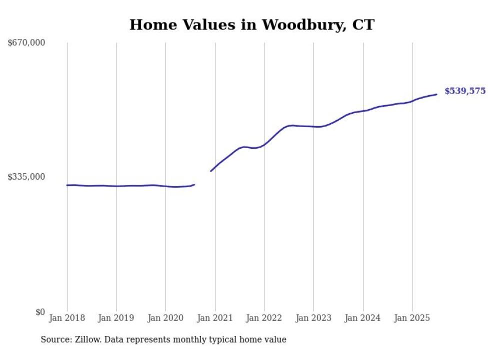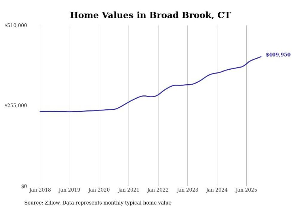 Stacker compiled a list of cities with the fastest-growing home prices in Connecticut using data from Zillow. Cities are ranked by the dollar change in the Zillow Home Values Index for all homes from the 12 months ending July 2025. The charts in this story were created automatically using Matplotlib. Data was available for 50 cities and towns in Connecticut.