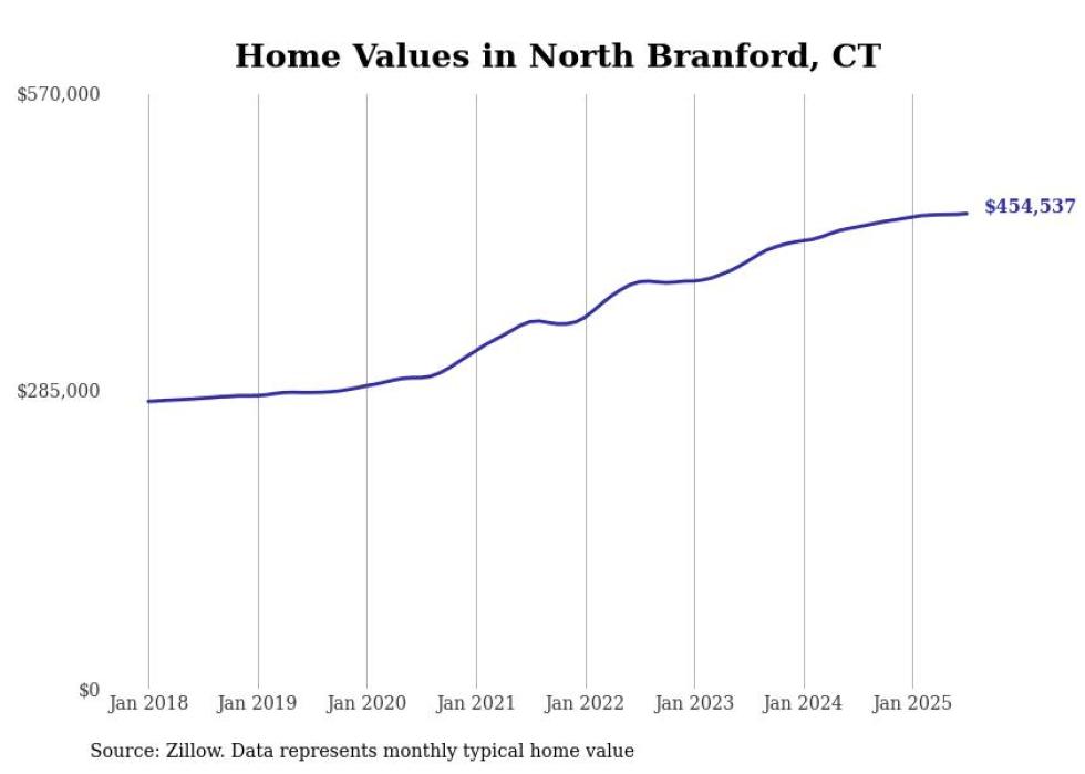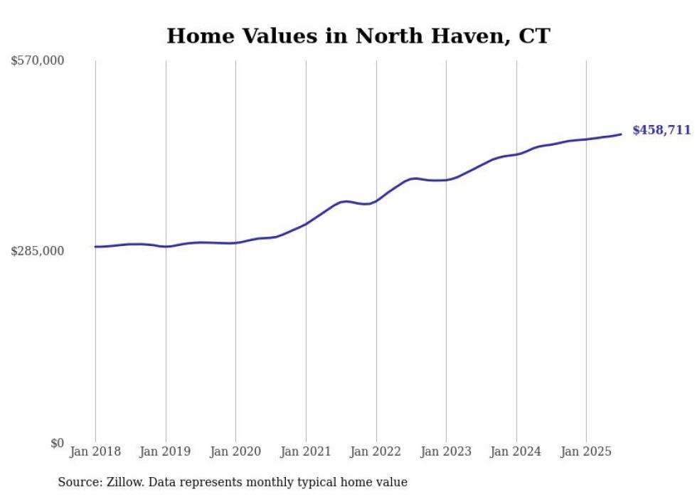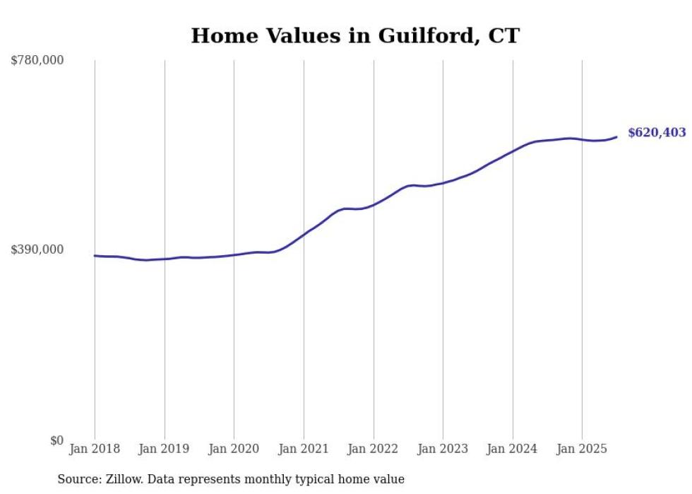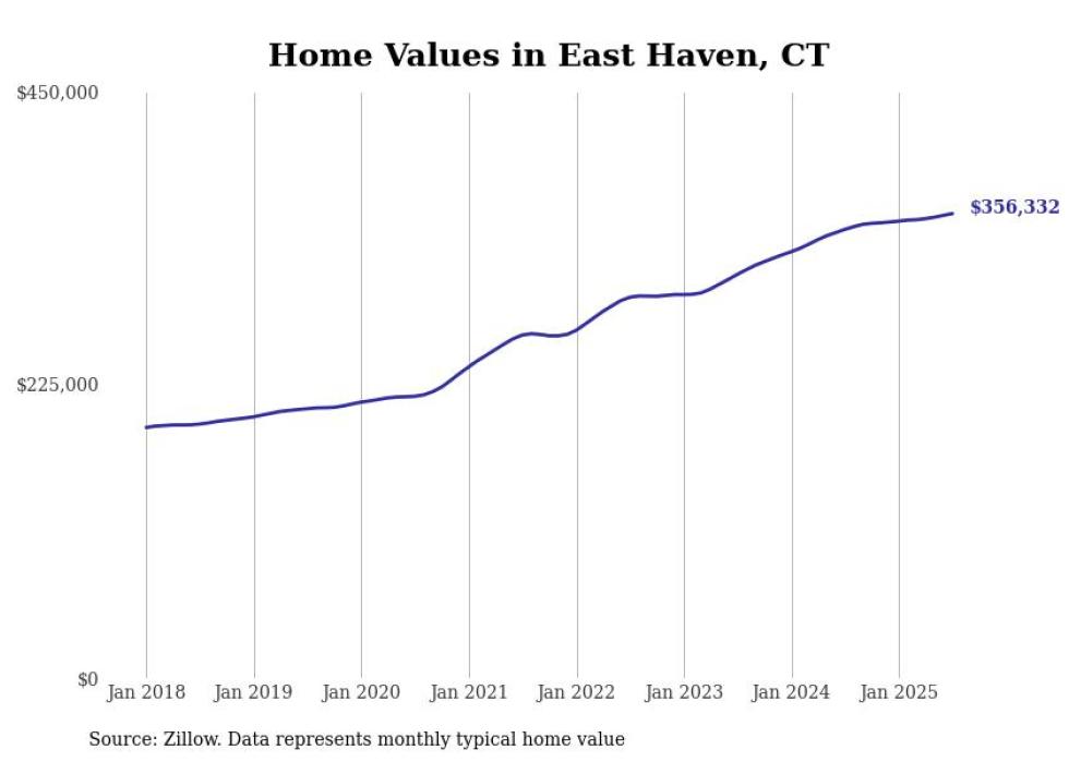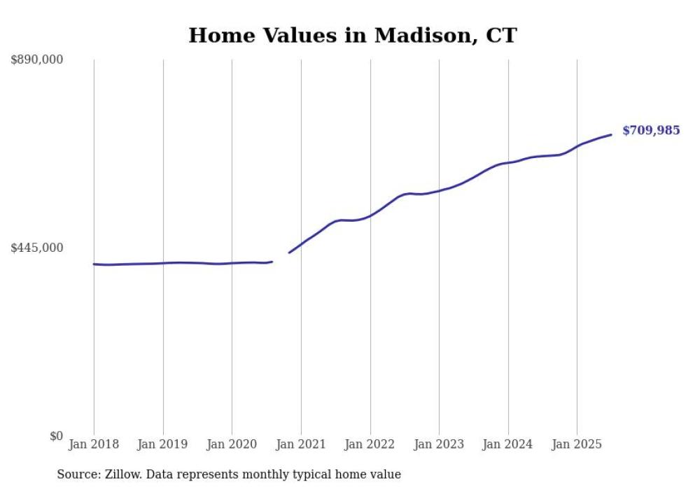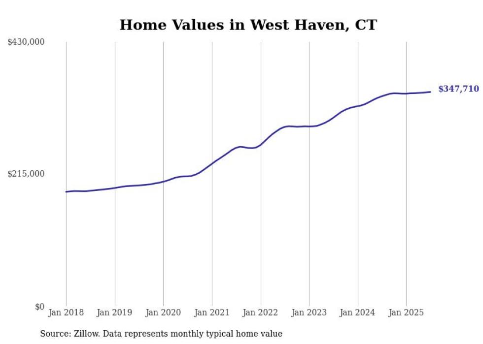 Stacker compiled a list of cities with the most expensive homes in the New Haven metro area using data from Zillow. Charts show the monthly typical home value since January 2018. All 27 cities and towns with data available were included in the list.
