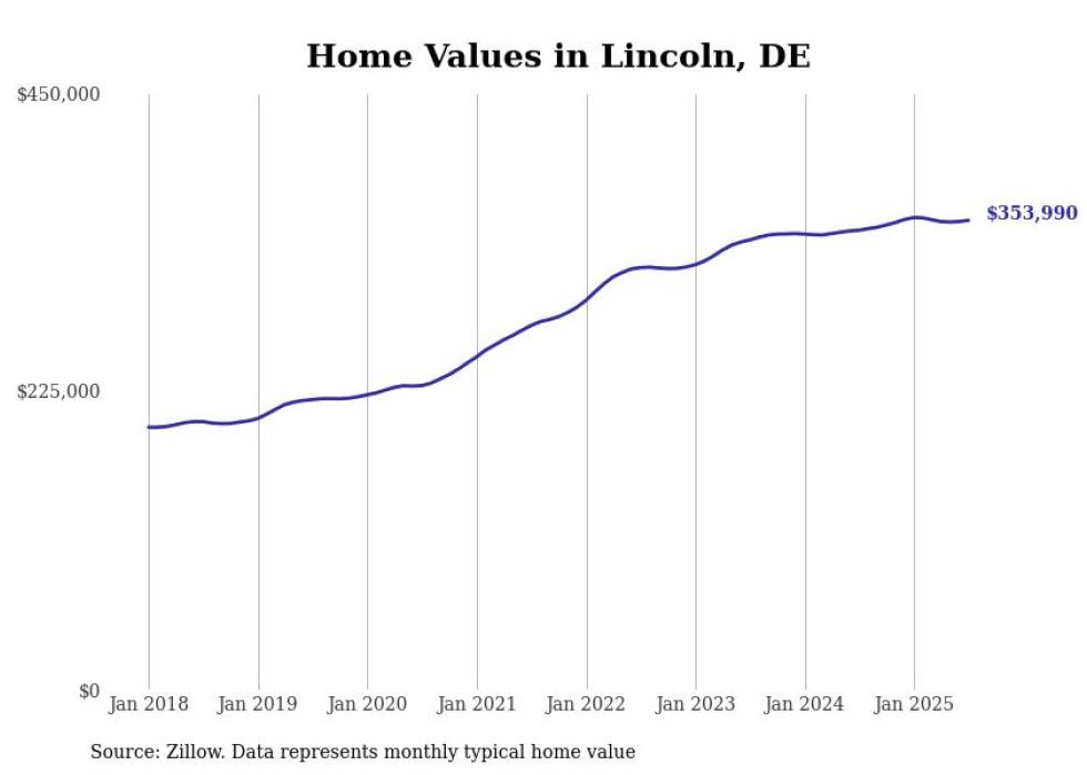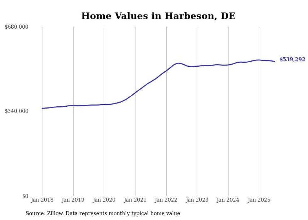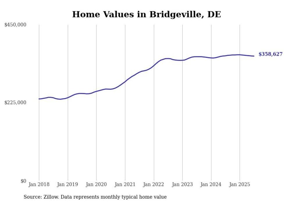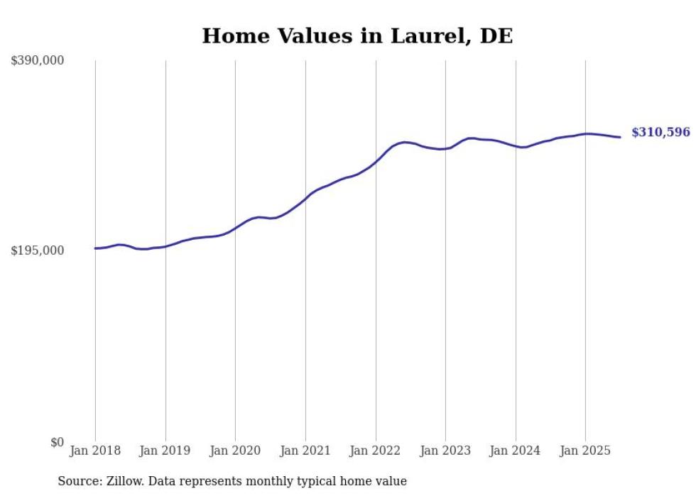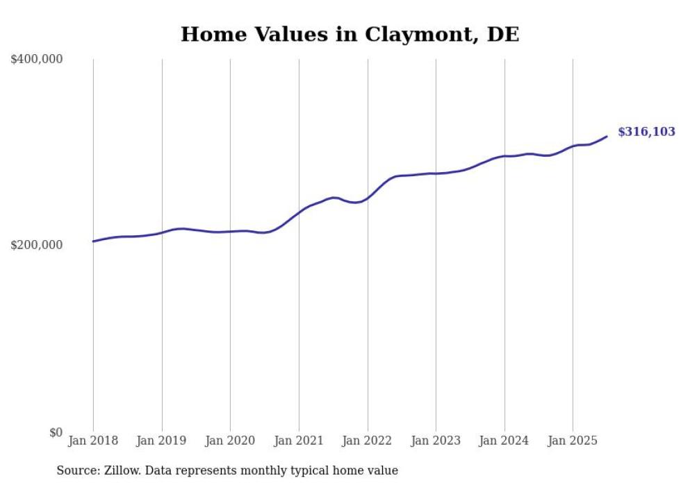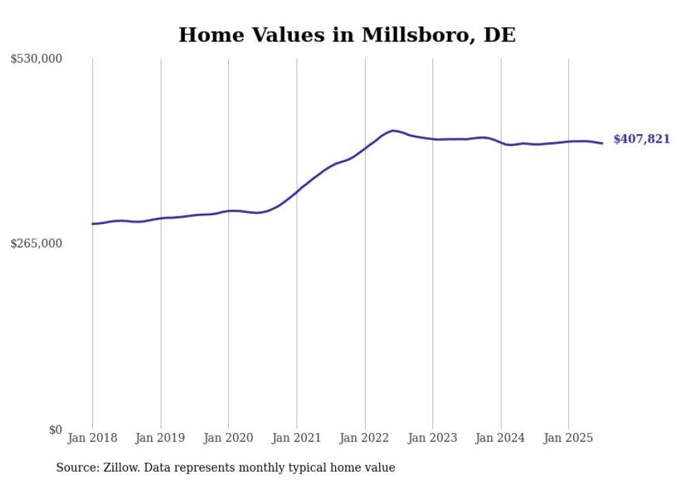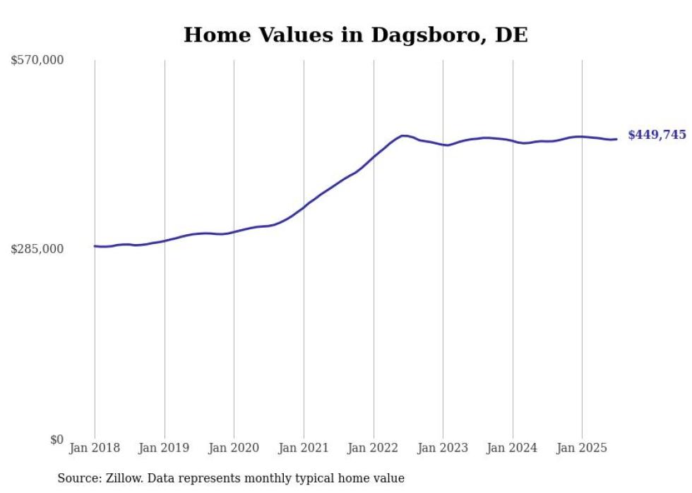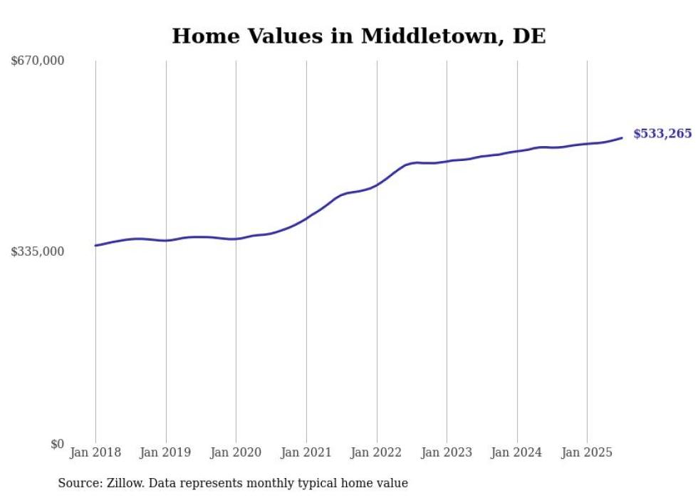 Stacker compiled a list of cities with the fastest-growing home prices in Delaware using data from Zillow. Cities are ranked by the dollar change in the Zillow Home Values Index for all homes from the 12 months ending July 2025. The charts in this story were created automatically using Matplotlib. Data was available for 50 cities and towns in Delaware.