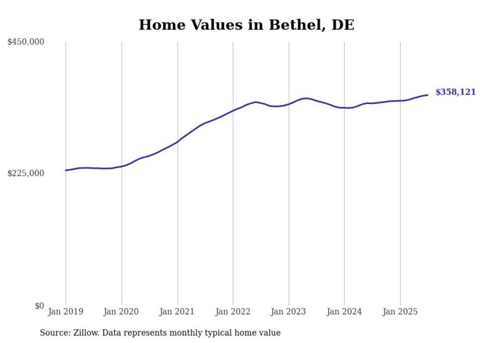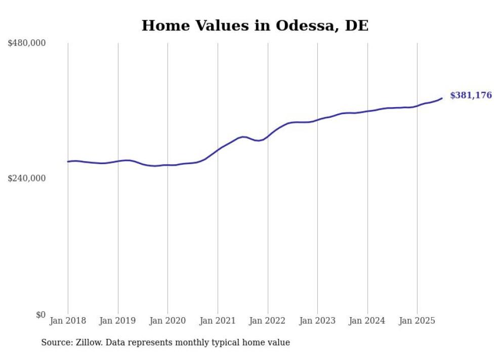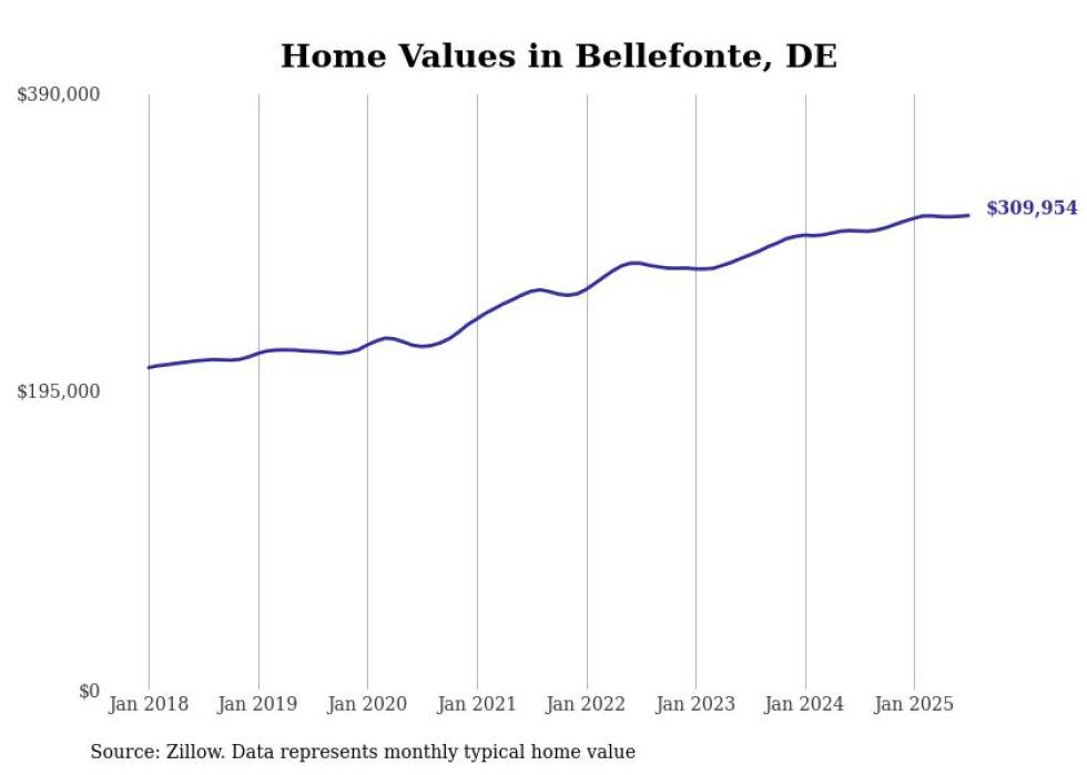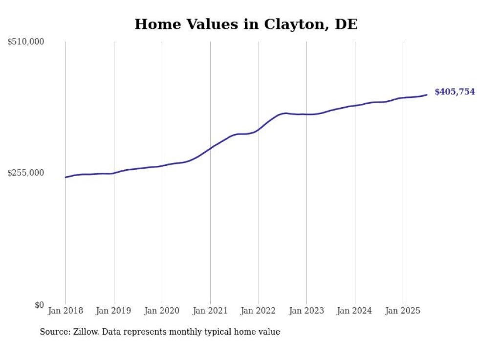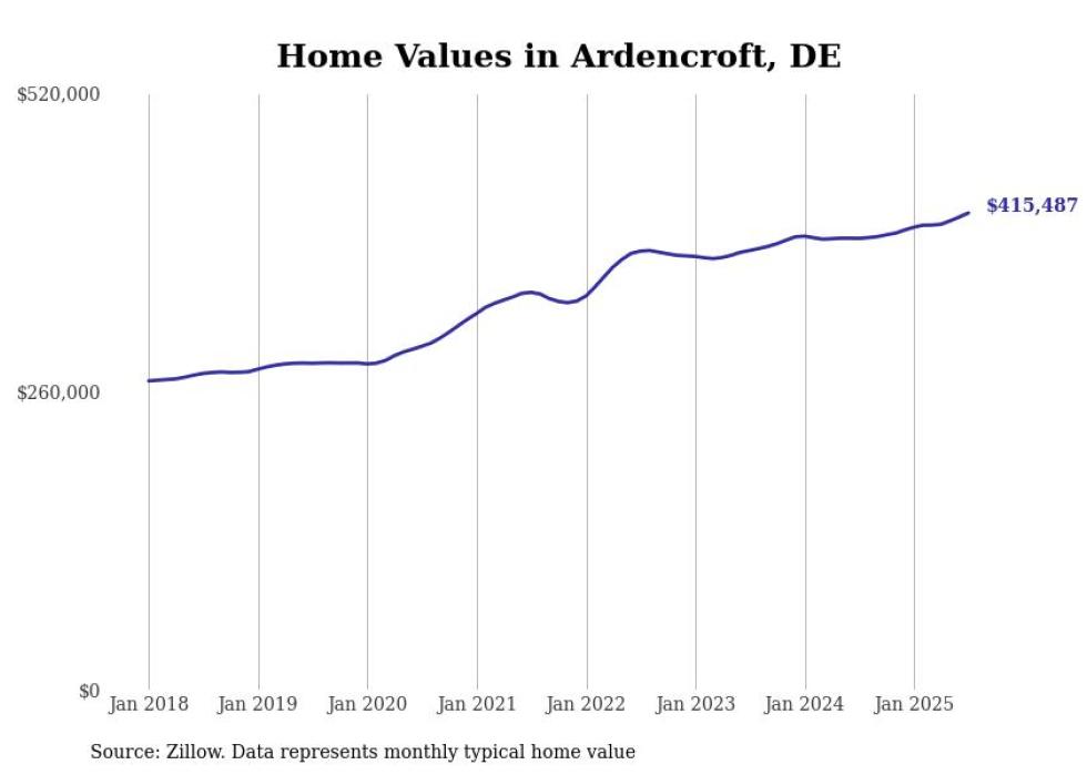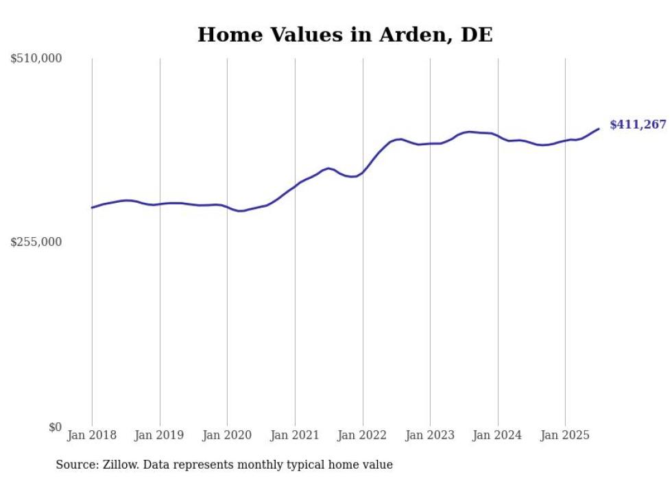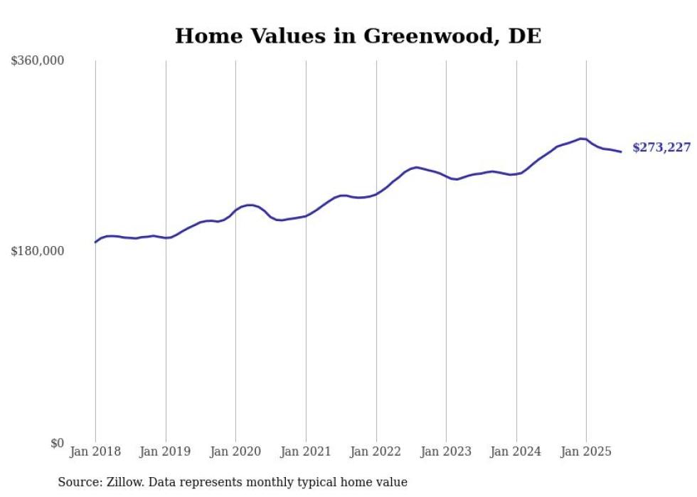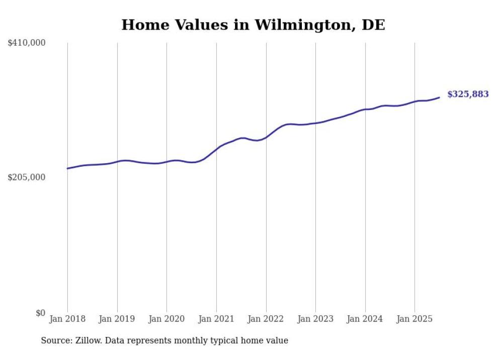 Stacker compiled a list of cities with the fastest-growing home prices in Delaware using data from Zillow. Cities are ranked by the dollar change in the Zillow Home Values Index for all homes from the 12 months ending July 2025. The charts in this story were created automatically using Matplotlib. Data was available for 50 cities and towns in Delaware.