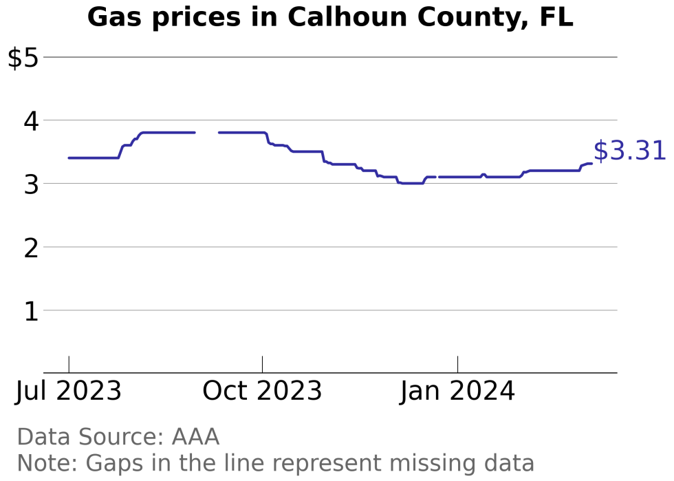 Stacker compiled statistics on gas prices in Calhoun County using data from AAA. Gas prices are current as of March 11.