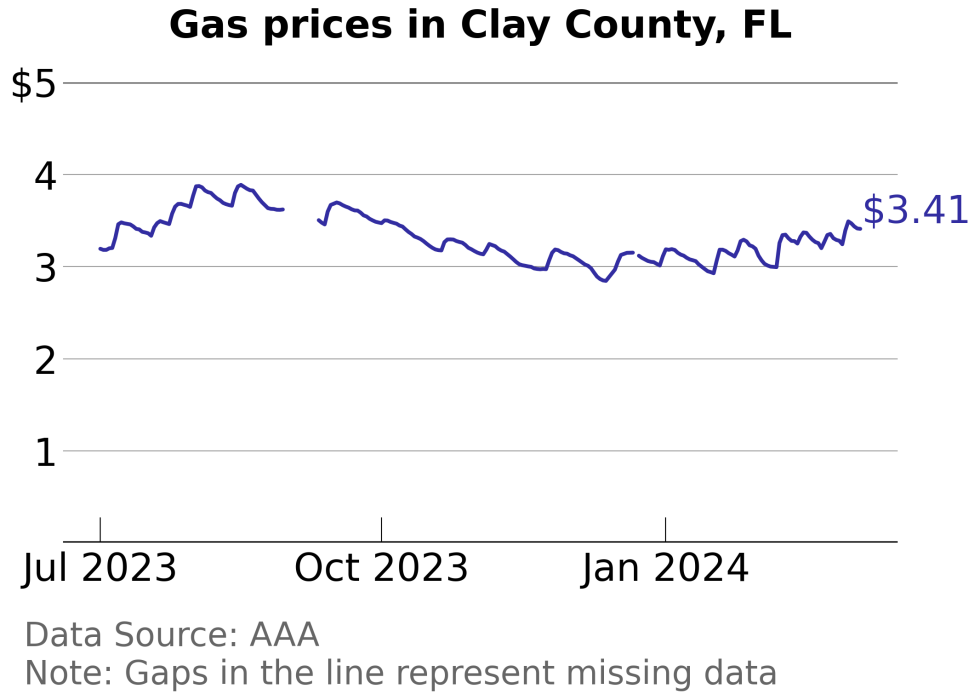 Stacker compiled statistics on gas prices in Clay County using data from AAA. Gas prices are current as of March 11.