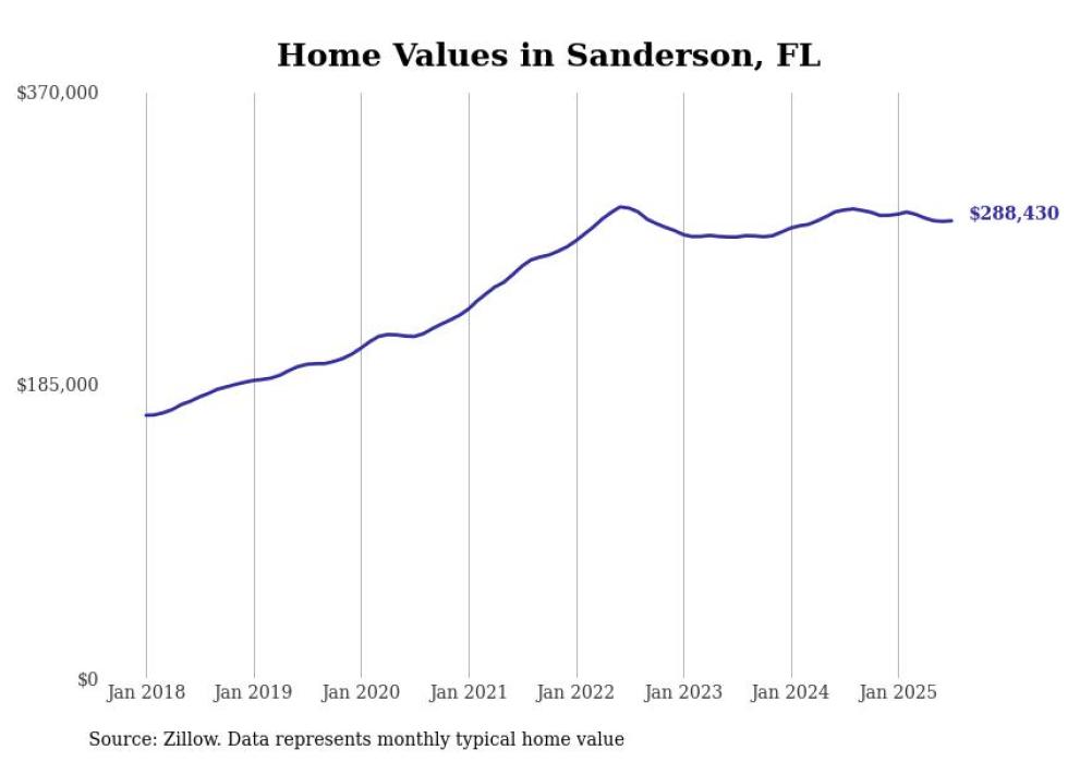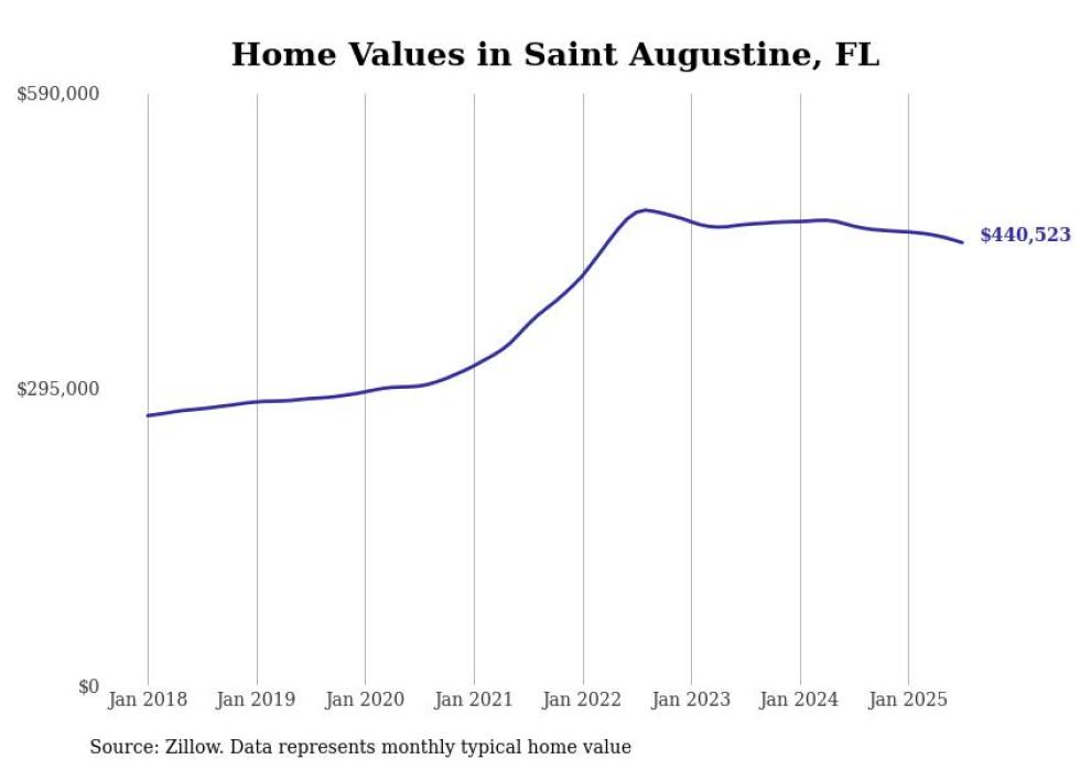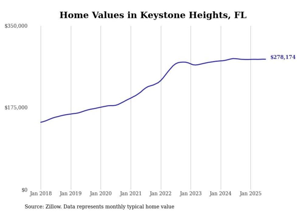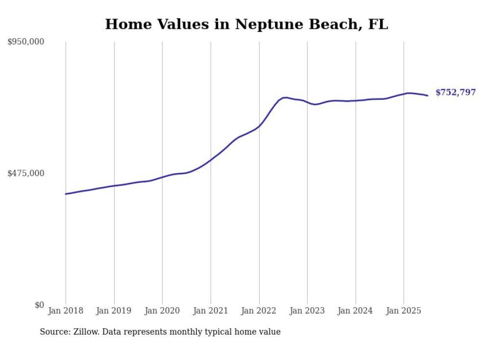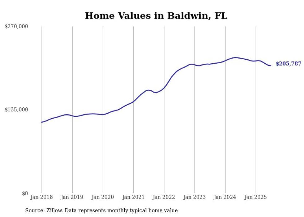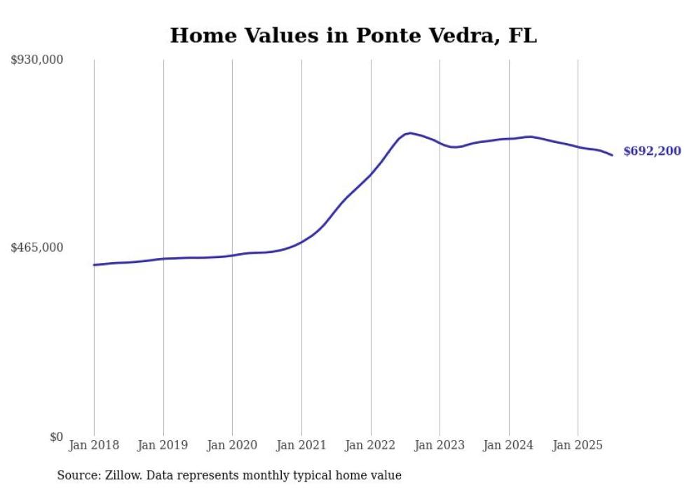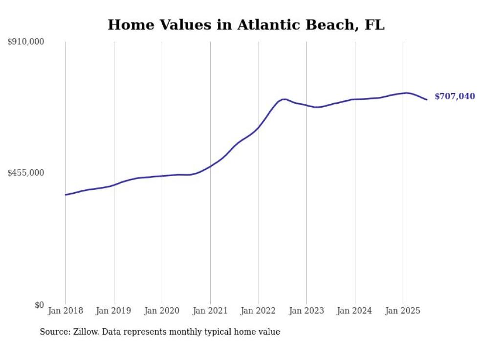 Stacker compiled a list of cities with the most expensive homes in the Jacksonville metro area using data from Zillow. Charts show the monthly typical home value since January 2018. All 27 cities and towns with data available were included in the list.