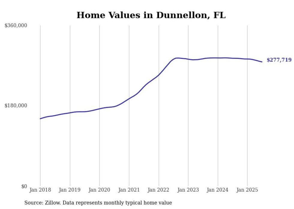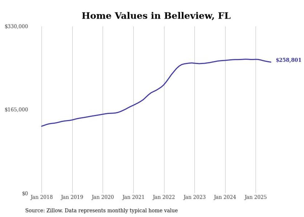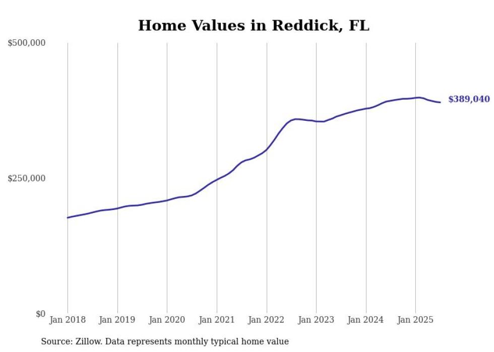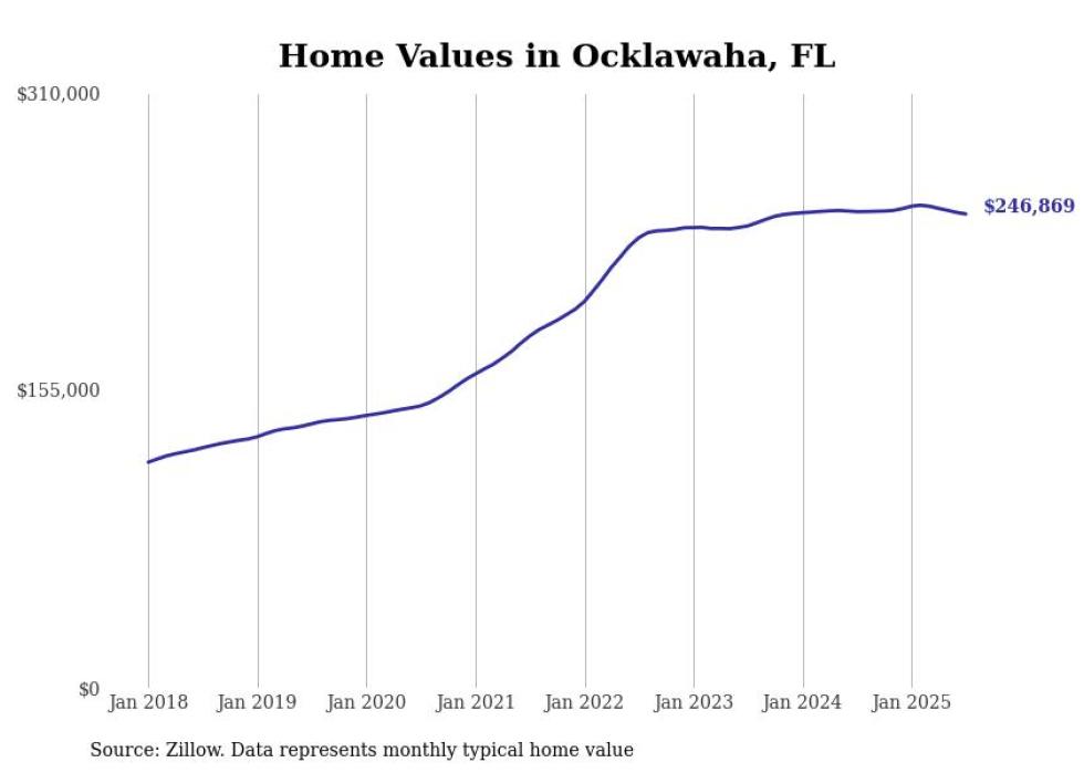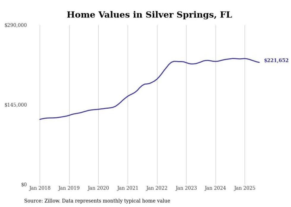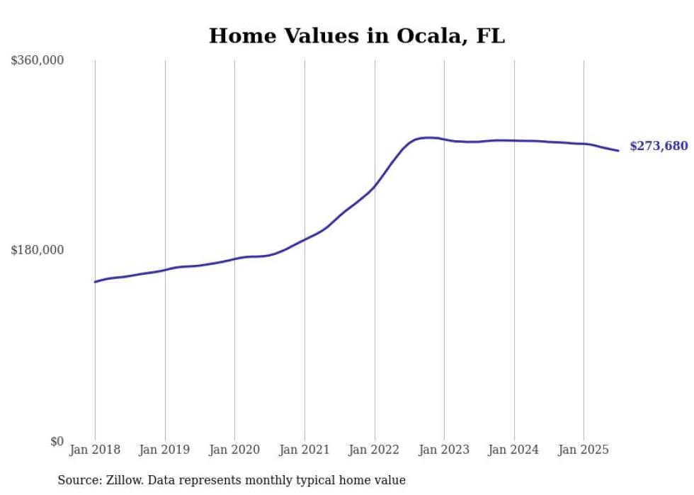 Stacker compiled a list of cities with the most expensive homes in the Ocala metro area using data from Zillow. Charts show the monthly typical home value since January 2018. All 12 cities and towns with data available were included in the list.
