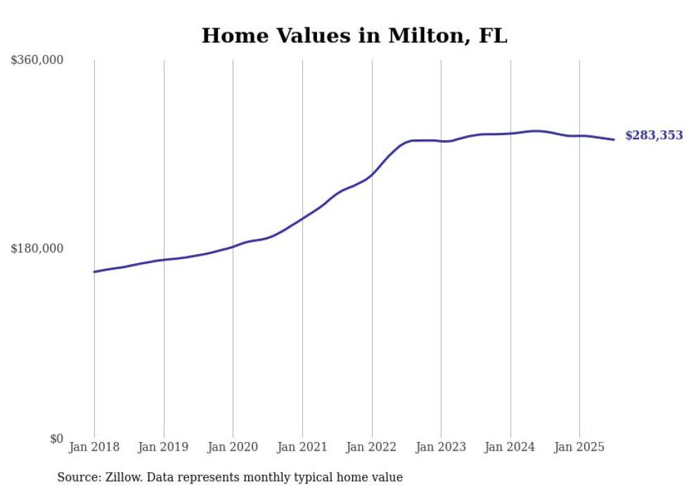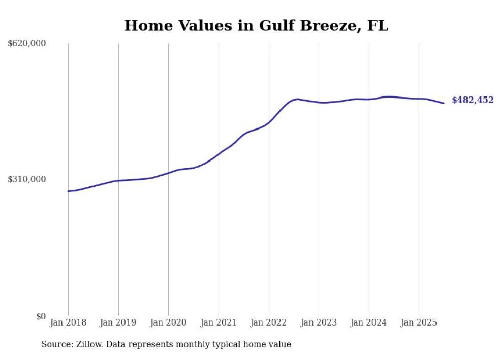 Stacker compiled a list of cities with the most expensive homes in the Pensacola metro area using data from Zillow. Charts show the monthly typical home value since January 2018. All 10 cities and towns with data available were included in the list.