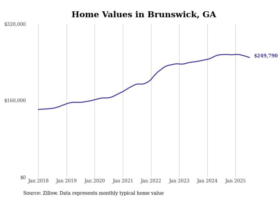Stacker compiled a list of cities with the most expensive homes in the Brunswick metro area using data from Zillow. Charts show the monthly typical home value since January 2018. All 9 cities and towns with data available were included in the list.