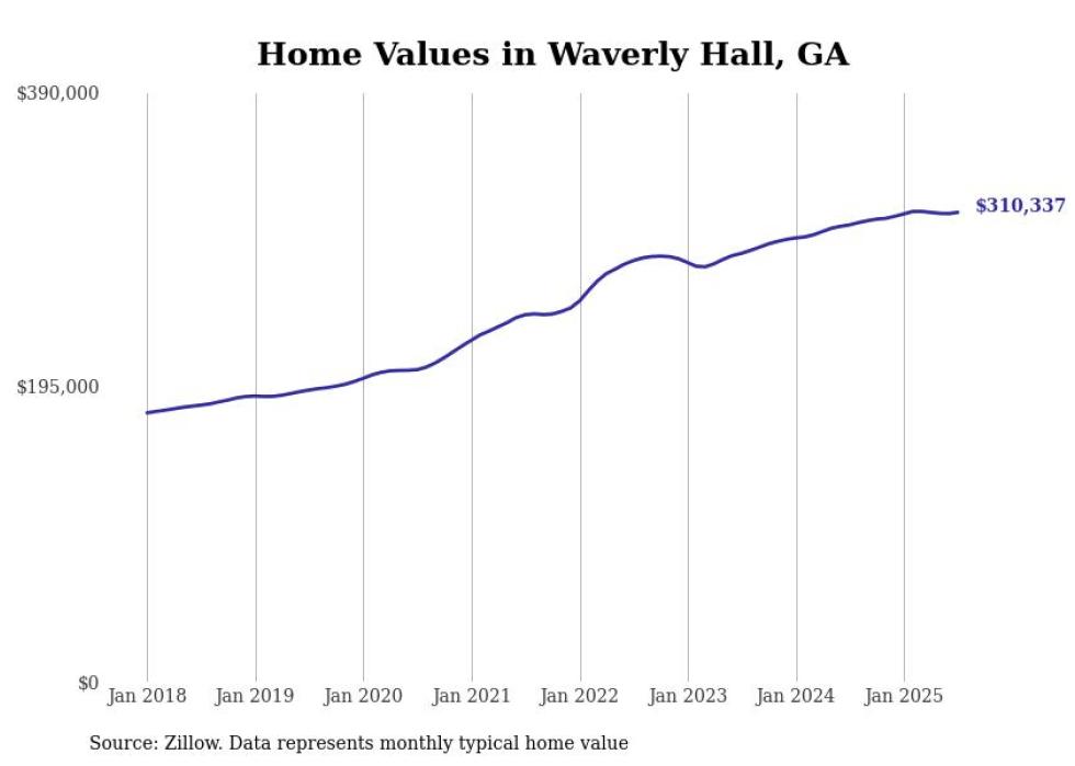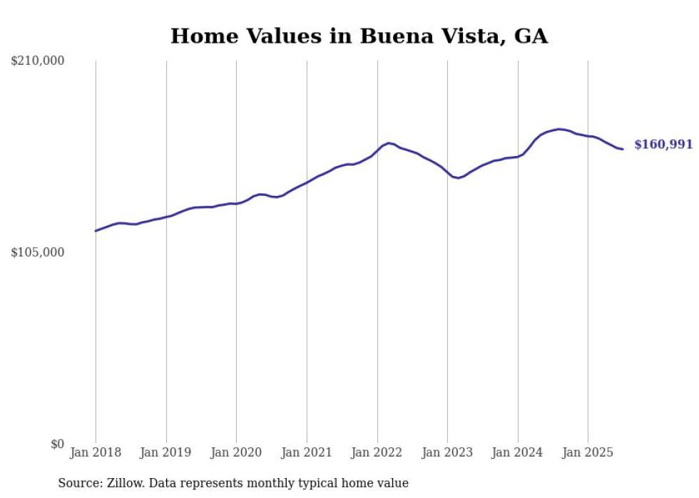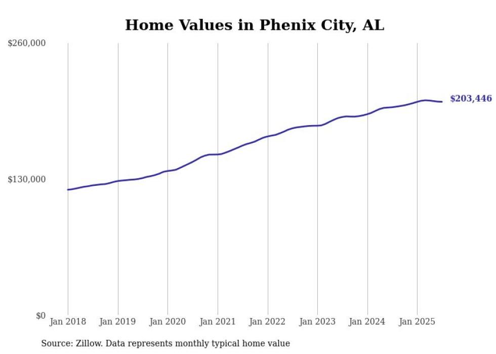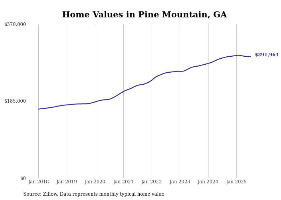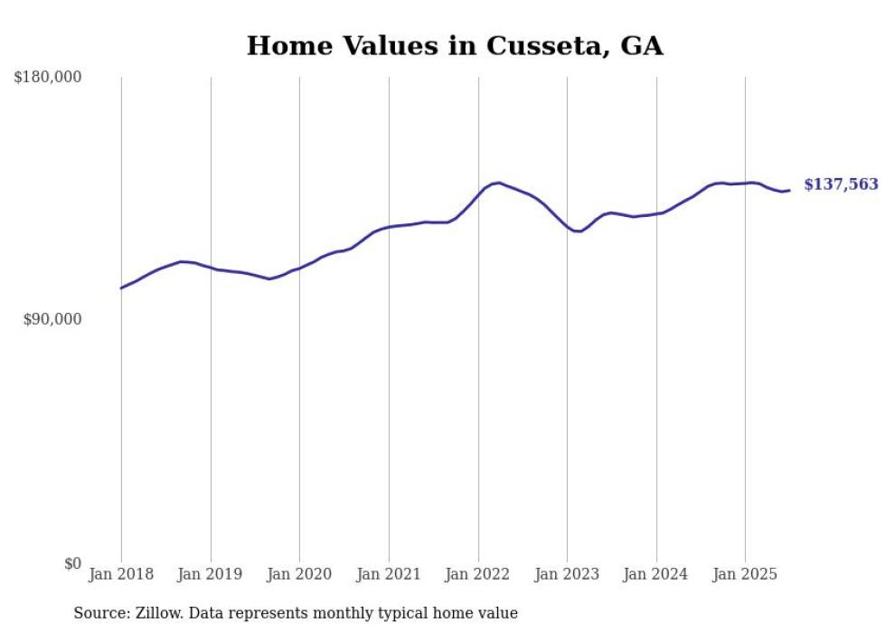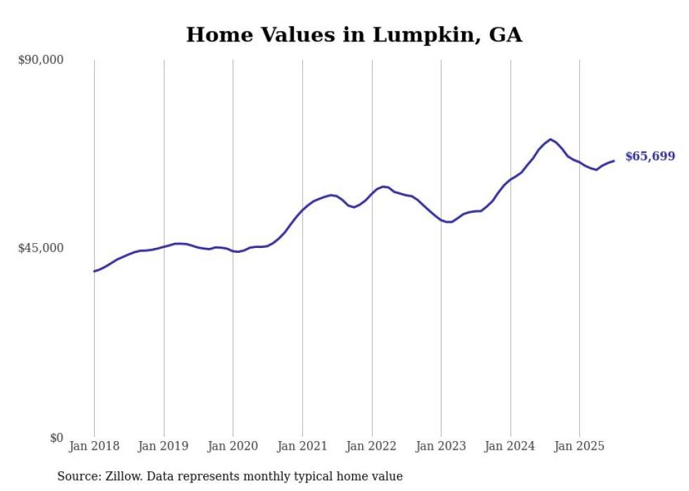 Stacker compiled a list of cities with the most expensive homes in the Columbus, Georgia metro area using data from Zillow. Charts show the monthly typical home value since January 2018. All 23 cities and towns with data available were included in the list.