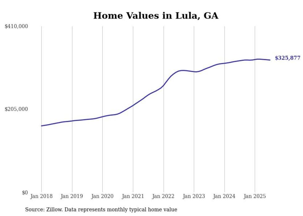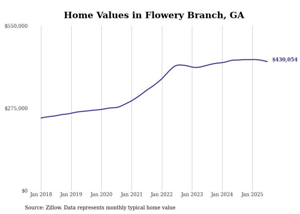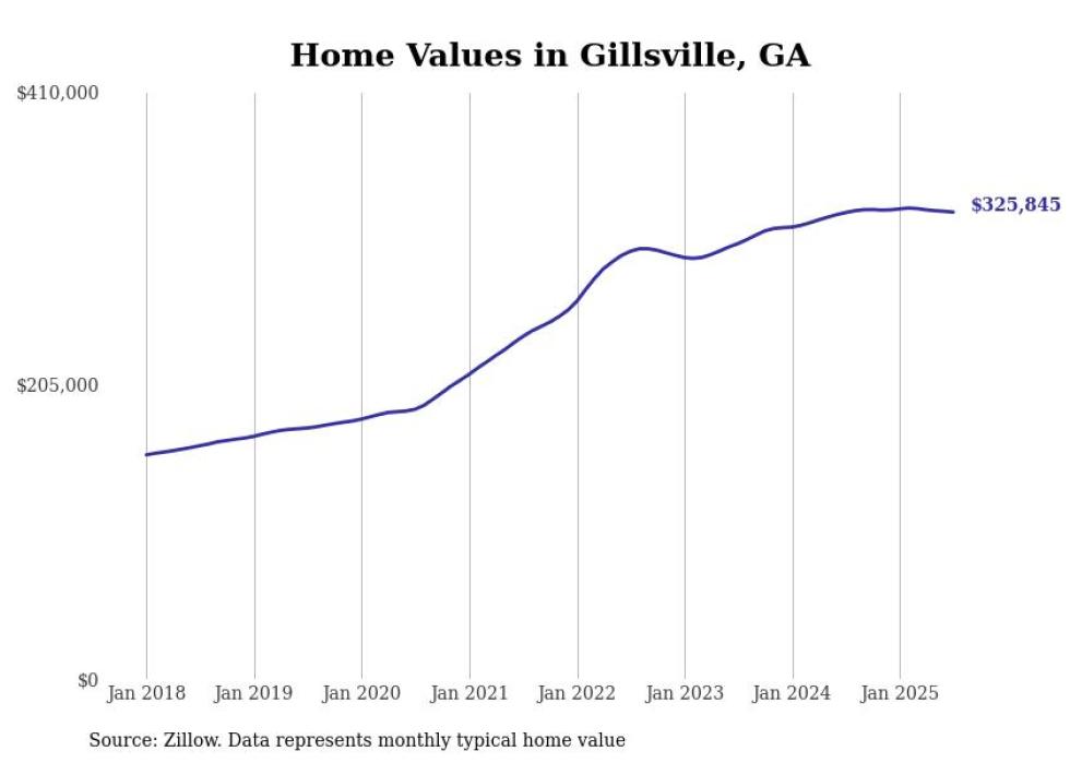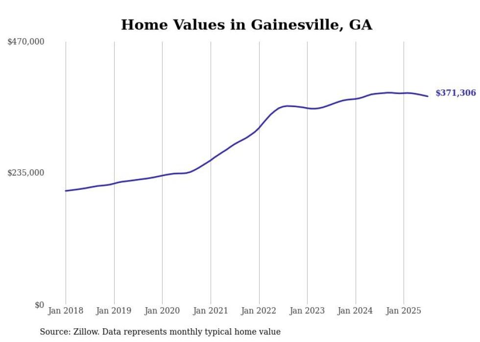 Stacker compiled a list of cities with the most expensive homes in the Gainesville, Georgia metro area using data from Zillow. Charts show the monthly typical home value since January 2018. All 7 cities and towns with data available were included in the list.