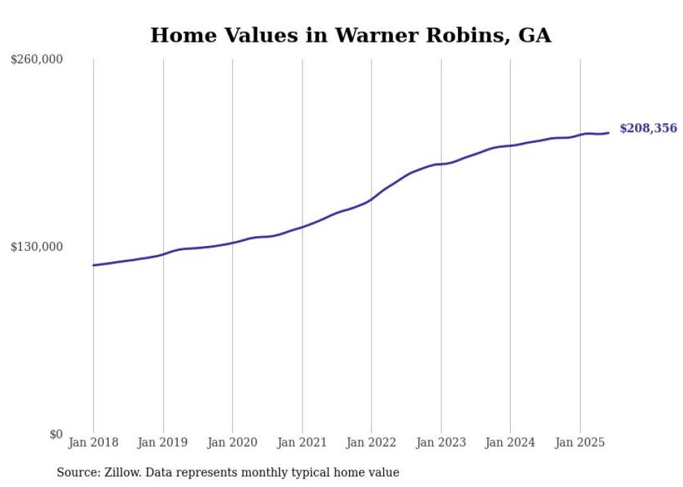 Stacker compiled a list of cities with the most expensive homes in the Warner Robins, GA metro area using data from Zillow. Charts show the monthly typical home value since January 2018.