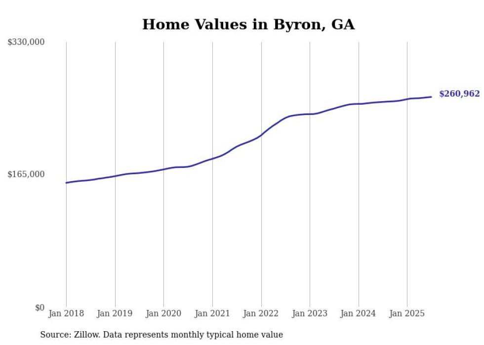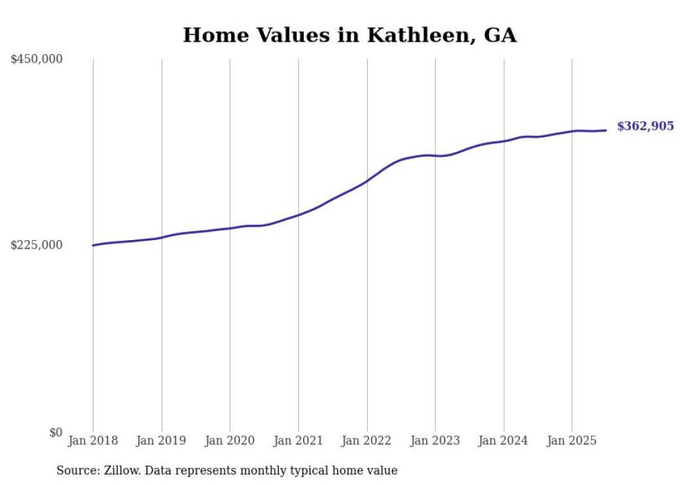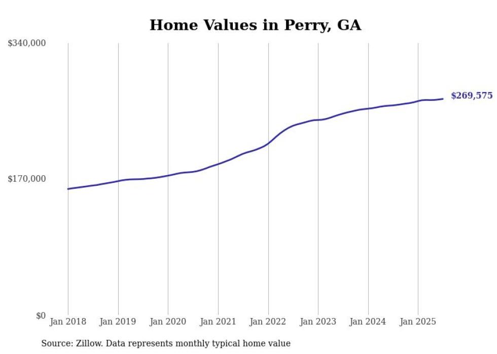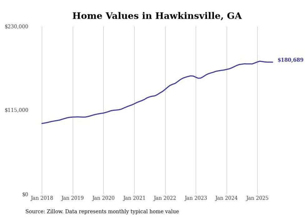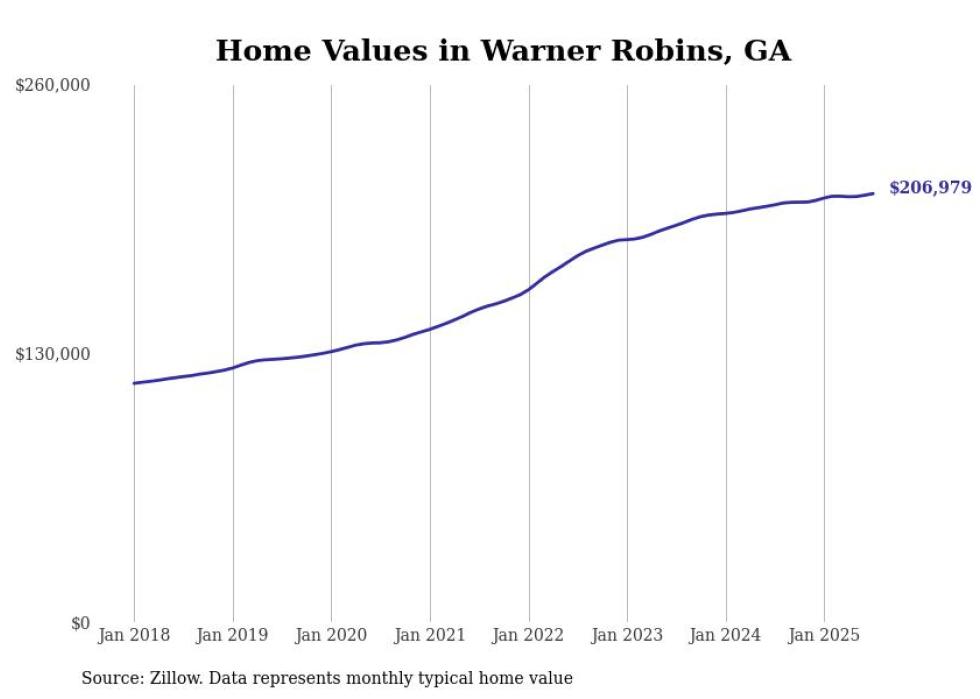 Stacker compiled a list of cities with the most expensive homes in the Warner Robins metro area using data from Zillow. Charts show the monthly typical home value since January 2018. All 9 cities and towns with data available were included in the list.