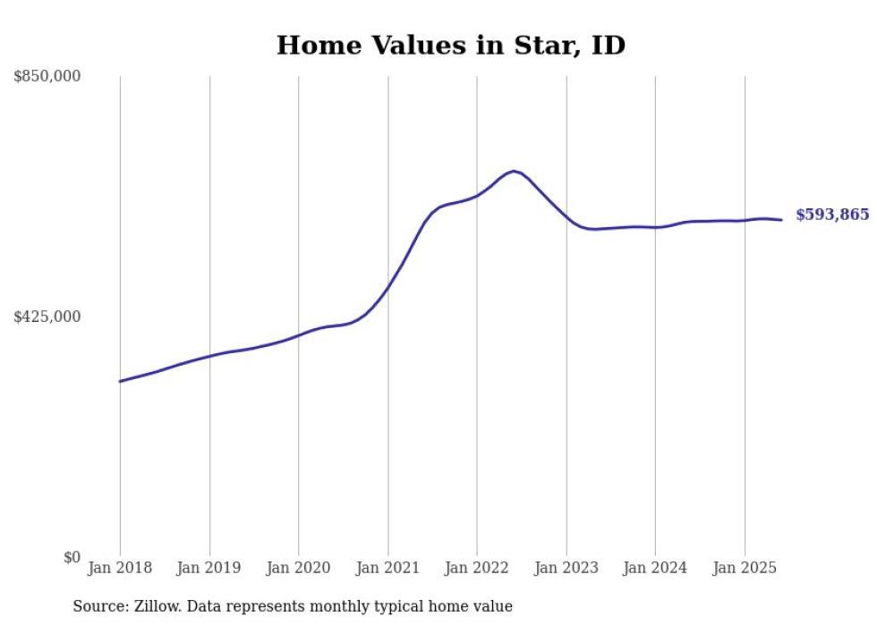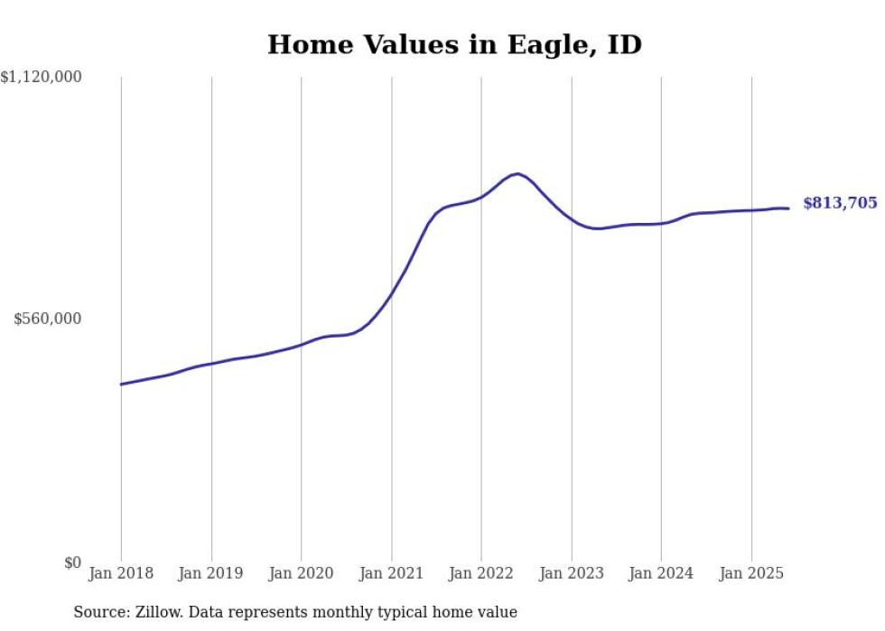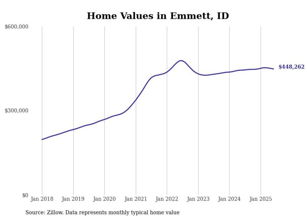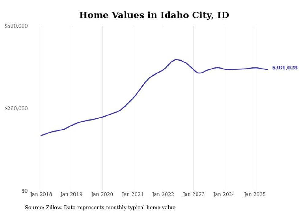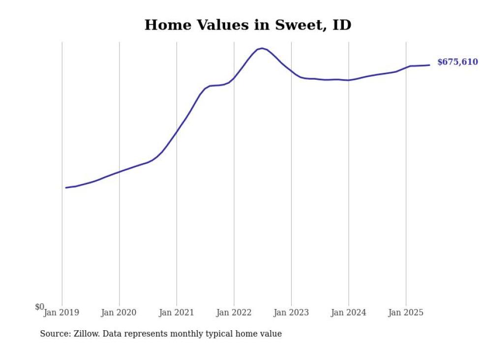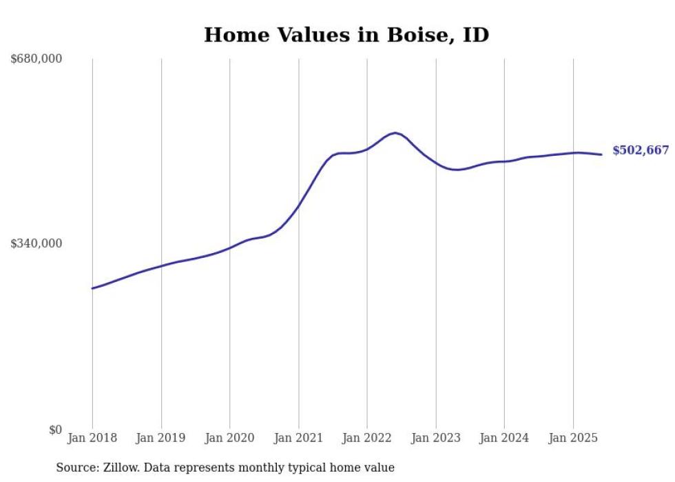Stacker compiled a list of cities with the most expensive homes in the Boise City, ID metro area using data from Zillow. Charts show the monthly typical home value since January 2018.