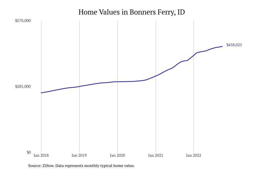 Stacker compiled a list of places with the fastest growing home prices in Boundary County, ID using data from Zillow. Places are ranked by the dollar change Zillow Home Values Index for all homes from October 2021 to October 2022. The ZVHI represents a seasonally adjusted price for the middle market for all homes. All 3 cities and towns with data available were included in the list. Charts for each place show the monthly typical home value since January 2018.