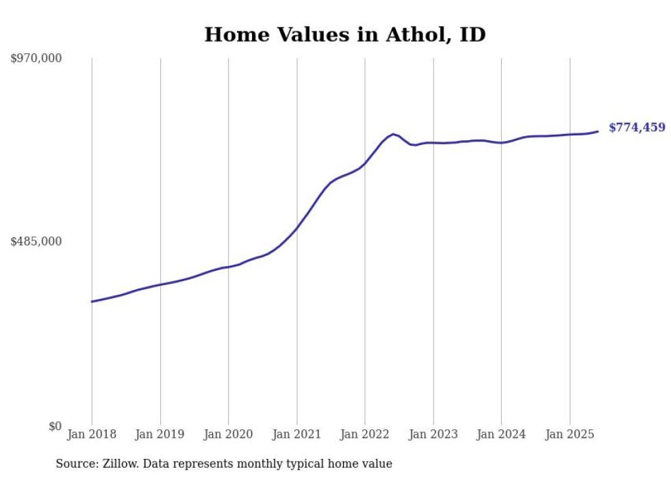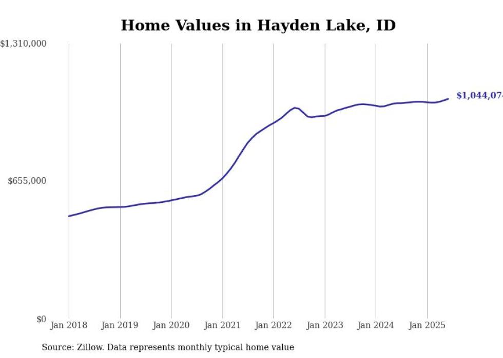 Stacker compiled a list of cities with the most expensive homes in the Coeur d'Alene, ID metro area using data from Zillow. Charts show the monthly typical home value since January 2018.