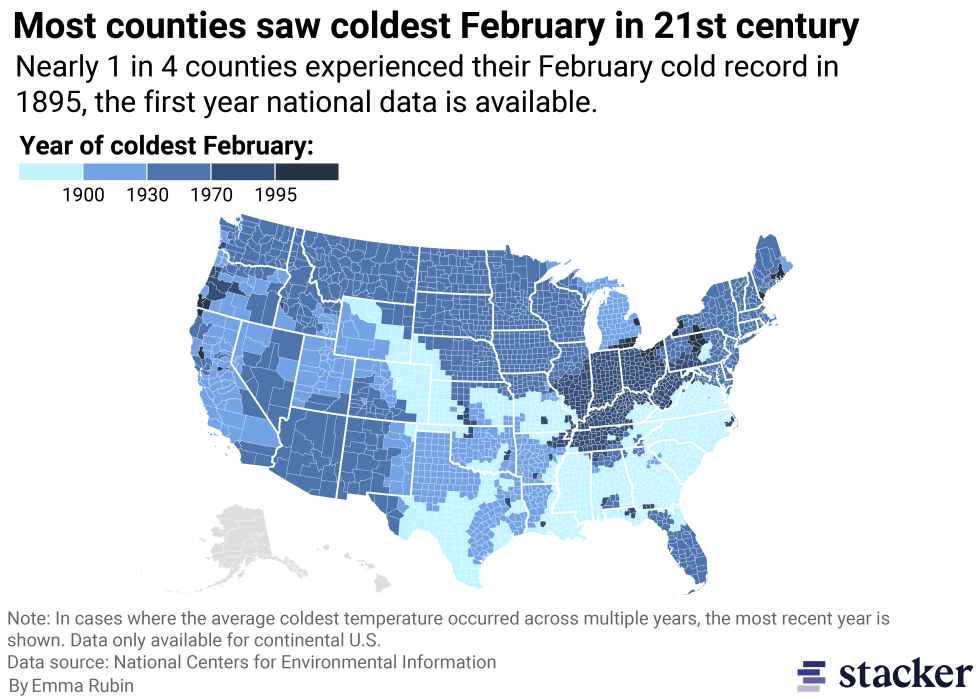 Across much of the country, February is often the coldest month. The average temperature for the month from 1901-2000 in the contiguous U.S. was 33.82 degrees Fahrenheit. In 2023, it was above average, reaching 36.45 F.
