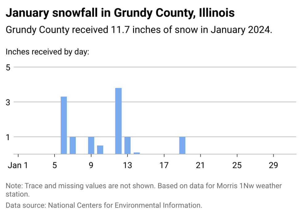 The snowfall total is based on the weather station in Grundy County, Illinois that recorded the most snow and also had no more than nine missing days of data. Since this data is only for one weather station, it may not reflect the snowfall patterns across the entire county. On some days, stations report trace snowfall, which is included as a data point but not as part of the overall total for the month. Supplementary data on the average temperature in January 2024 is also included.