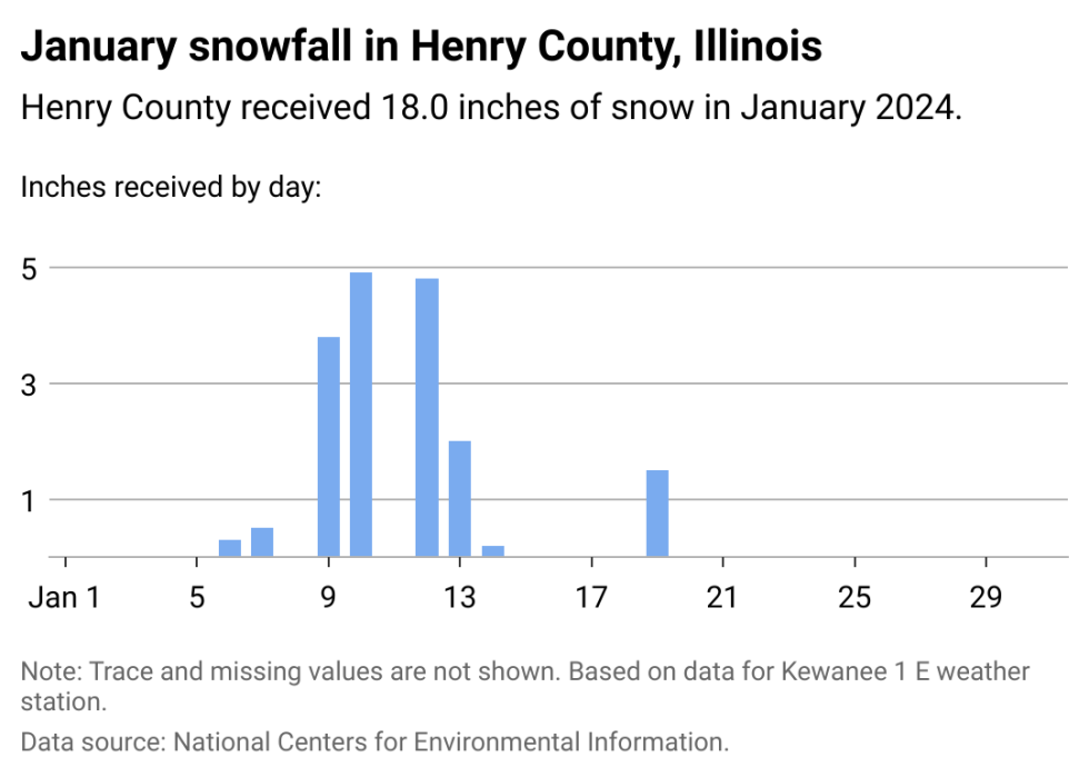 To recap January's weather ahead of what's predicted to be a less cold February, Stacker used data from the National Centers for Environmental Information to break down how much snow Henry County, Illinois received in January, highlighting the snowiest day of the month and how this year's January temperatures compare to years past.