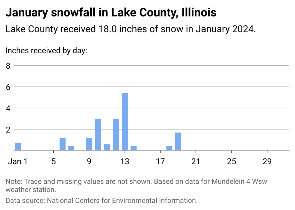 The snowfall total is based on the weather station in Lake County, Illinois that recorded the most snow and also had no more than nine missing days of data. Since this data is only for one weather station, it may not reflect the snowfall patterns across the entire county. On some days, stations report trace snowfall, which is included as a data point but not as part of the overall total for the month. Supplementary data on the average temperature in January 2024 is also included.