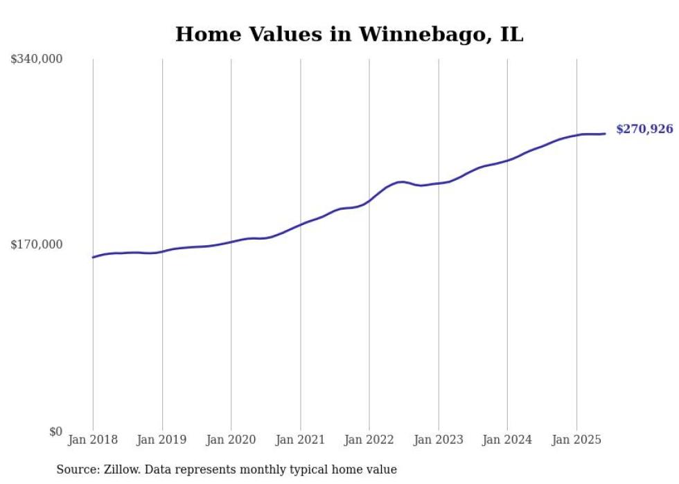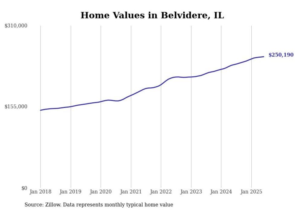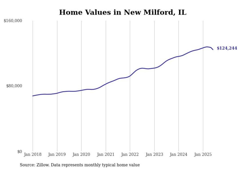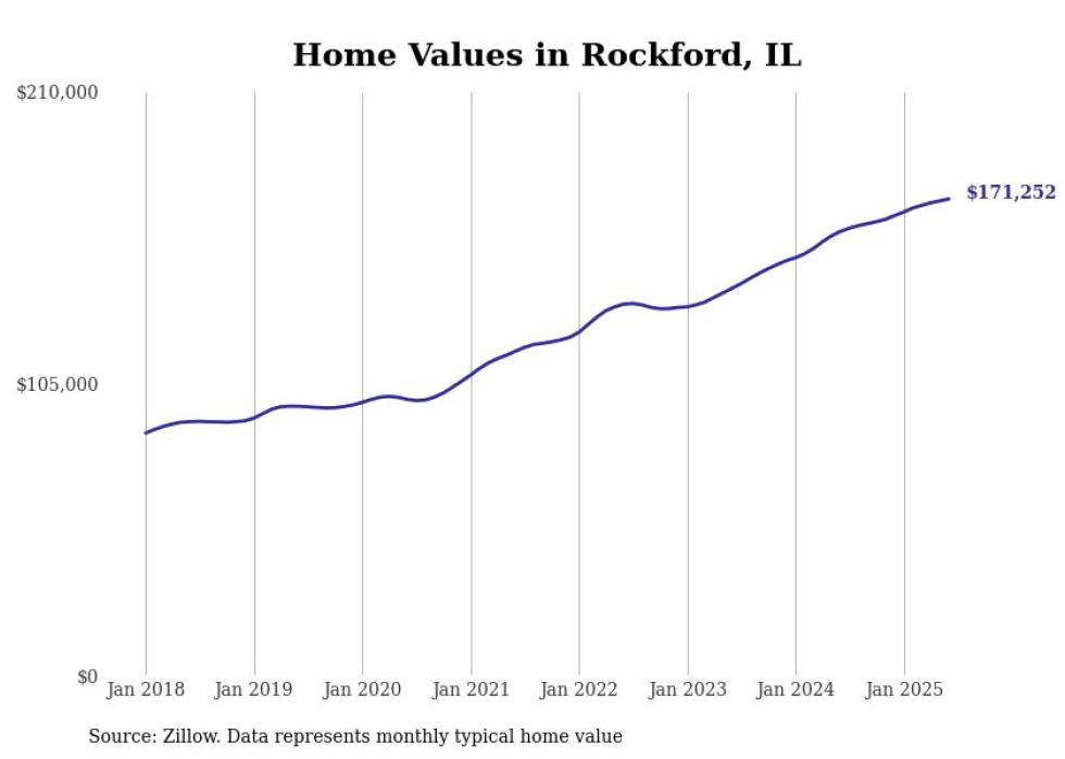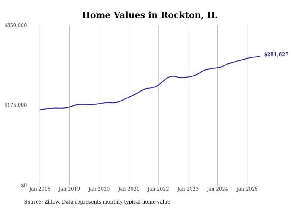 Stacker compiled a list of cities with the most expensive homes in the Rockford, IL metro area using data from Zillow. Charts show the monthly typical home value since January 2018.