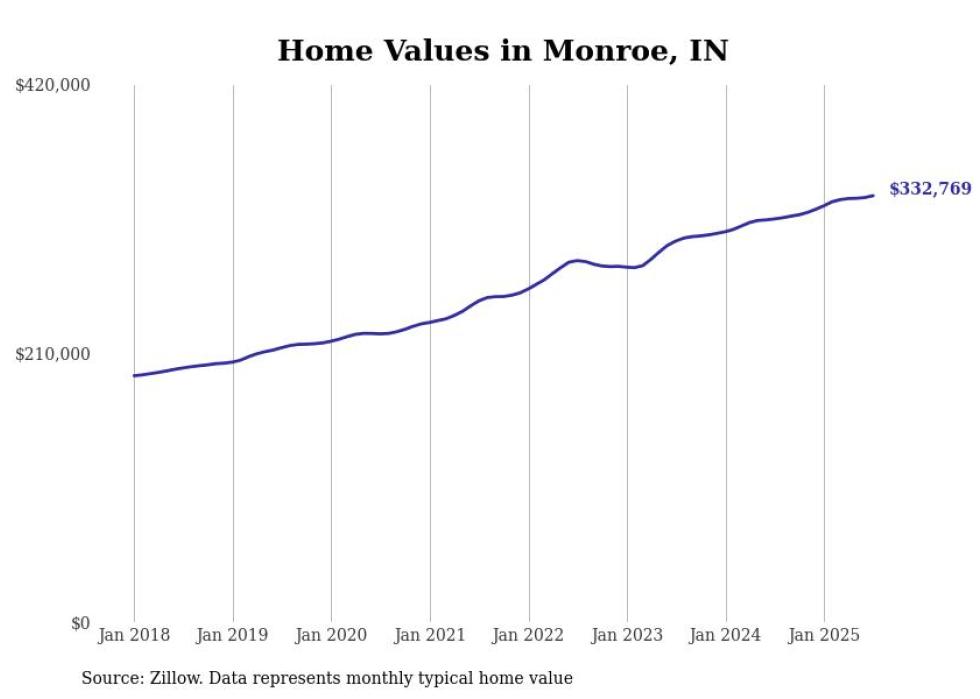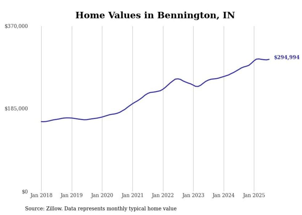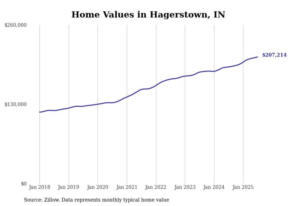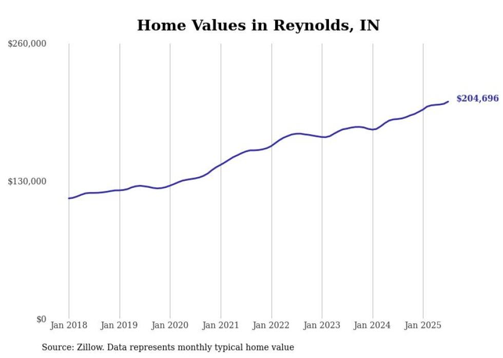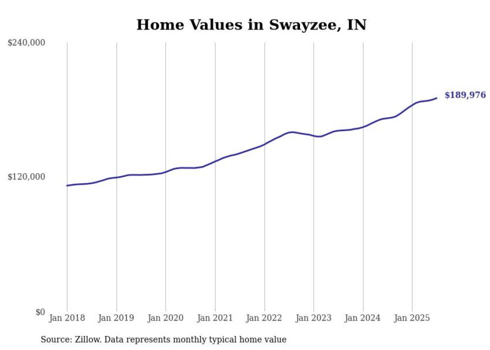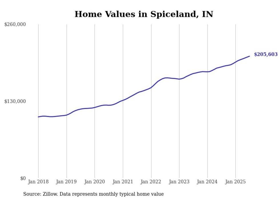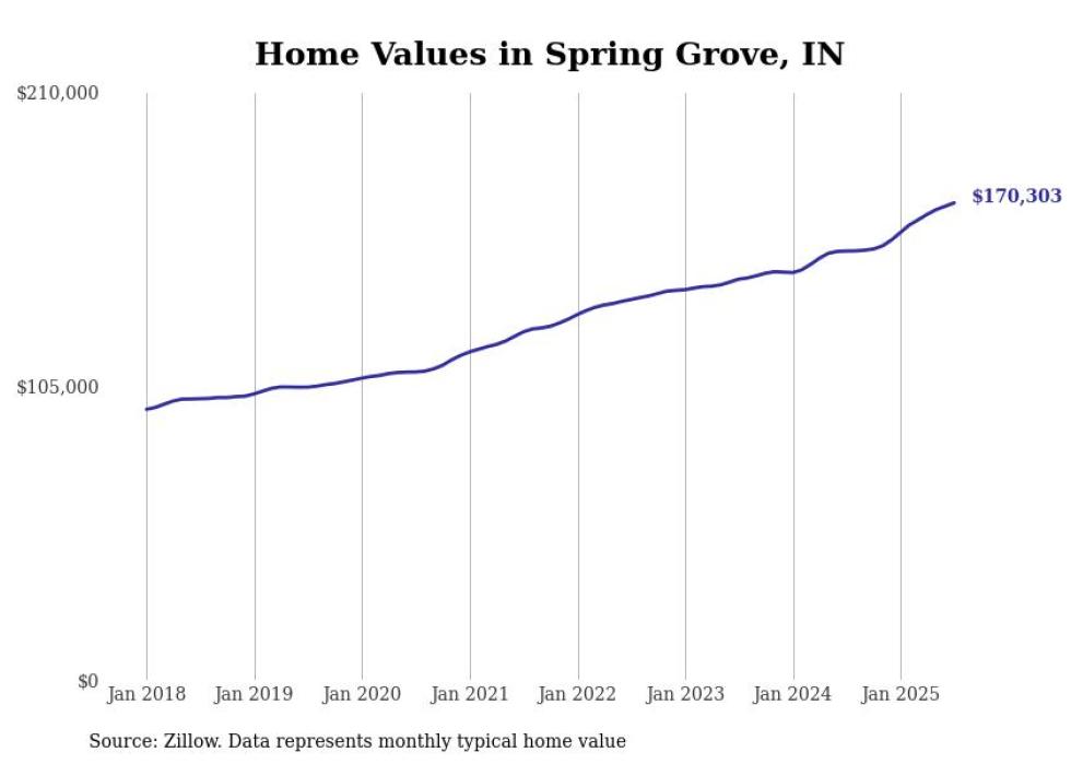 Stacker compiled a list of cities with the fastest-growing home prices in Indiana using data from Zillow. Cities are ranked by the dollar change in the Zillow Home Values Index for all homes from the 12 months ending July 2025. The charts in this story were created automatically using Matplotlib. Data was available for 50 cities and towns in Indiana.