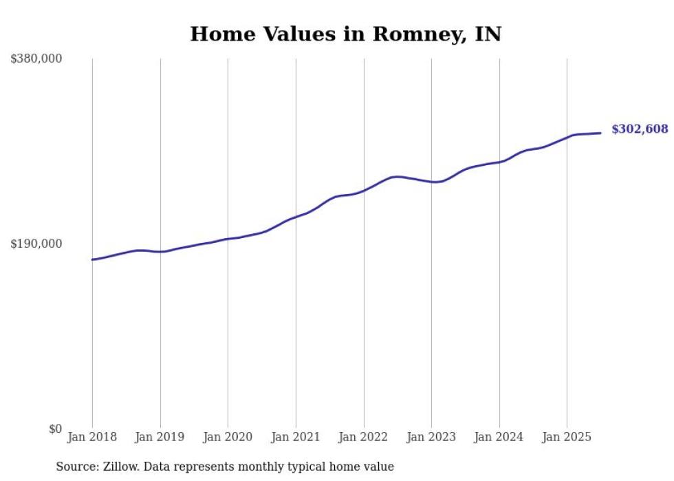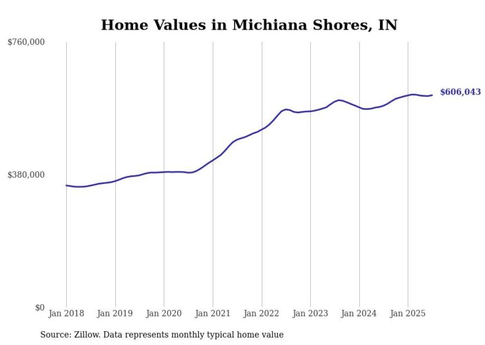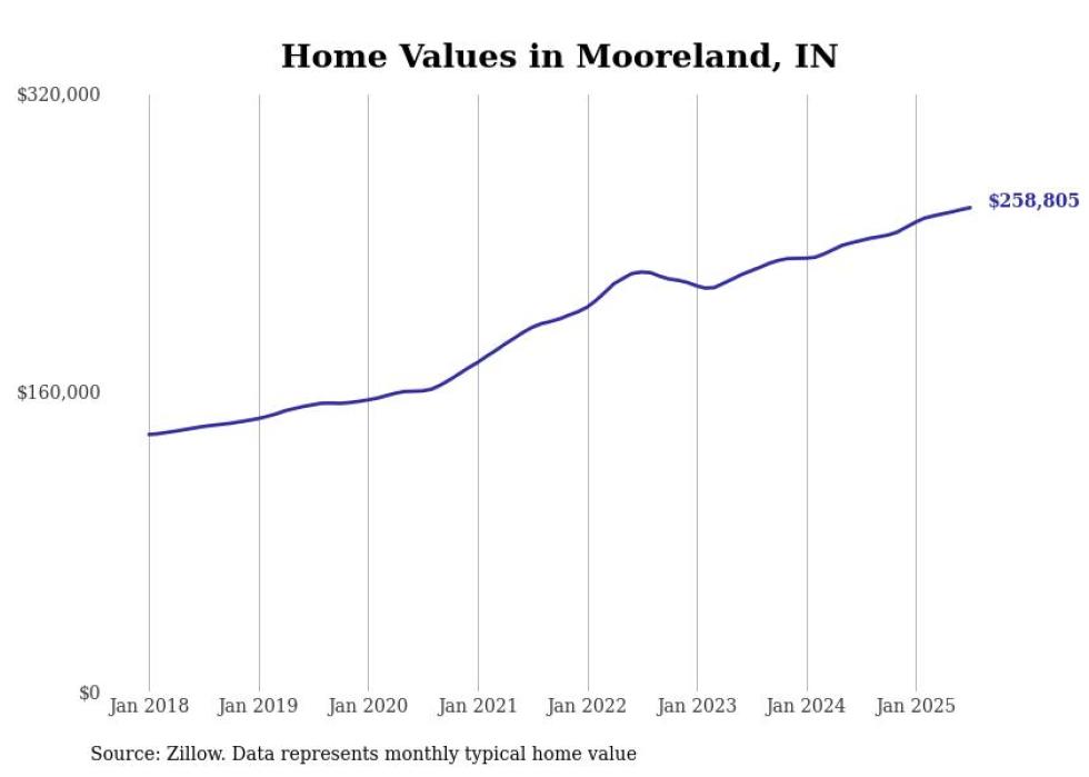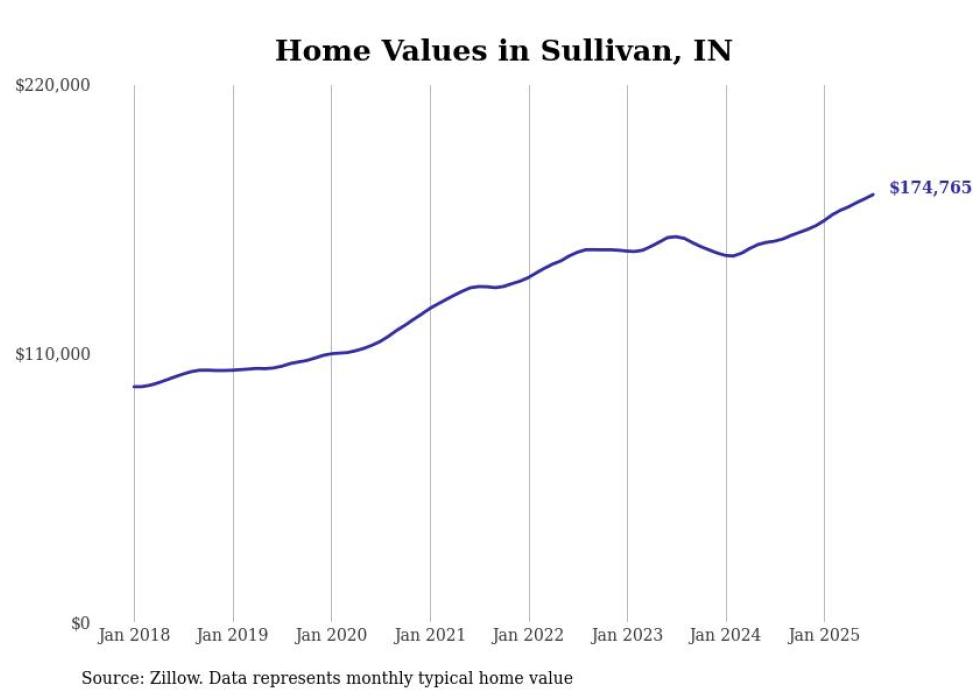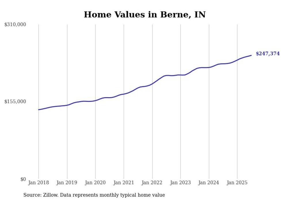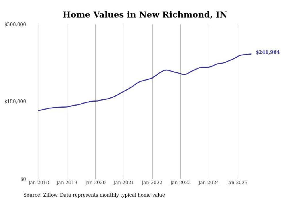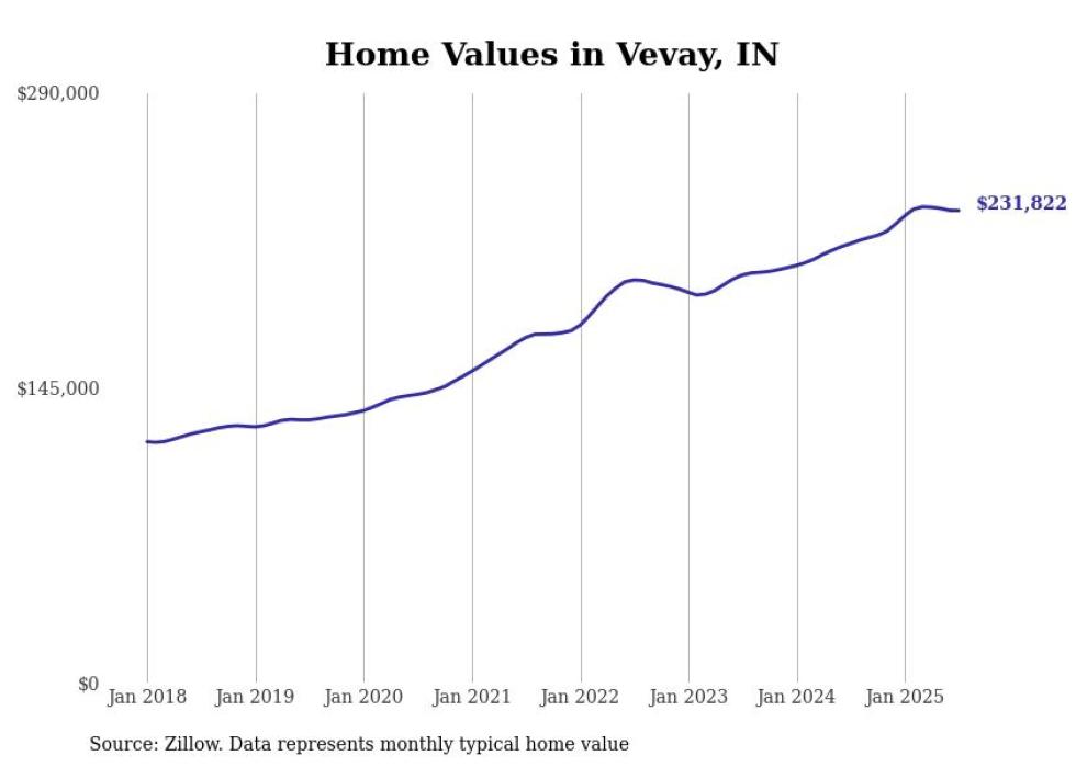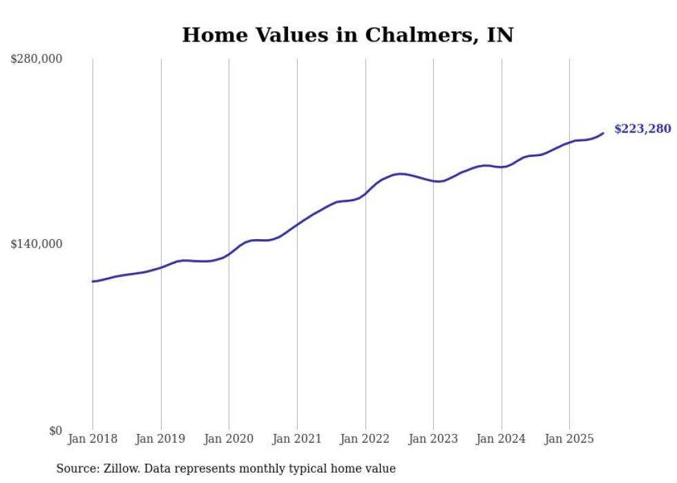Stacker compiled a list of cities with the fastest-growing home prices in Indiana using data from Zillow. Cities are ranked by the dollar change in the Zillow Home Values Index for all homes from the 12 months ending July 2025. The charts in this story were created automatically using Matplotlib. Data was available for 50 cities and towns in Indiana.
