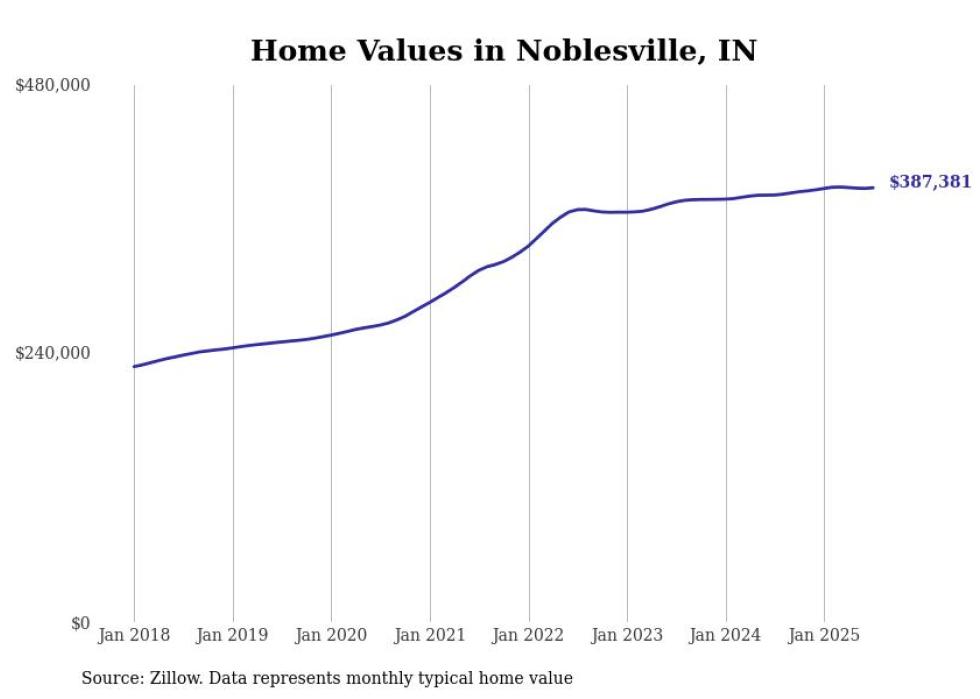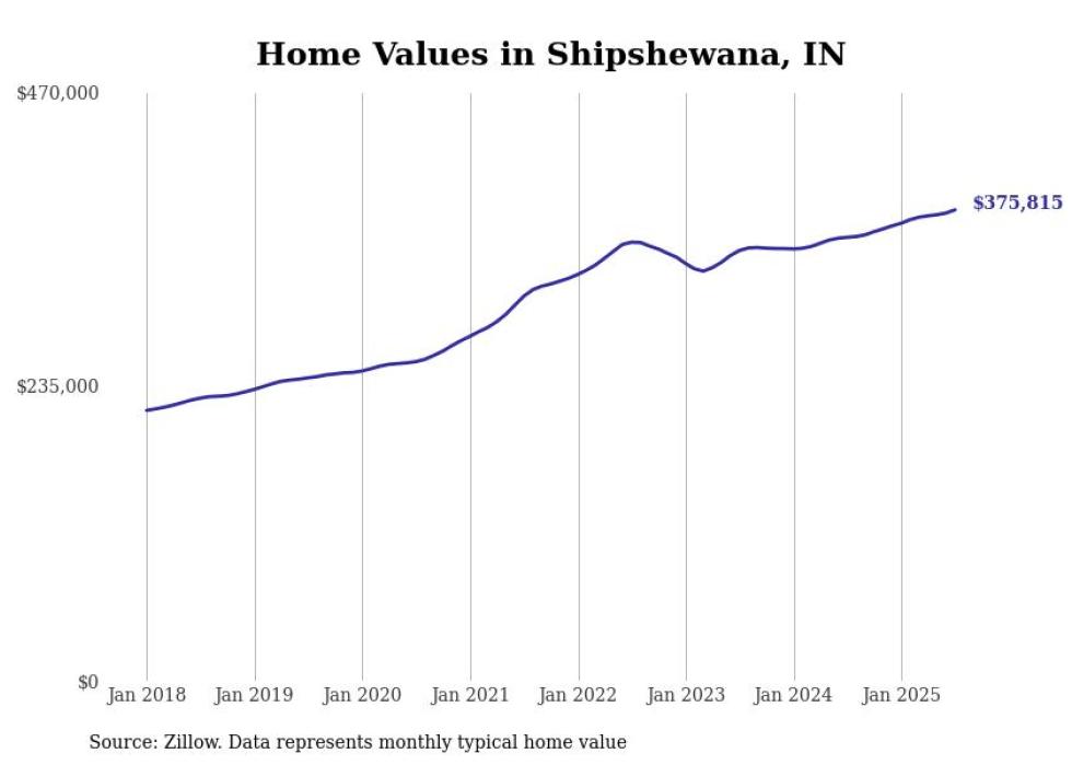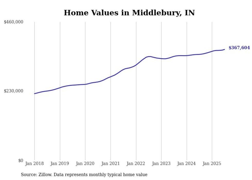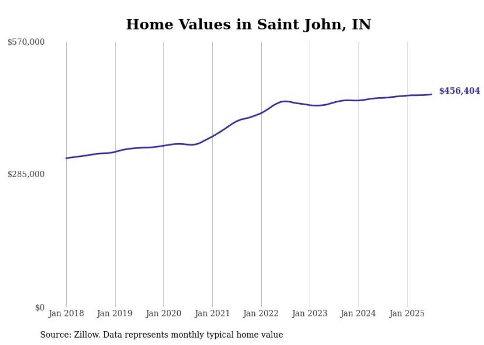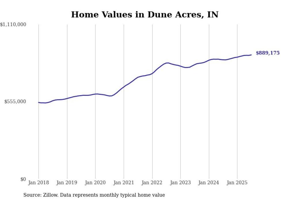 Stacker compiled a list of cities with the most expensive homes in Indiana using data from Zillow. Cities are ranked by the Zillow Home Values Index for all homes as of July 2025. The charts in this story were created automatically using Matplotlib.