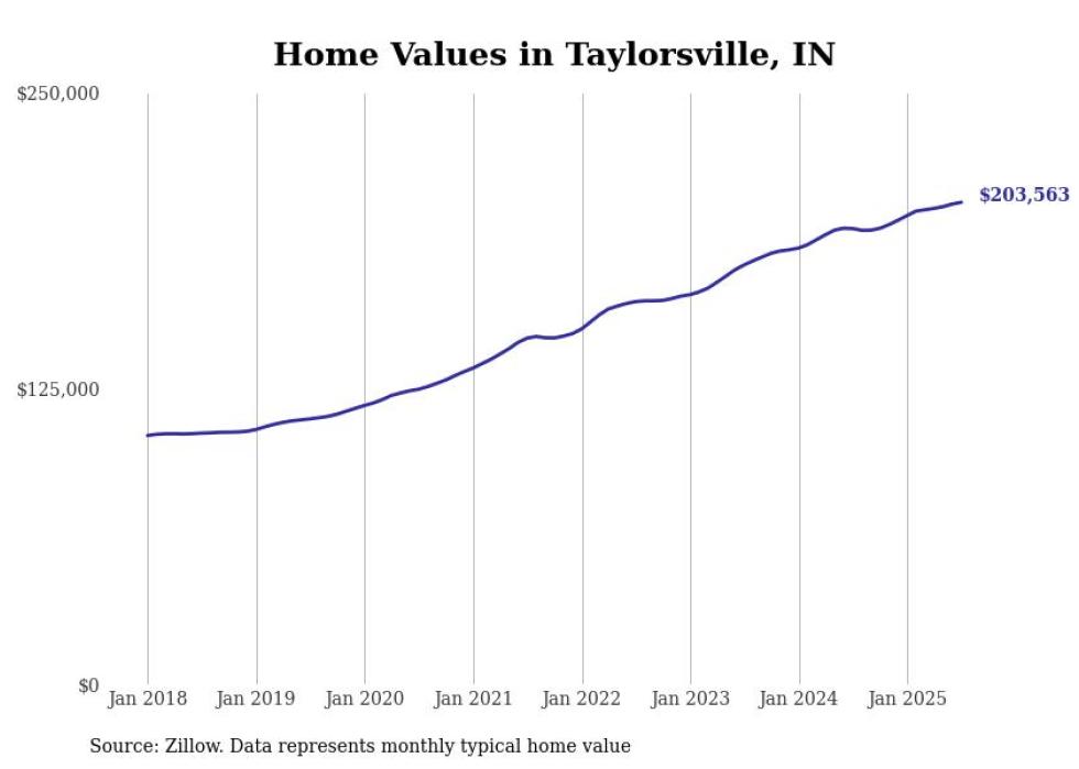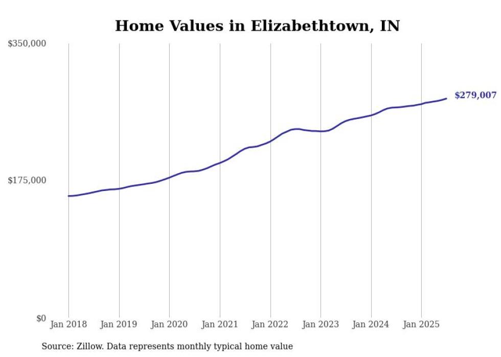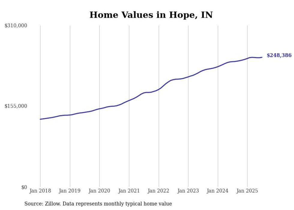 Stacker compiled a list of cities with the most expensive homes in the Columbus, Indiana metro area using data from Zillow. Charts show the monthly typical home value since January 2018. All 5 cities and towns with data available were included in the list.