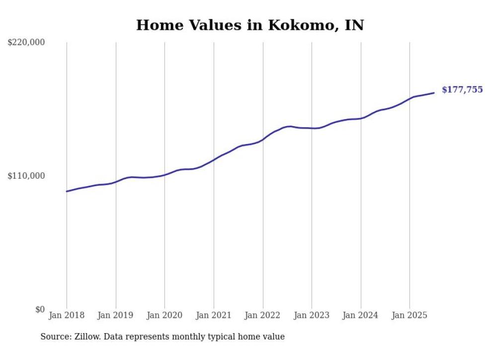 Stacker compiled a list of cities with the most expensive homes in the Kokomo metro area using data from Zillow. Charts show the monthly typical home value since January 2018. All 3 cities and towns with data available were included in the list.